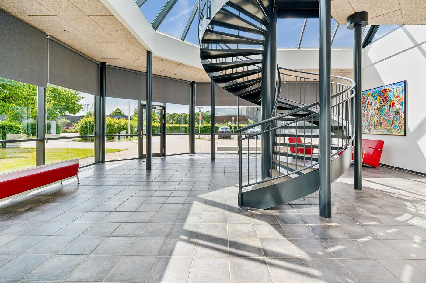 Du kommer ind i et flot lyst receptionsområde med spindeltrappe til 1.salen.