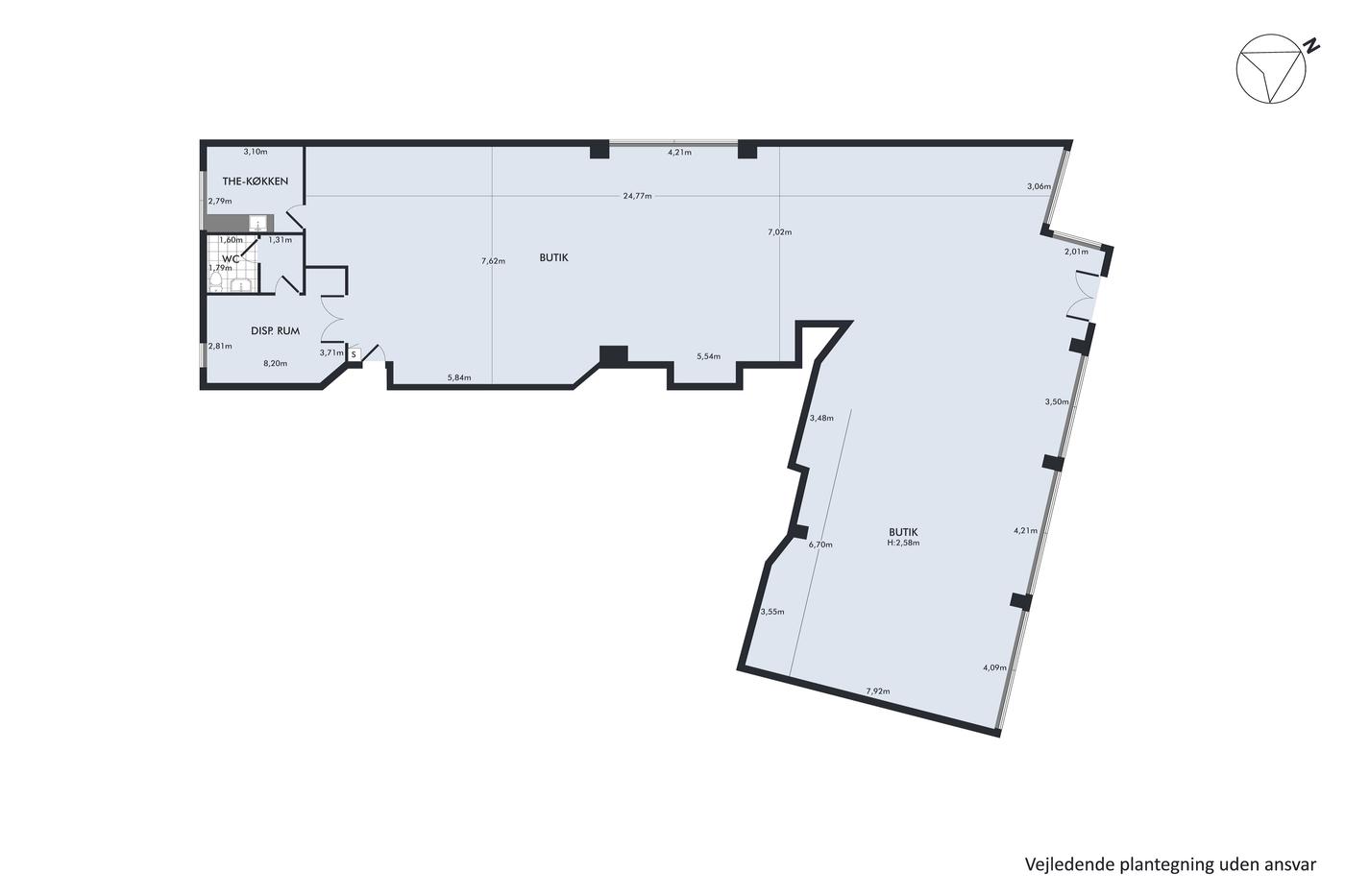 Lejemålet på 321 m² har senest været anvendt til minimarked, og er derfor indretter med klinkegulv i det store butikslokale, som fremstår lyst og indbydende med de store glaspartier og cirka 3 meter til betonloft. I lejemålets vinkel kan der indrettes lagerlokale med mulighed for vareindlevering fra baggård. Bagerst i lokalet findes også passende mandskabsfaciliteter. I butikkens hjørne er der dobbeltdør med overdækket plads til udstilling af gadevarer.