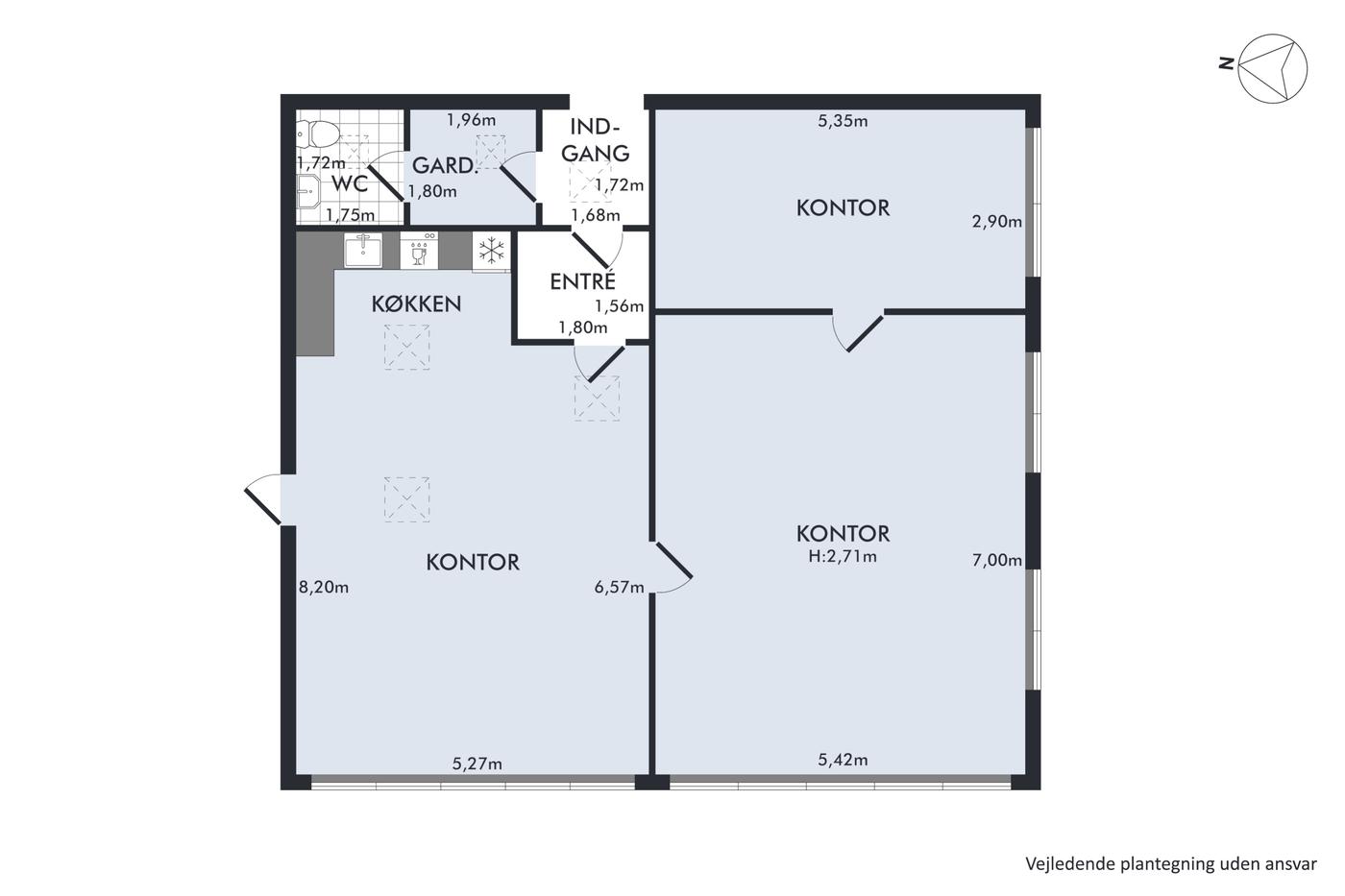 Planløsningen er let at ændre, hvilket gør det enkelt at tilpasse lejemålet til netop jeres behov, uanset om I prioriterer åbne miljøer, flere lukkede kontorer eller samarbejdszoner.