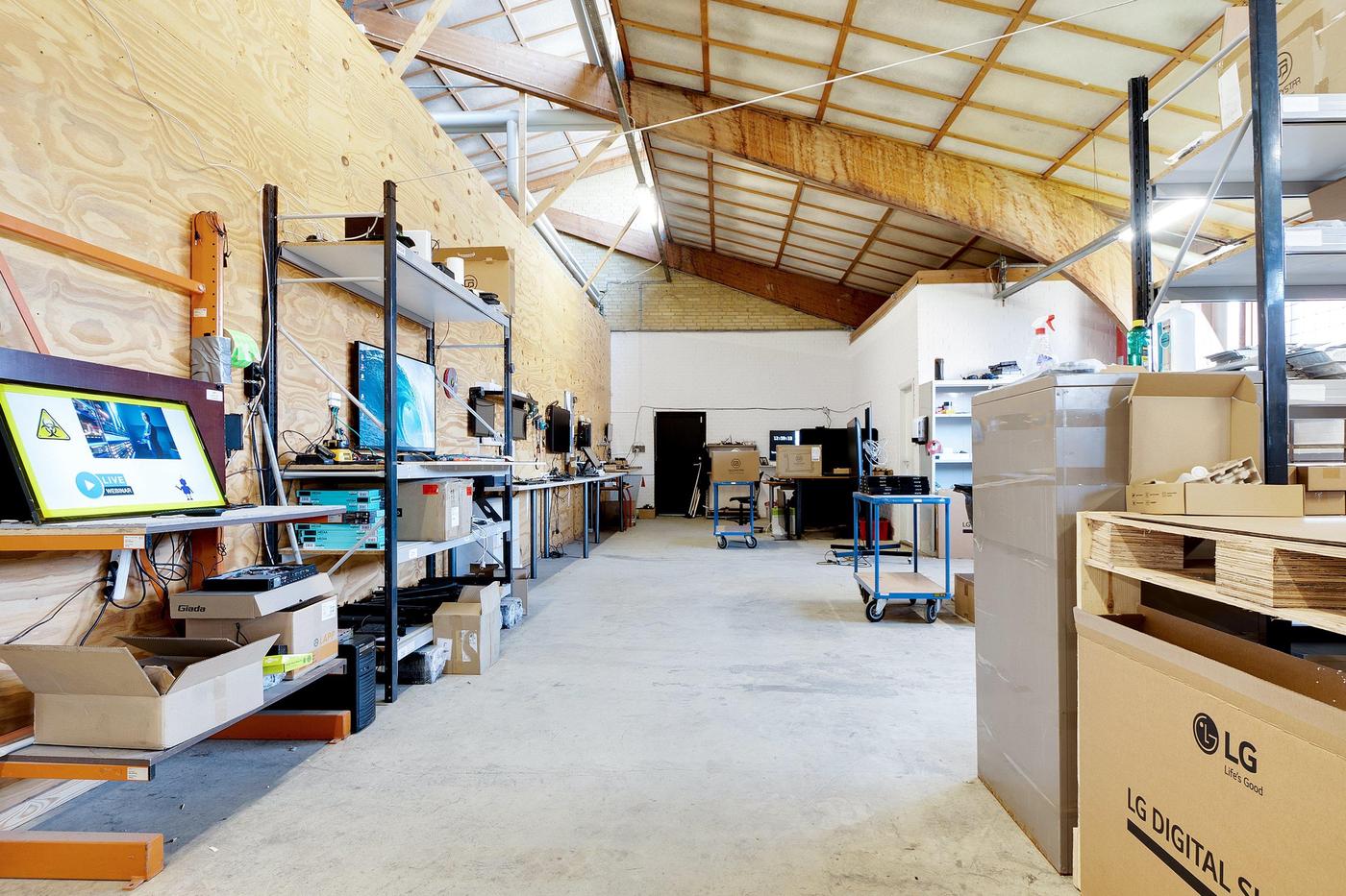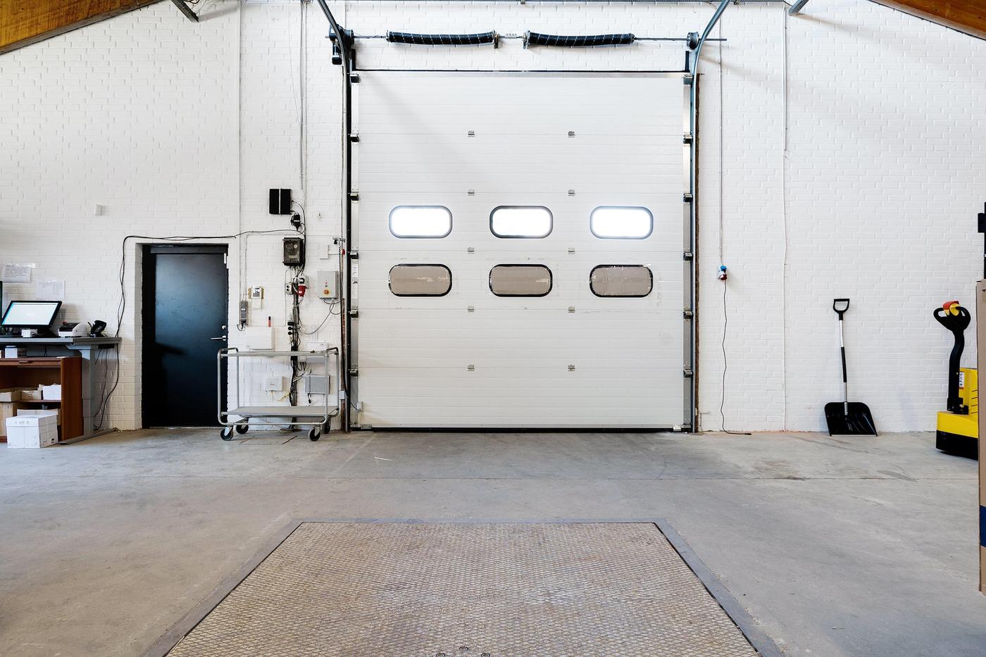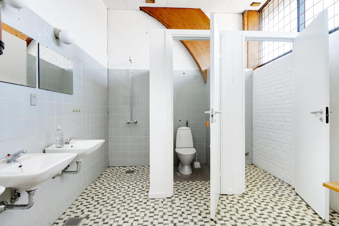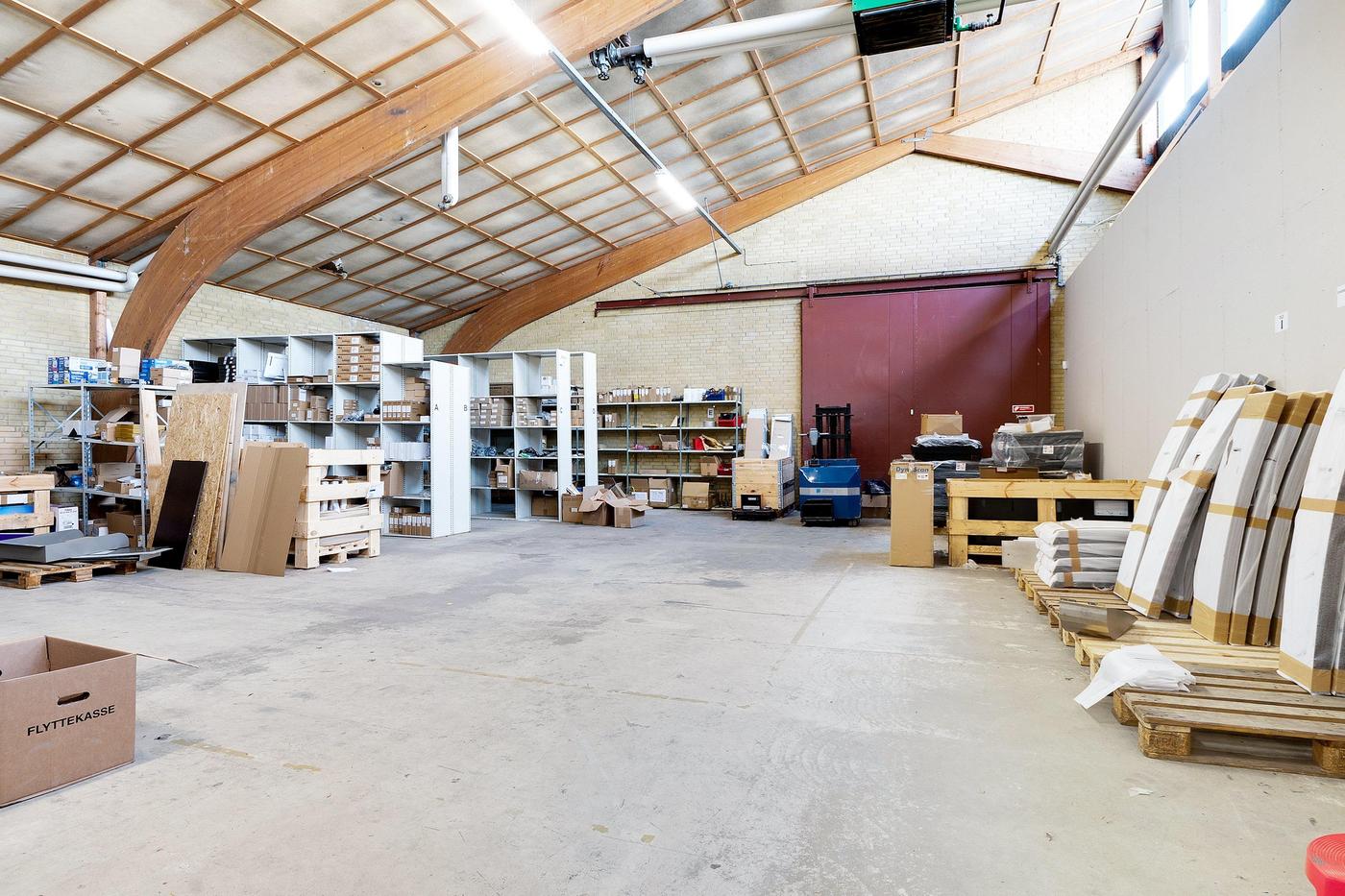 En stor el-ledhejseport i gavlen giver niveaufri adgang til lejemålet. Her giver den særlige tagkonstruktion, med forskudte tagflader over limtræsspærerne, en lang række loftsvinduer med ovenlys, ligesom et vinduesbånd i hallens vestvendte side også bidrager til masser af dagslys. Lofterne giver desuden en behagelig akustik i hallen, hvor der også er installeret trykluft. Væggene er malet hvide indenfor de sidste år, så alt fremstår lyst og præsentabelt.