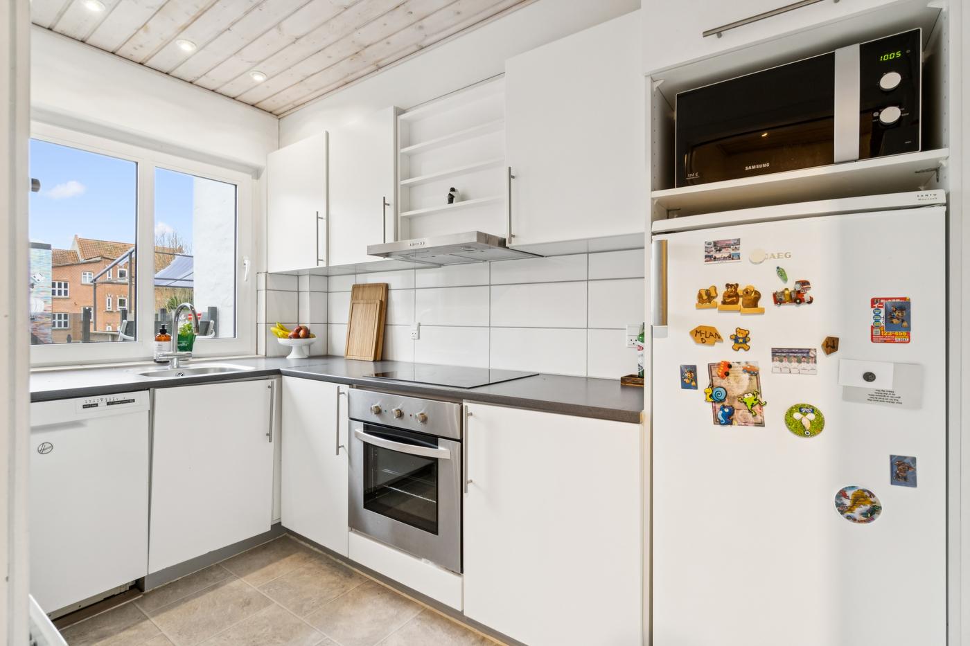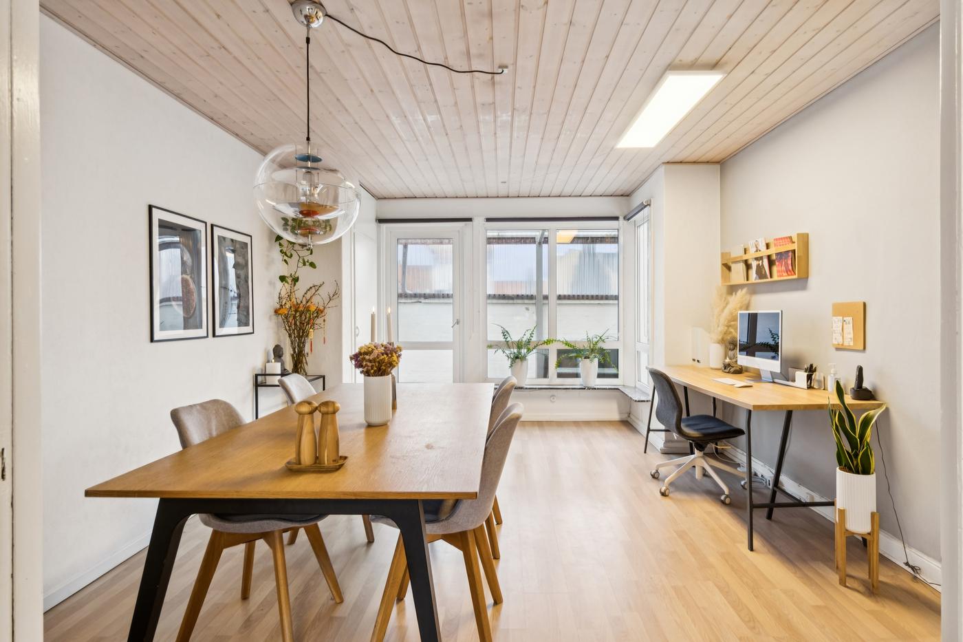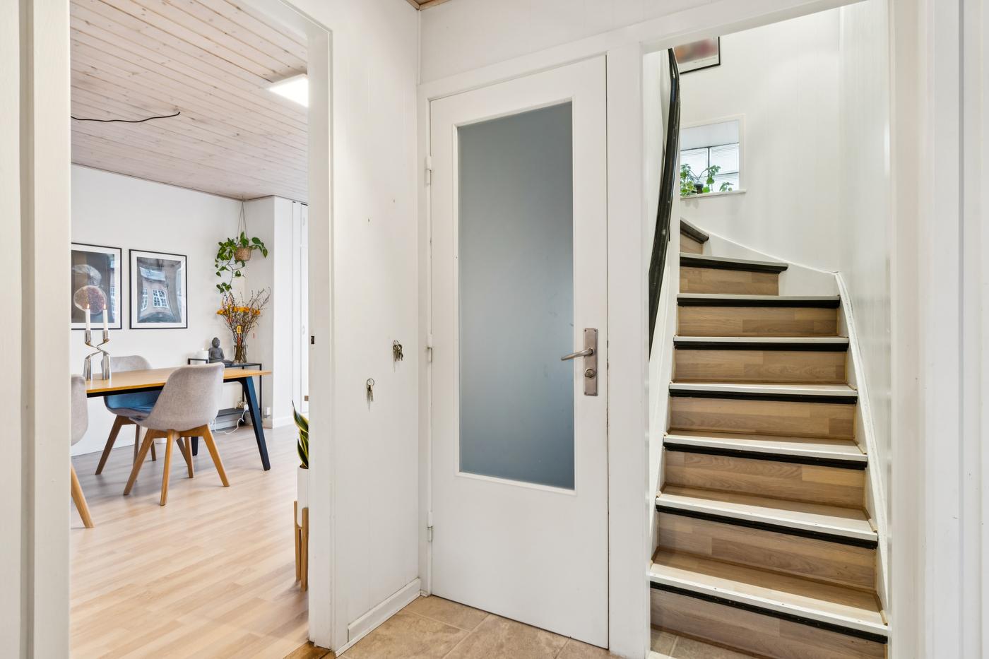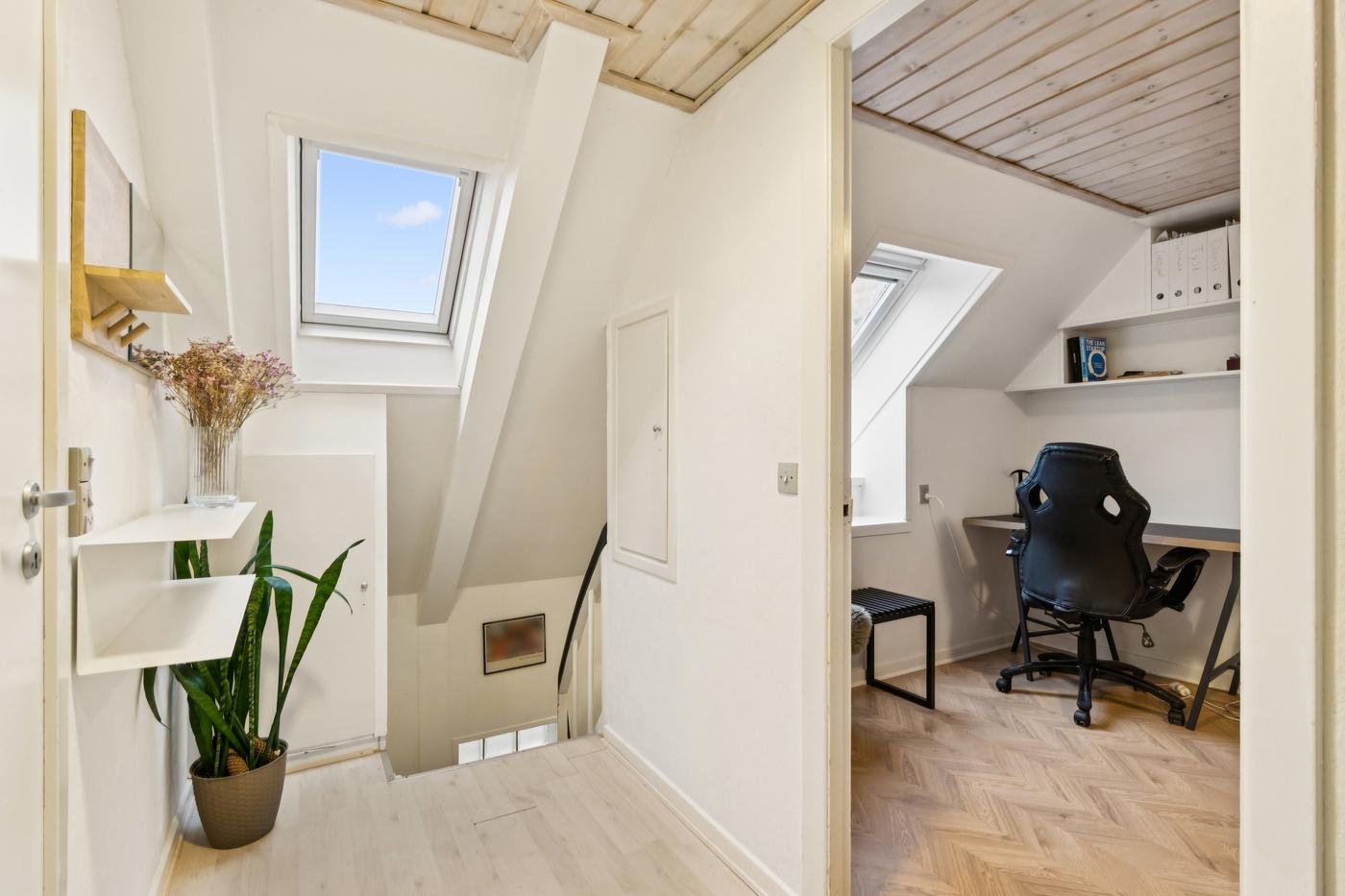 Boligdelen strækker sig over 1. og 2. sal og byder på en charmerende indretning med god plads. På 1. sal finder du entre, køkken, to stuer - den ene med direkte udgang til en sydvendt terrasse, hvor solen kan nydes dagen lang - samt et soveværelse. På 2. sal er der yderligere to værelser og et badeværelse, hvilket giver fleksibilitet til både familieliv og gæsteværelser.