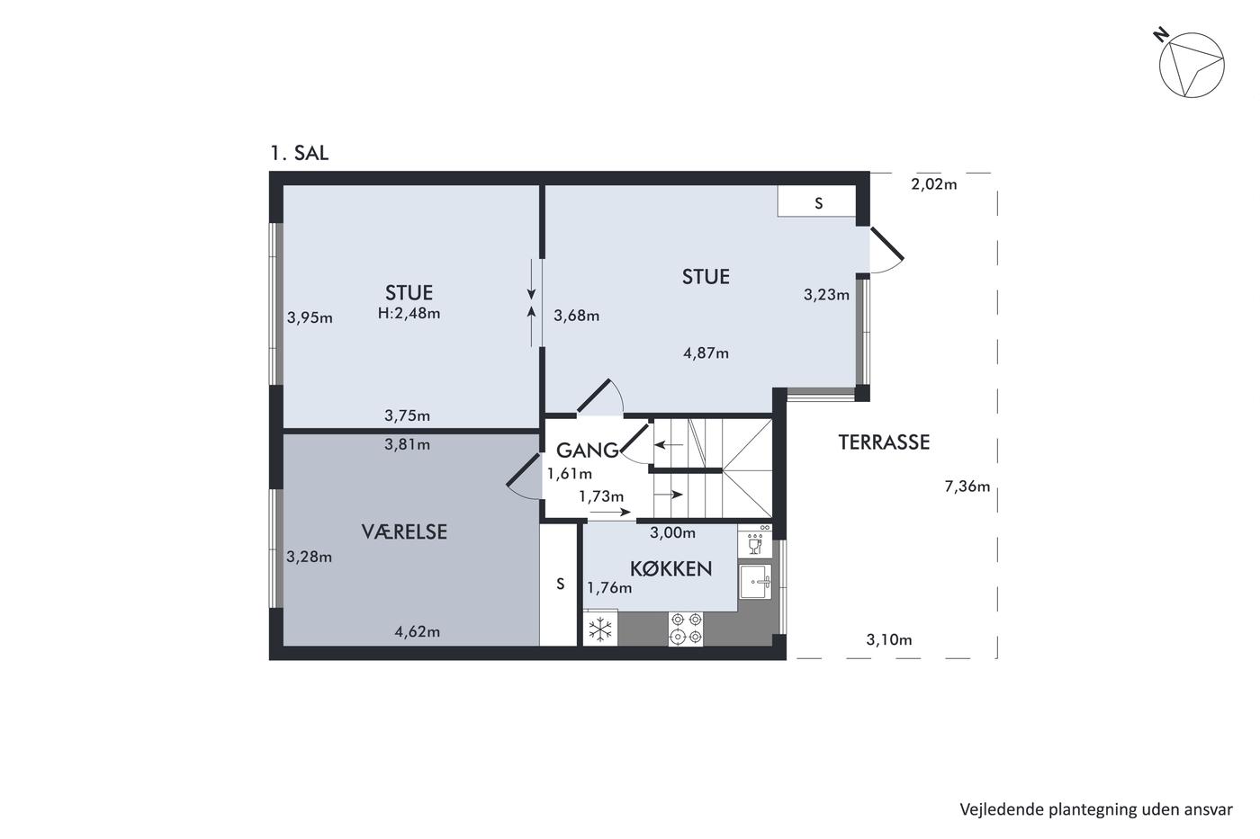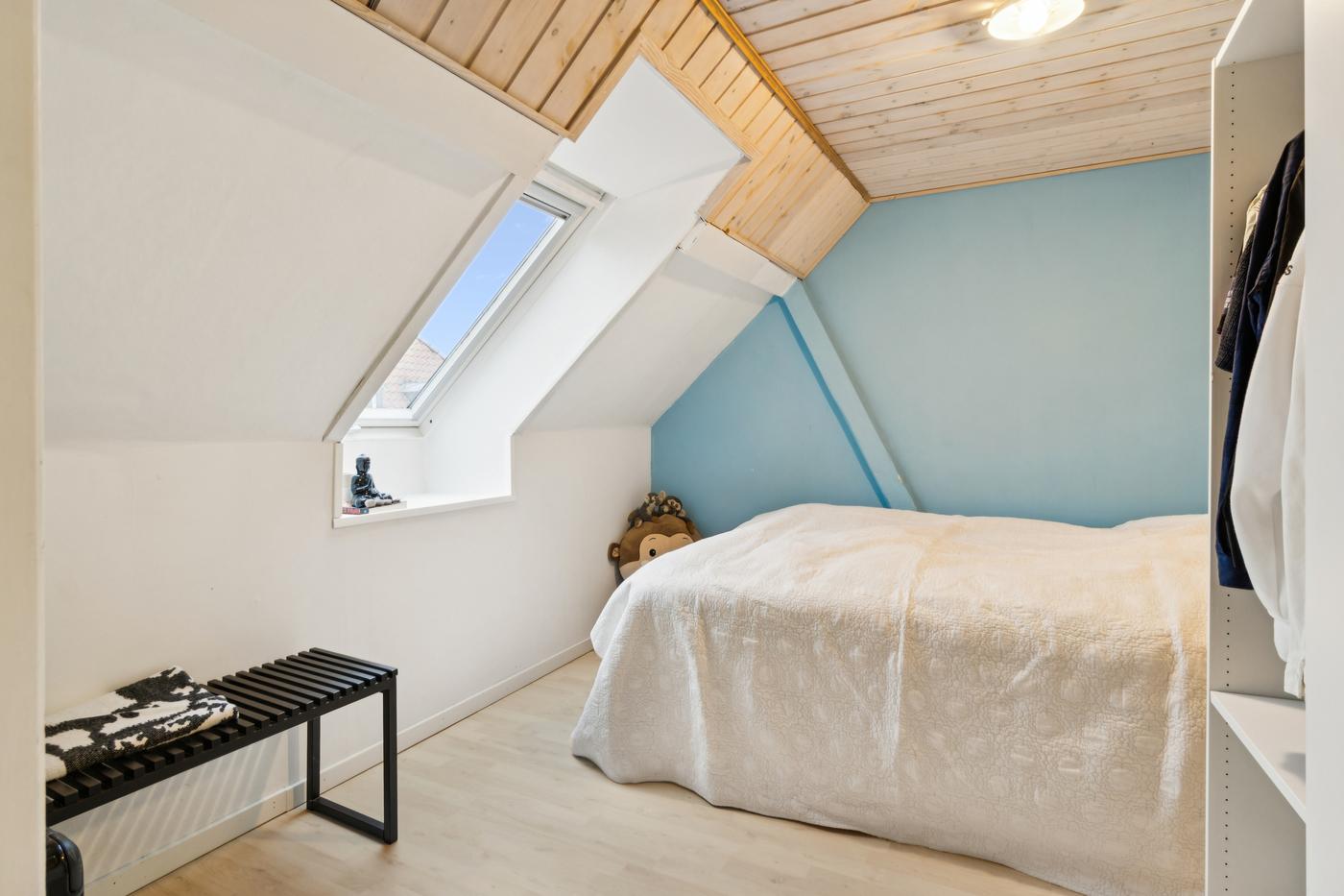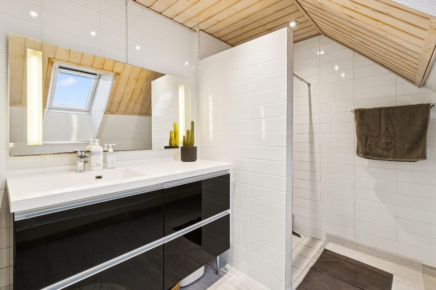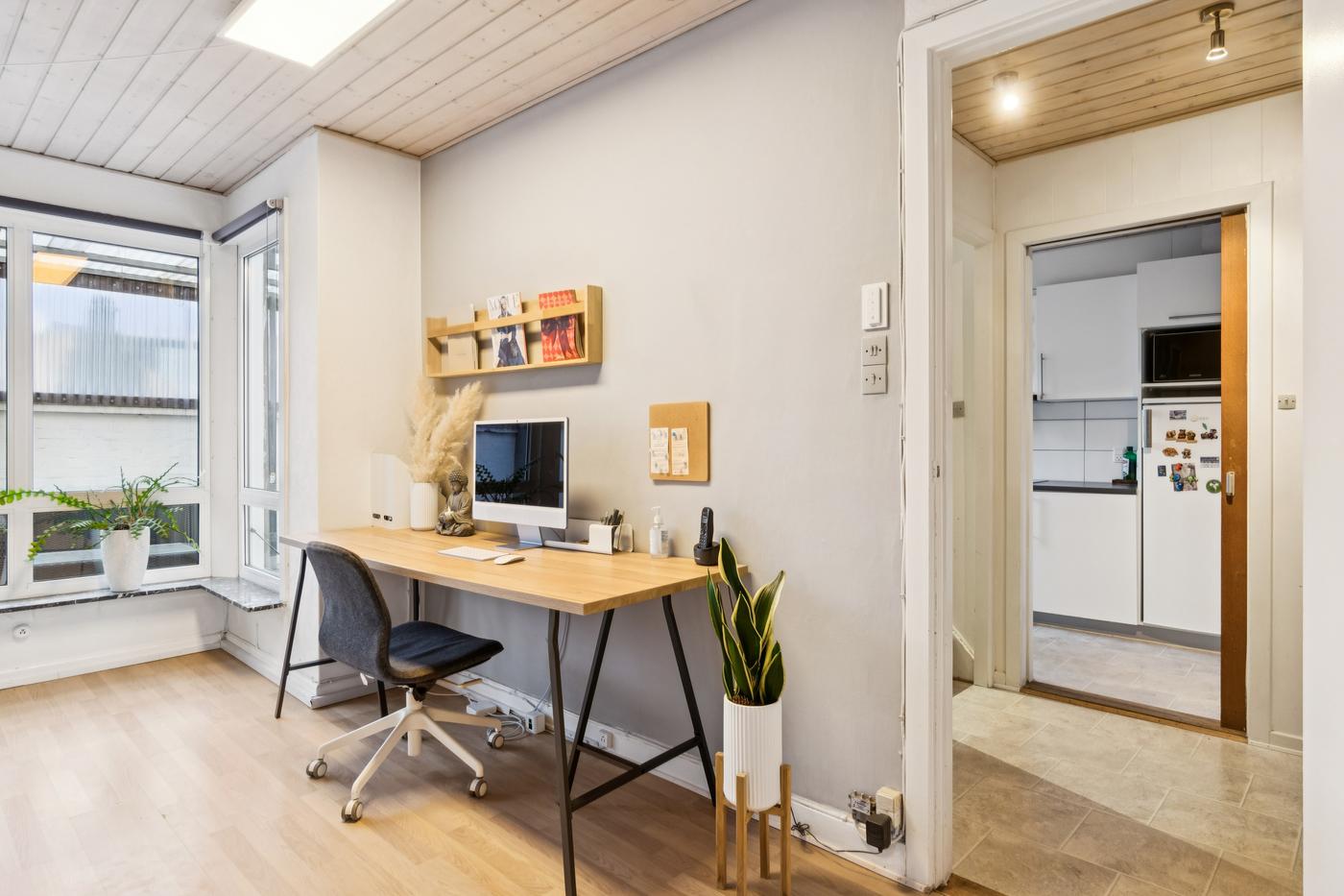 Boligdelen strækker sig over 1. og 2. sal og byder på en charmerende indretning med god plads. På 1. sal finder du entre, køkken, to stuer - den ene med direkte udgang til en sydvendt terrasse, hvor solen kan nydes dagen lang - samt et soveværelse. På 2. sal er der yderligere to værelser og et badeværelse, hvilket giver fleksibilitet til både familieliv og gæsteværelser.