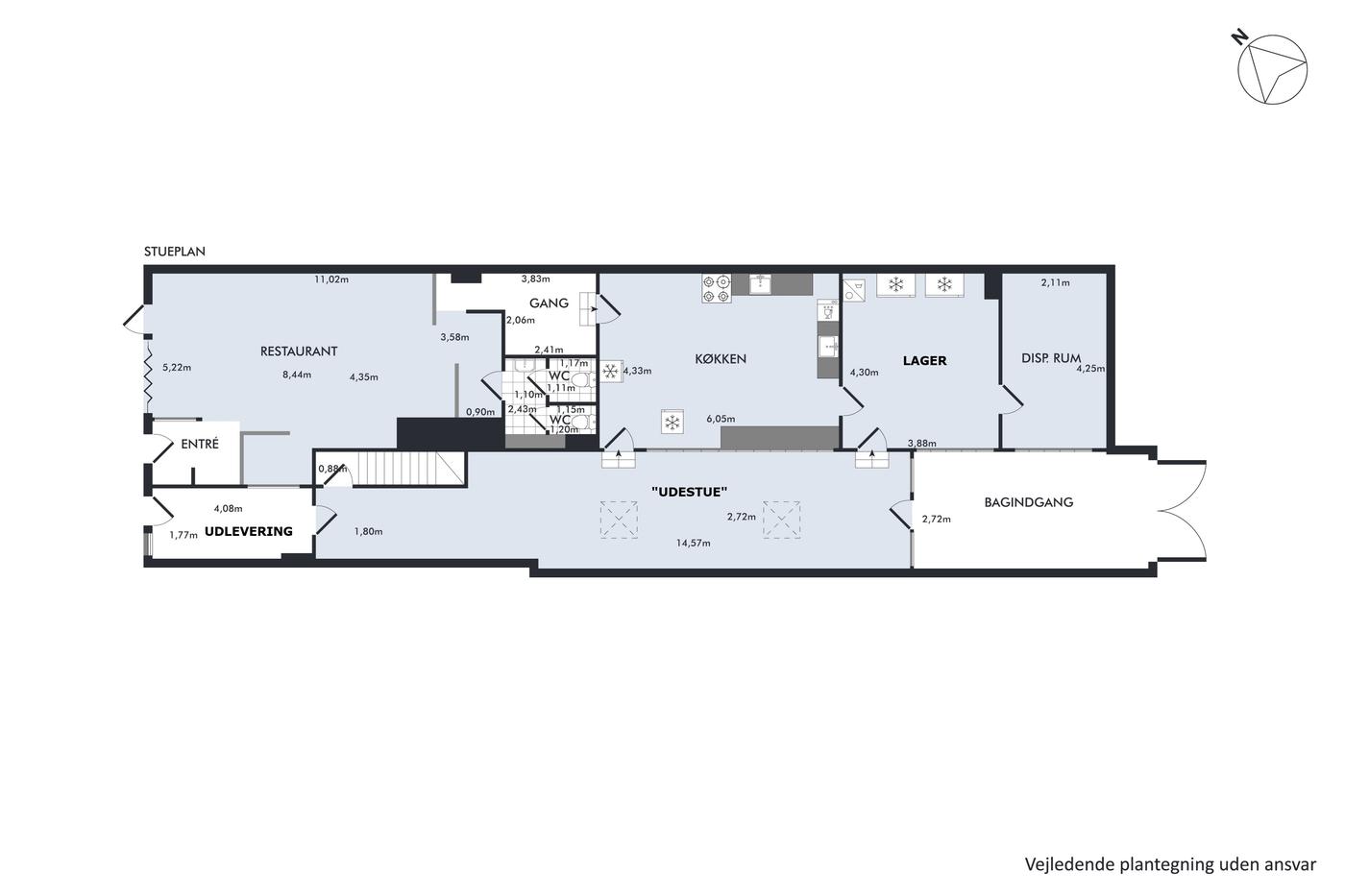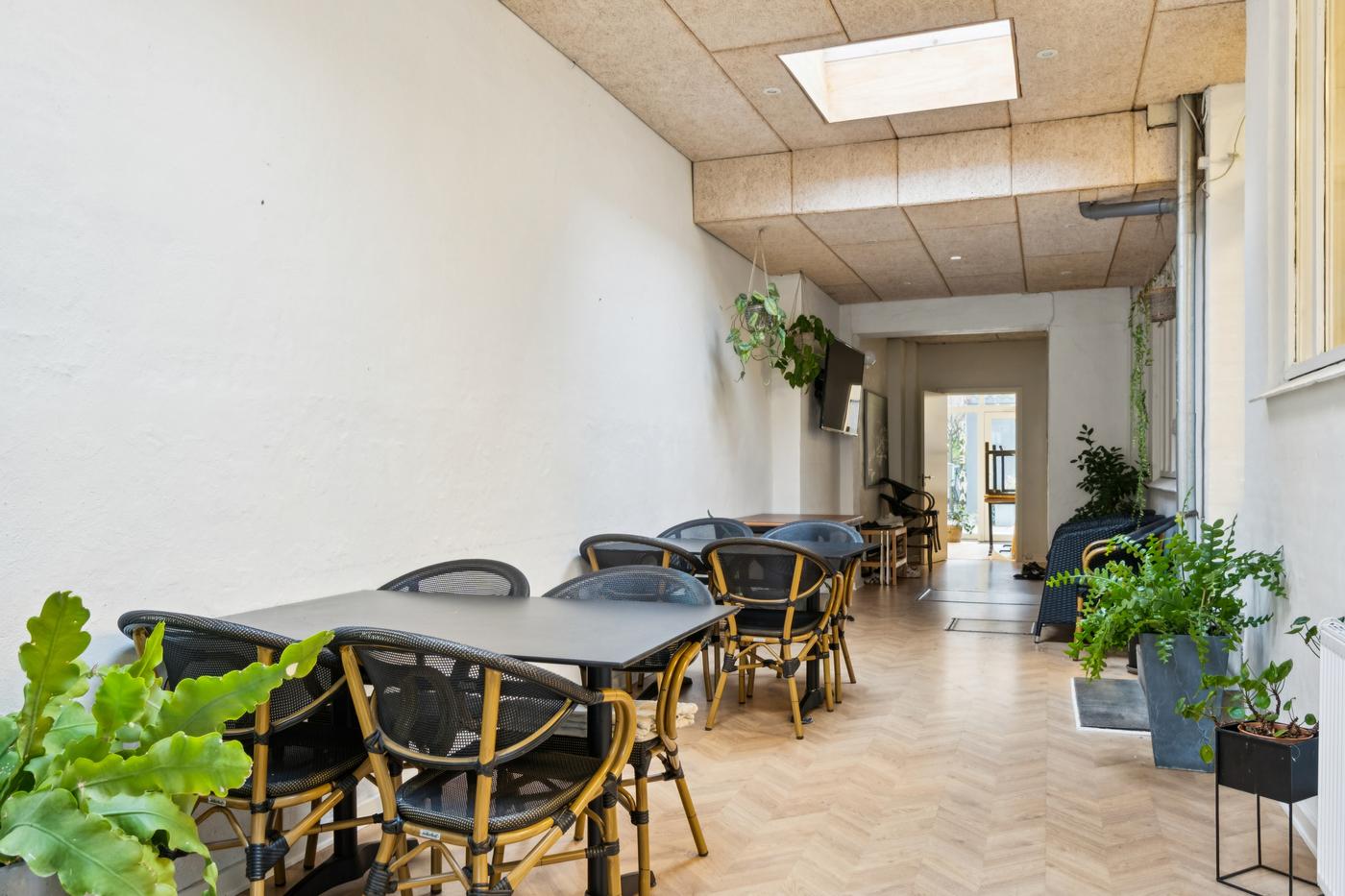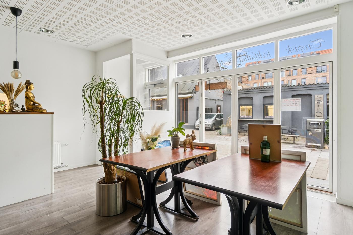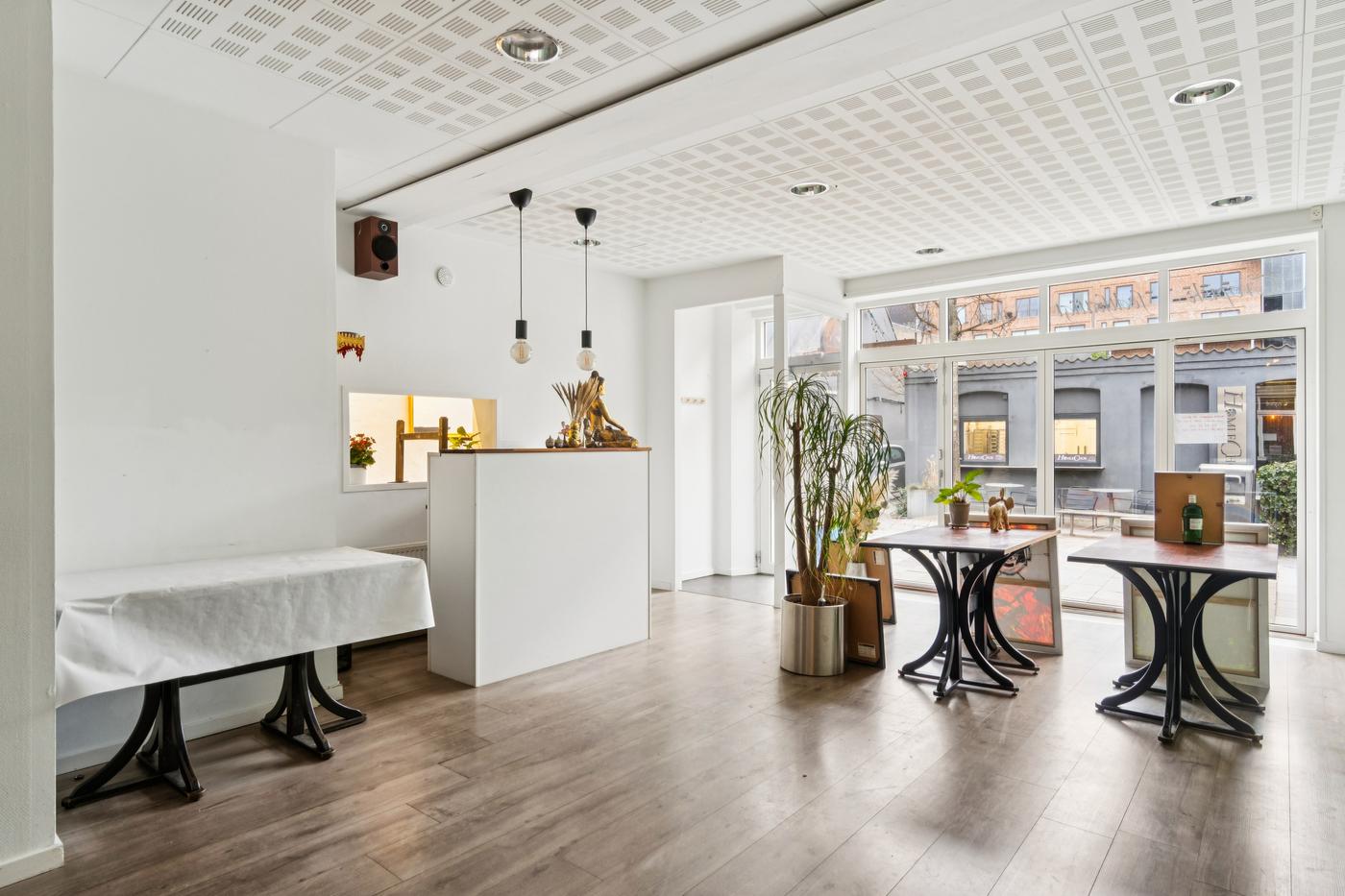 Stueetagen er indrettet som restaurant og har i mange år været drevet af nuværende ejer. Lokalet er funktionelt med plads til ca. 35 siddende gæster, og der er mulighed for udeservering foran ejendommen - en stor fordel i sommermånederne. Herudover rummer erhvervsdelen et køkken, depotrum og toiletter, hvilket gør det nemt at videreføre driften eller tilpasse lokalet til en ny konceptidé. Lokalerne kan selvfølgelig også bruges til andet erhverv end restaurant.