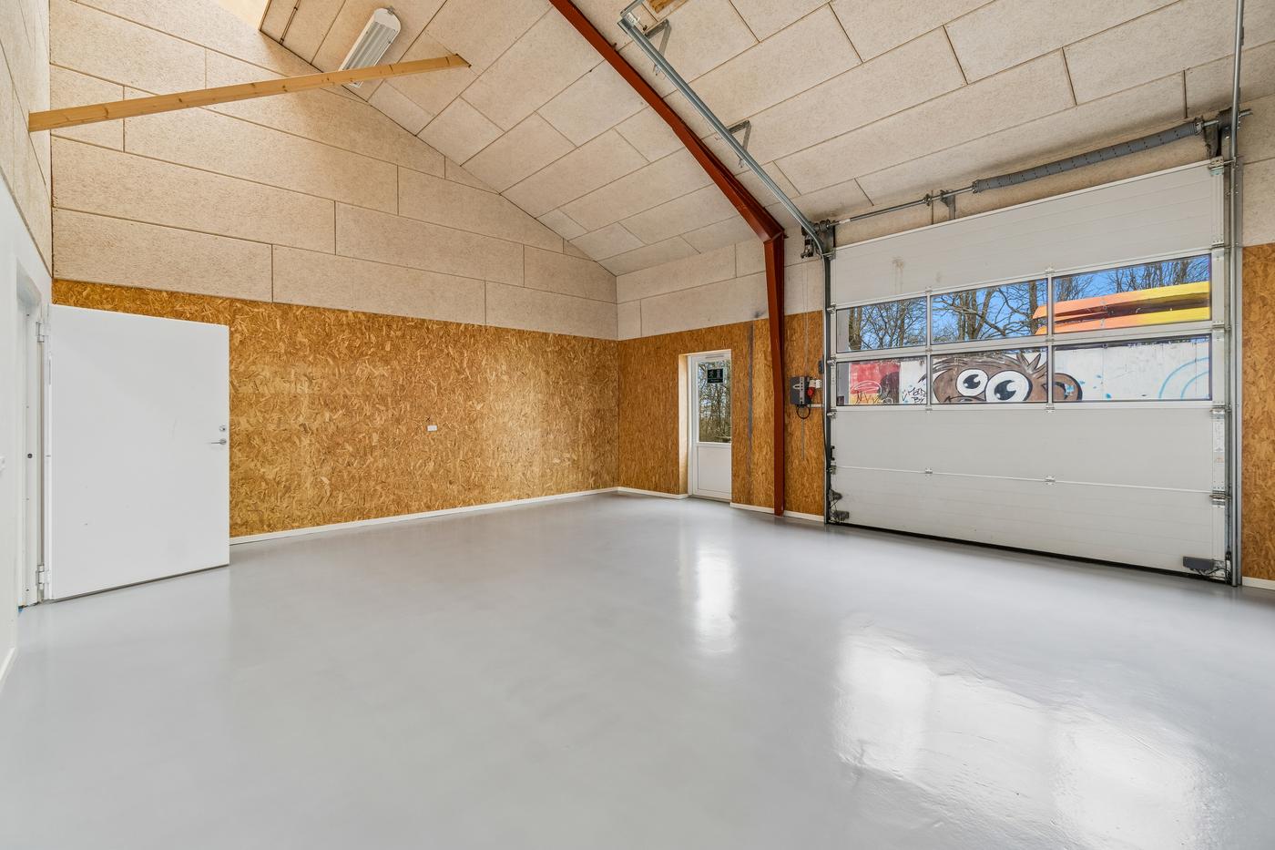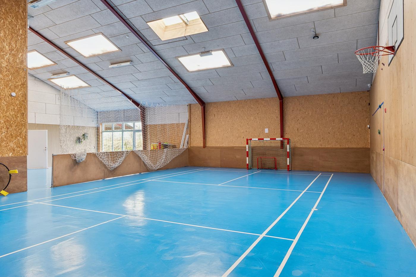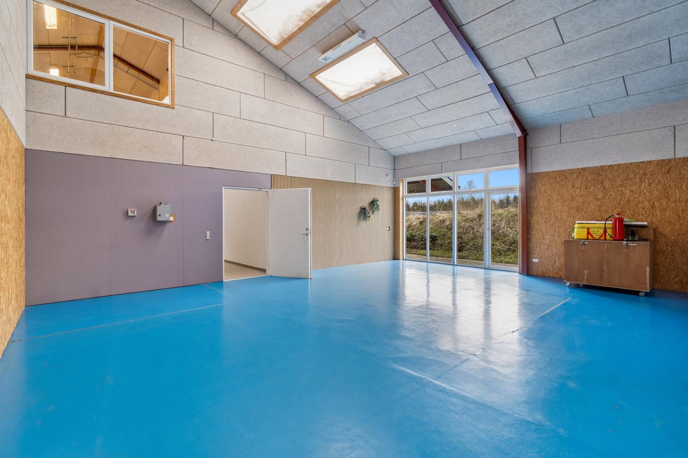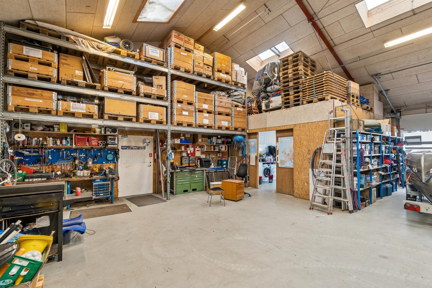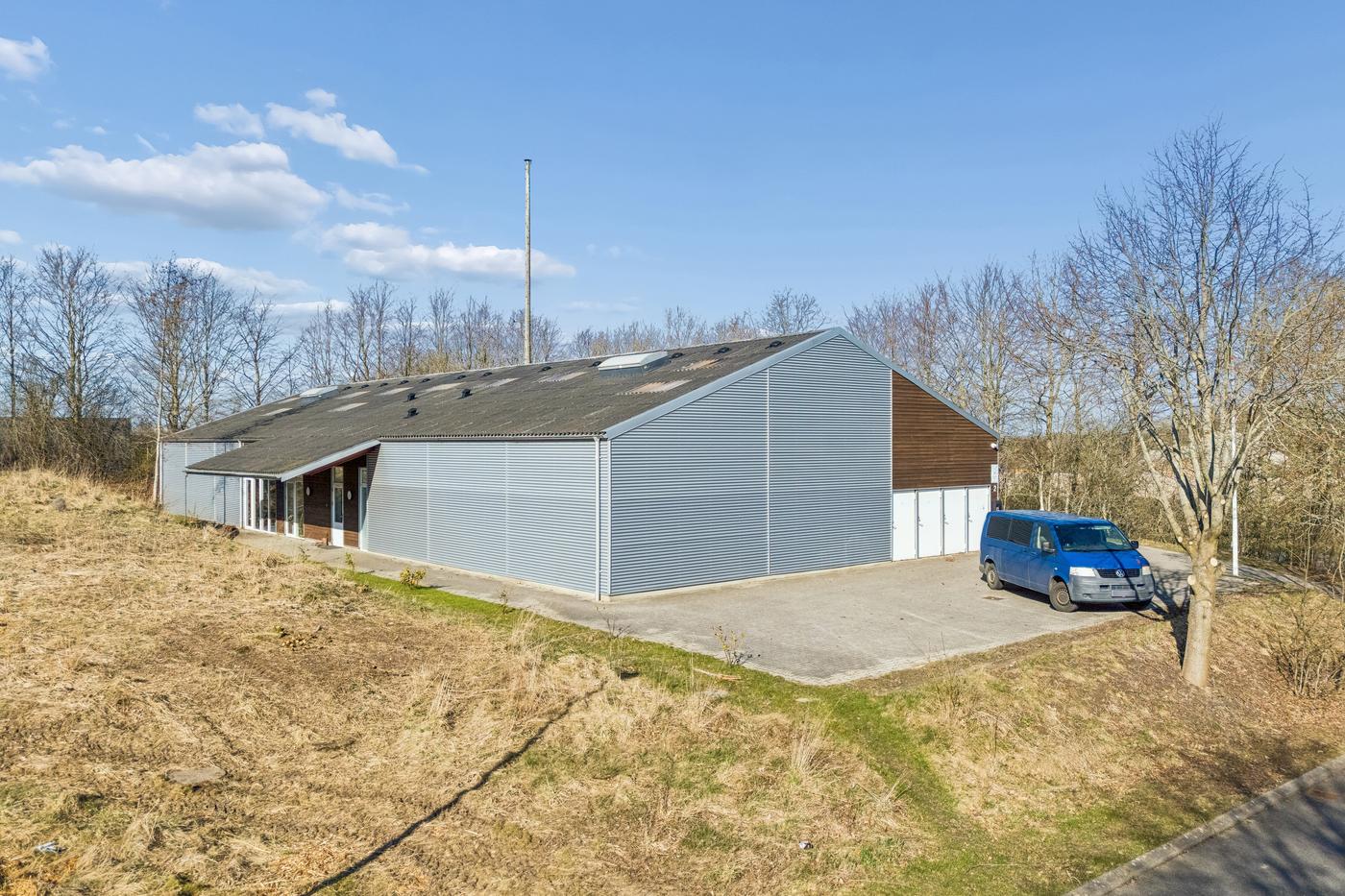 På hver side af kontorafsnittet ligger to gode, højloftede haller på cirka 200 m² og 270 m². Den største hal har senest fungeret som multisal med lounge og aktiviteter som badminton, basket og hockey, hvorfor en kombination af erhvervs- og hobbybrug, nicheerhverv, showroom, lager eller alternative koncepter kan tænkes her.