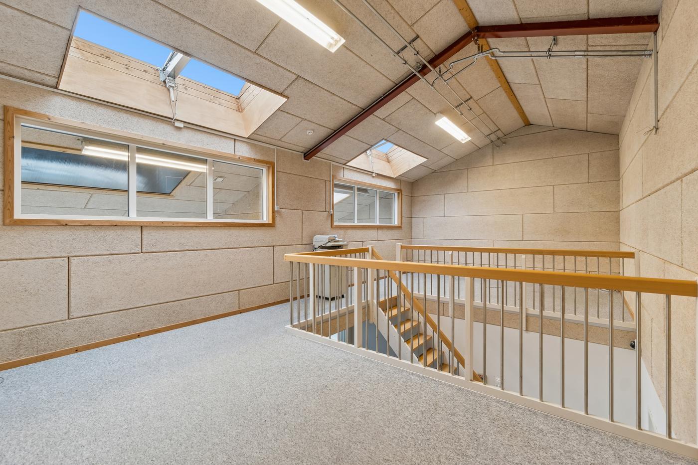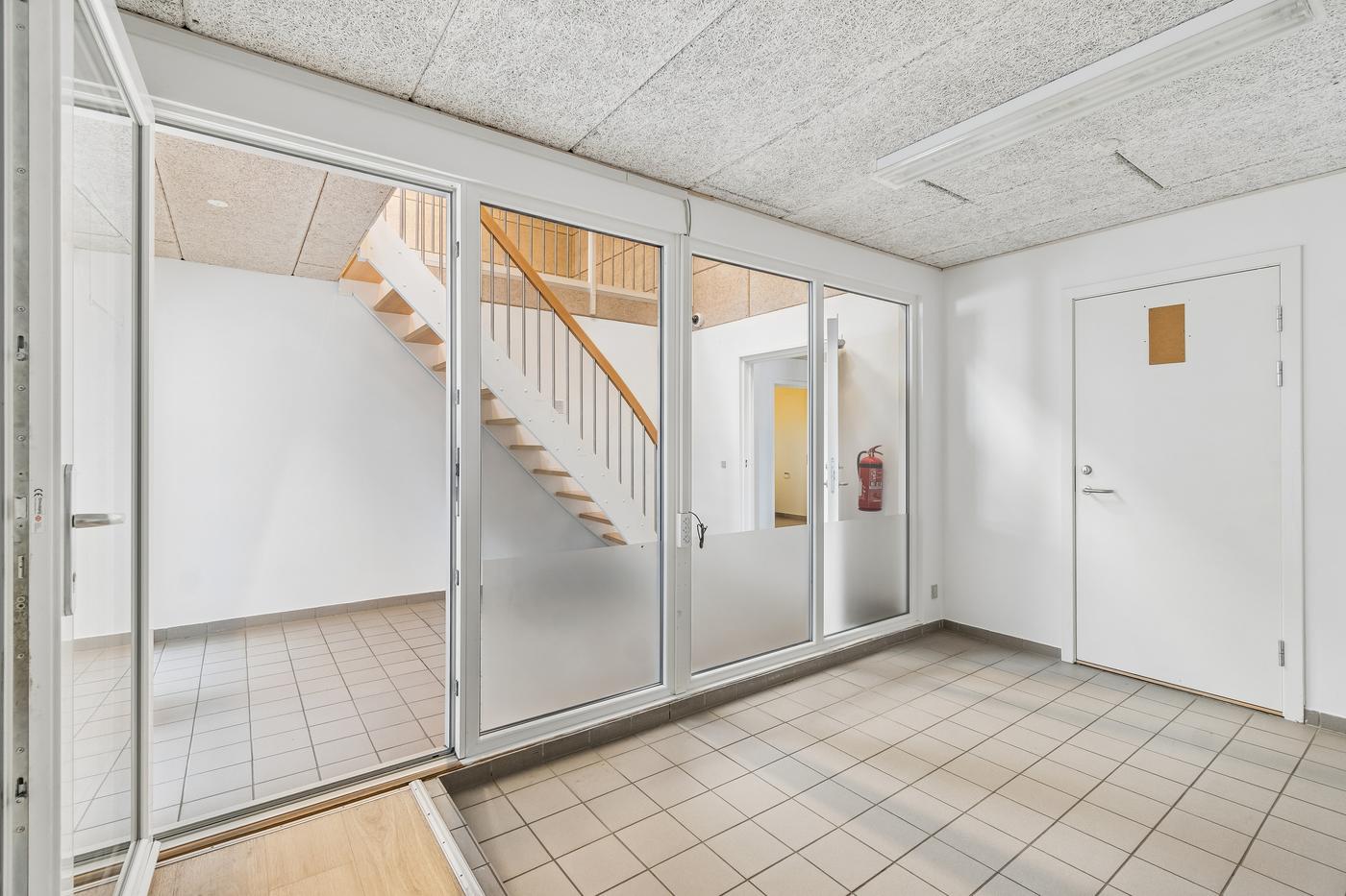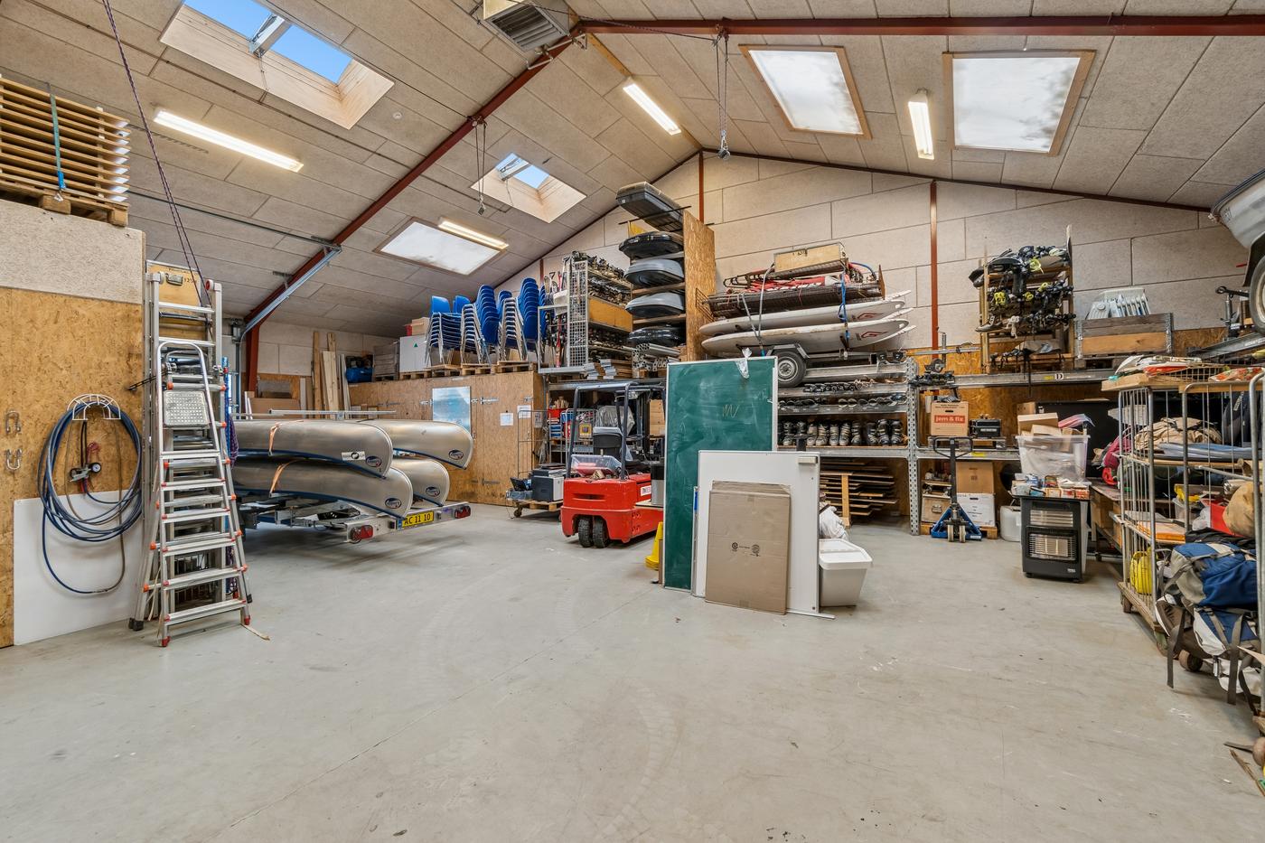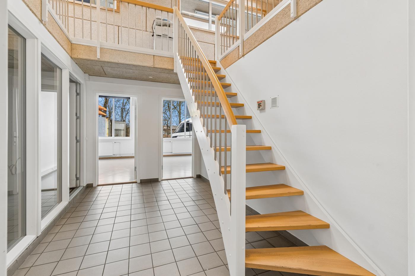På hver side af kontorafsnittet ligger to gode, højloftede haller på cirka 200 m² og 270 m². Den største hal har senest fungeret som multisal med lounge og aktiviteter som badminton, basket og hockey, hvorfor en kombination af erhvervs- og hobbybrug, nicheerhverv, showroom, lager eller alternative koncepter kan tænkes her.