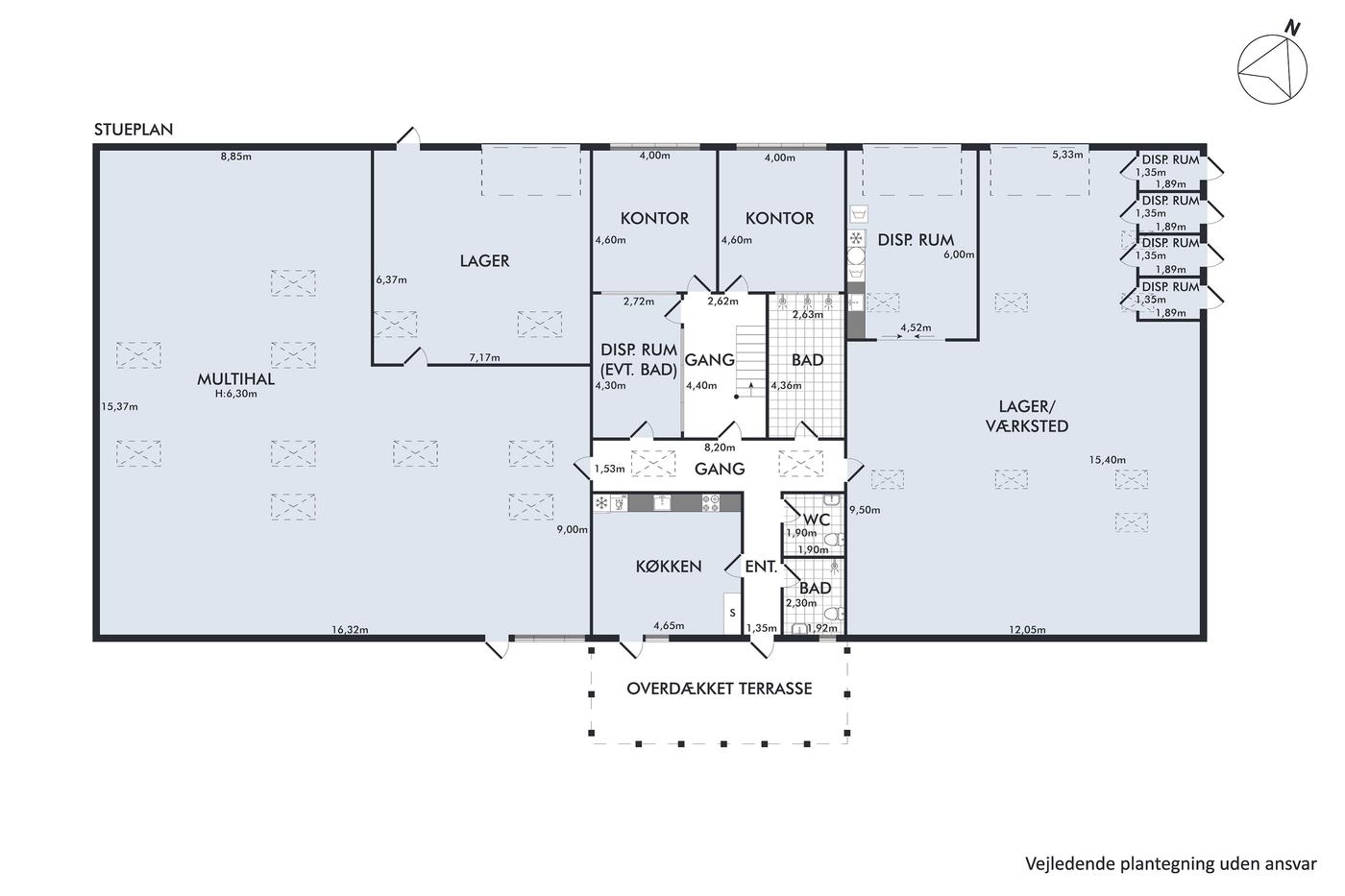 Det er også oplagt at indrette flere lejemål, da ejendommen har flere porte, og mulighed for yderligere portetableringer og naturlige ruminddelinger. Det kan enten være separate lejemål eller med en fælles kerne i midten efter behov. Sælger kan have interesse i at leje sig ind i den 200 m² store lagerhal, såfremt køber ønsker delvis udlejning fra dag ét — hvor køber selv kan disponere over den resterende del.