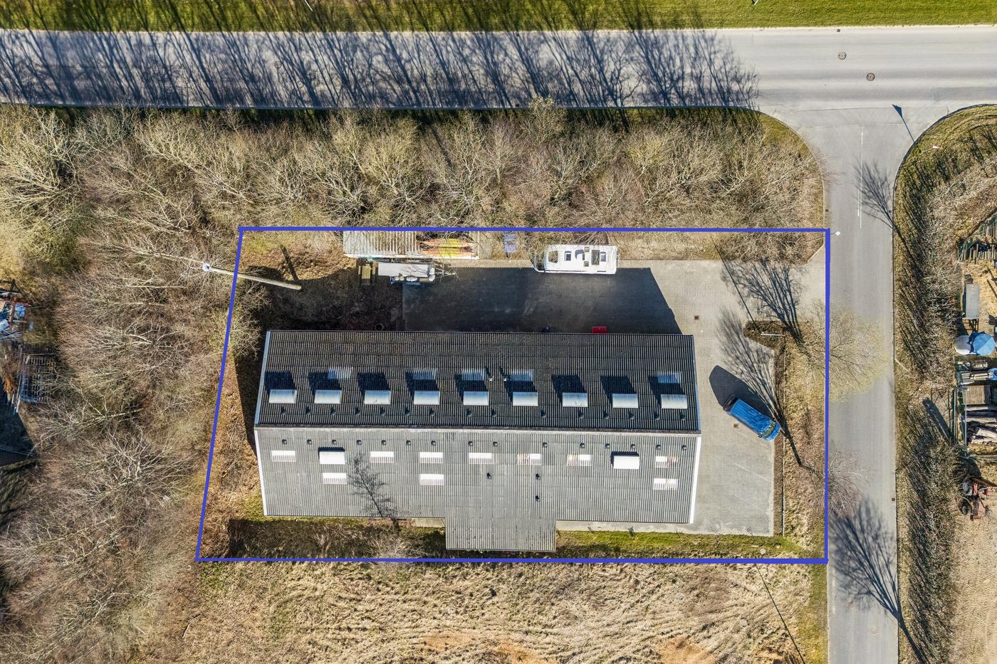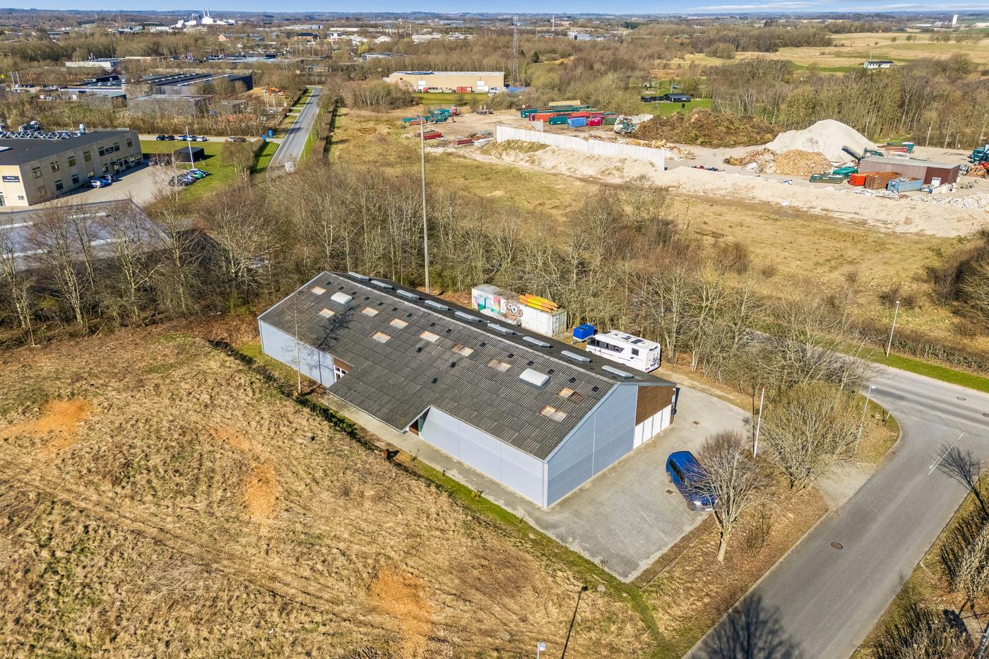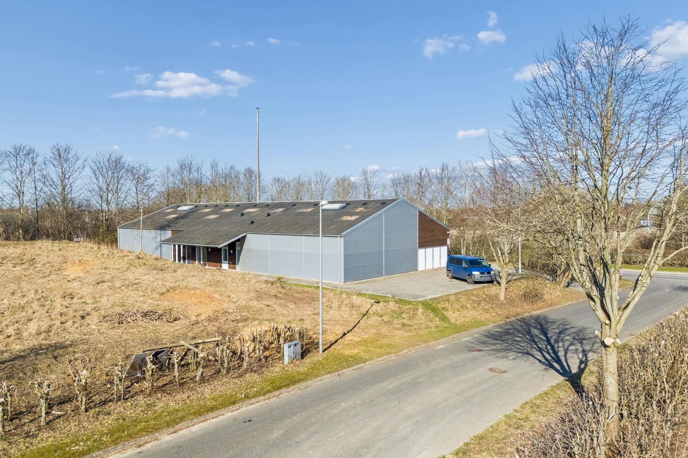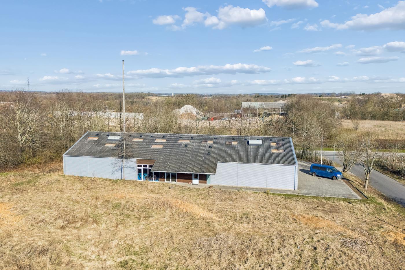Bygningen er opført i 2009 i stålpladekonstruktioner og fremstår i pæn og velholdt stand. Ejendommen har gode lysforhold via ovenlys, og sikkerheden er høj med fuld overvågning installeret. Indretningen giver en naturlig opdeling af ejendommen, som er ideel for både produktions-, lager-, håndværks- og hobbyorienterede formål — og ikke mindst for købere, som ønsker at kombinere flere funktioner i én samlet ejendom.
