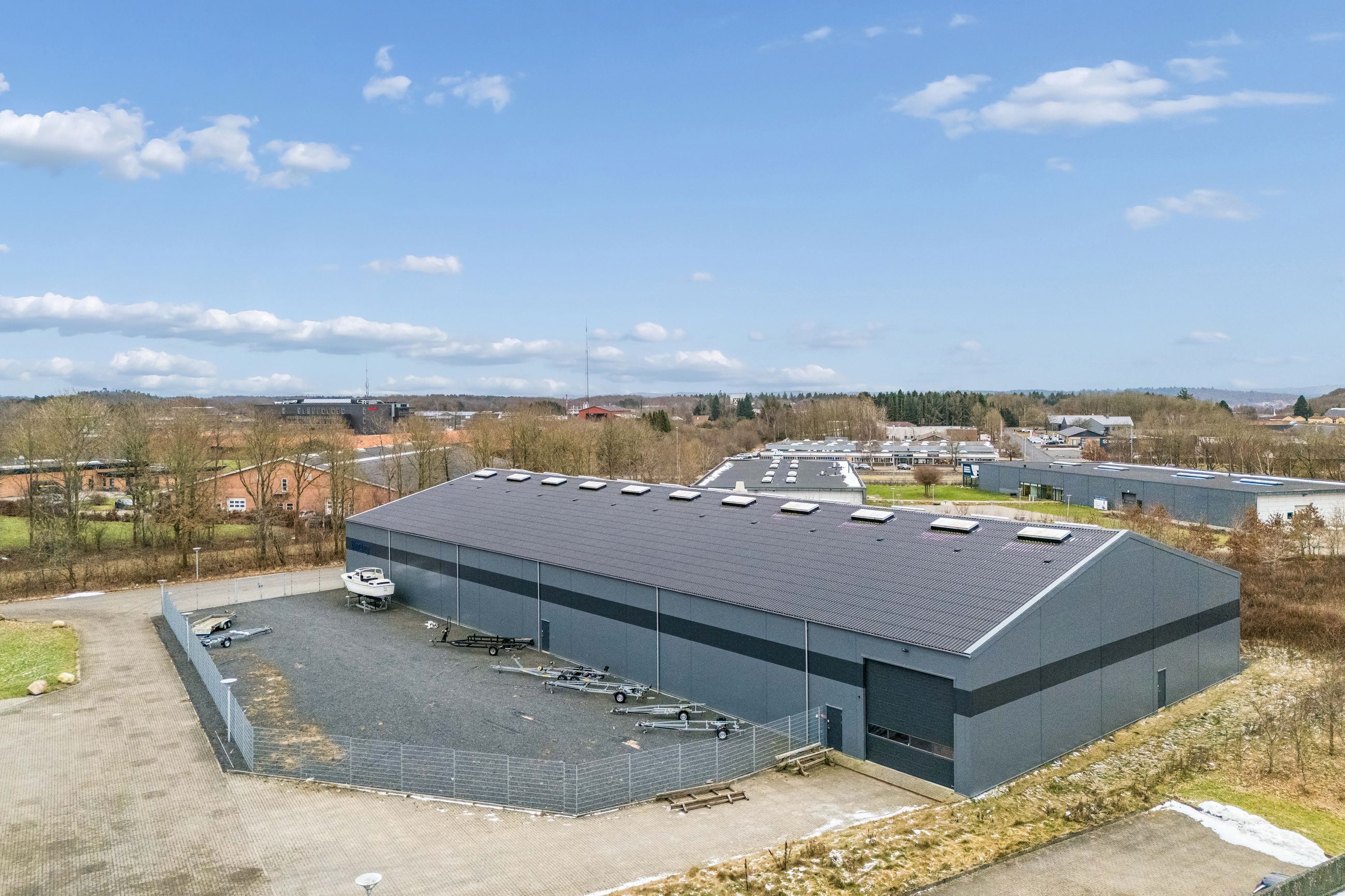 Løsningen er oplagt og fleksibel for virksomheder, der har midlertidige behov i perioder med høj aktivitet, behov for ekstra bufferkapacitet eller projektorienteret lagerdrift. Samtidig er der mulighed for at sikre sig tilbagevendende leje år efter år, hvilket skaber stor driftsmæssig forudsigelighed. Efter aftale også mulighed for udendørs opbevaring på indhegnet areal. Lagerhallen fra 2021 kan delesmellem flere brugere fra 500 til 1.500 m² efter nærmere aftale. Hallen er fuldt isoleret (ej opvarmet), meget regulær og konstrueret til at kunne håndtere pladskrævende gods med en loftshøjde på cirka 5,5 meter i siden og hele 9,5 meter i kip. Desuden to store porte, som gør det muligt at komme til med lastbiler og større transporter i begge ender af hallen uden besvær, samt adgang til at benytte kran ved den primære port. I hallen findes også nydeligt toilet og badefaciliteter. Lejeeksempler: • 500 m² kan lejes for cirka 16.700 kr./md. • 1.000 m² kan lejes for cirka 33.500 kr./md. • 1.500 m² kan lejes for cirka 50.000 kr./md. Svarende til 400 kr./m² i årsleje. Kan lejes fra 1. maj til ophør senest 30. september samme år. Beliggenhed: Ejendommen ligger i det nordlige erhvervsområde i Silkeborg, der i kraft af sin placering tæt på hovedfærdselsårerne fungerer som et naturligt knudepunkt for transport og logistik. Herfra er der hurtig forbindelse til ydre ringvej og motorvejstilkørslerne ved både Silkeborg Nord. Dermed er Aarhus, Herning, Billund og resten af Midtjylland let tilgængeligt for både daglige leverancer og regionale transporter. Udenomsarealer: Efter aftale mulighed for udendørs opbevaring på grusbelagt indhegnet areal. Overtagelse: Lejemålet overtages tidligst den 1. maj og tidsbegrænses til ophør senest den 30. september.
