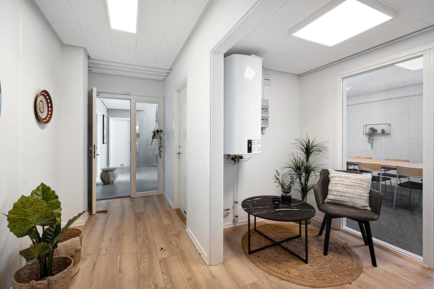 En større del af kontorlokalerne er i dag anvendt til showroom, som også sagtens vil kunne anvendes til kontor og mødelokaler. Anvendelsesmulighederne er således mange, og på mange måder ideel til handelsvirksomhed og webshop, eller en virksomhed som udvikler og tester egne produkter eller med lagersalg heraf. Kontorlokalerne er fordelt på to etager med the-køkken og toiletter på hvert plan, og der er således også gode muligheder for opdeling i flere afdelinger eller evt. fremleje.