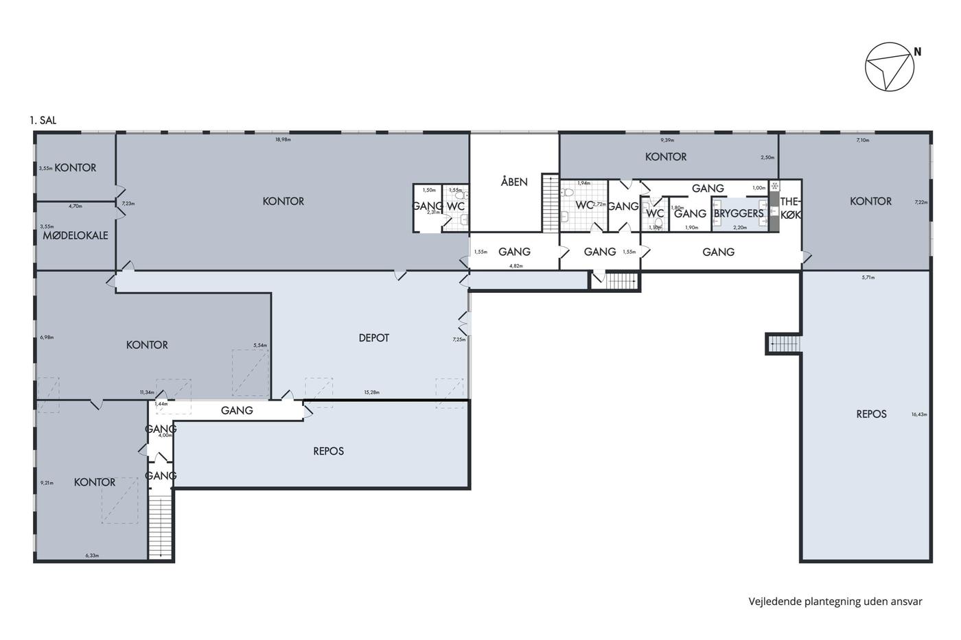 Selve lejemålet fordeler sig på ca. 1.330 m² kontor, showroom, kantine og arkiv i to plan samt ca. 461 m² højloftet lager. Som en ekstra bonus får du ca. 150 m² meget anvendelige reposer (ej registreret) med i lejemålet til ekstra lager eller opmagasinering.