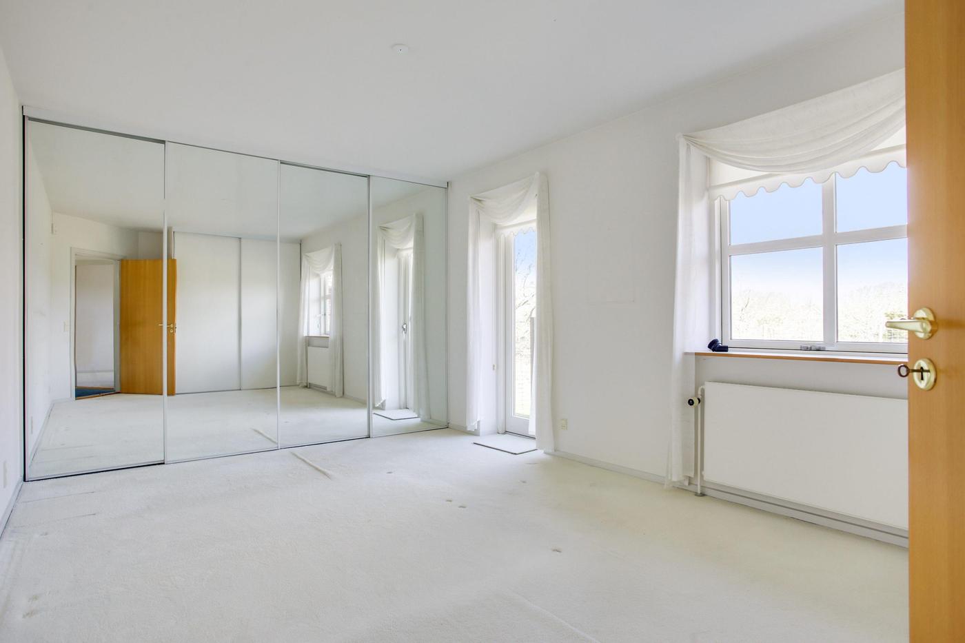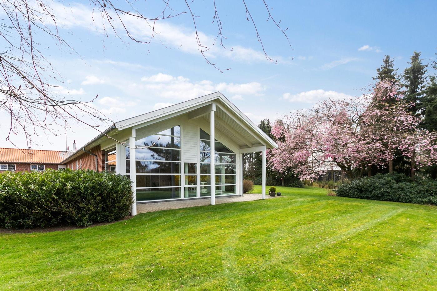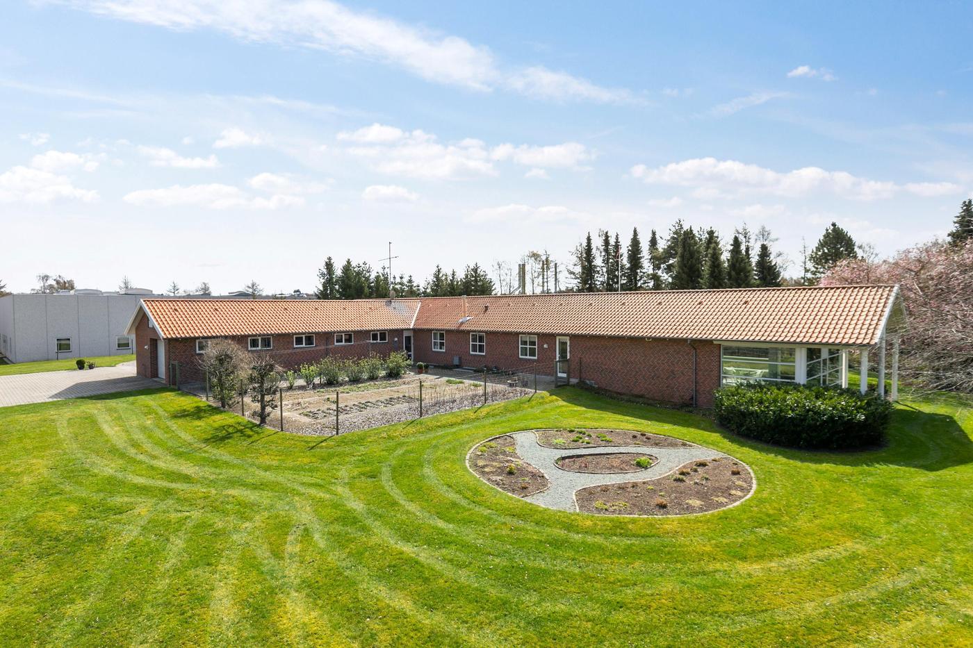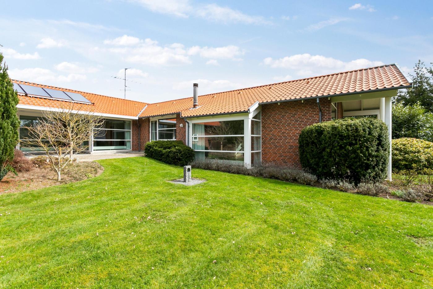 Ejendommen ligger tilbagetrukket og ugeneret omkranset af en stor flot have med plæne, træer og busker.