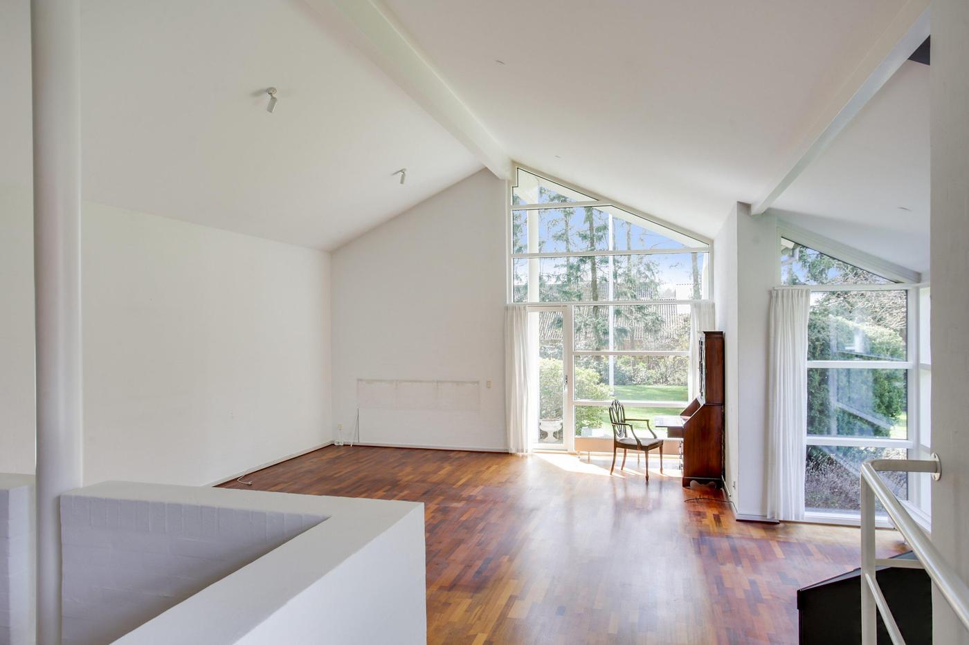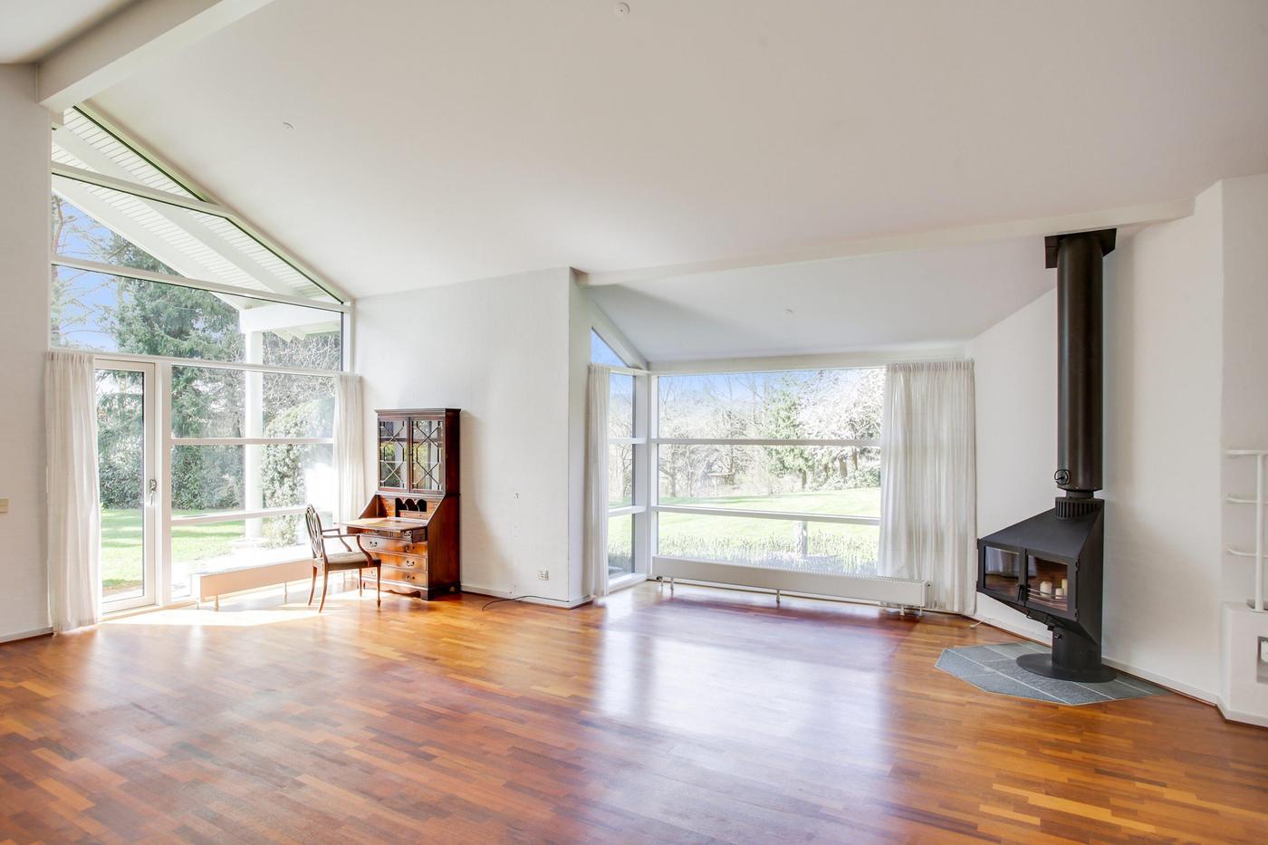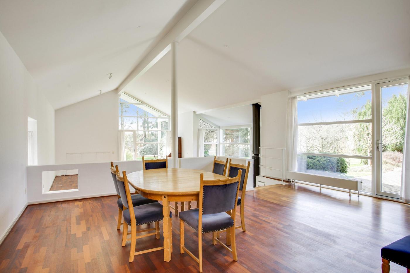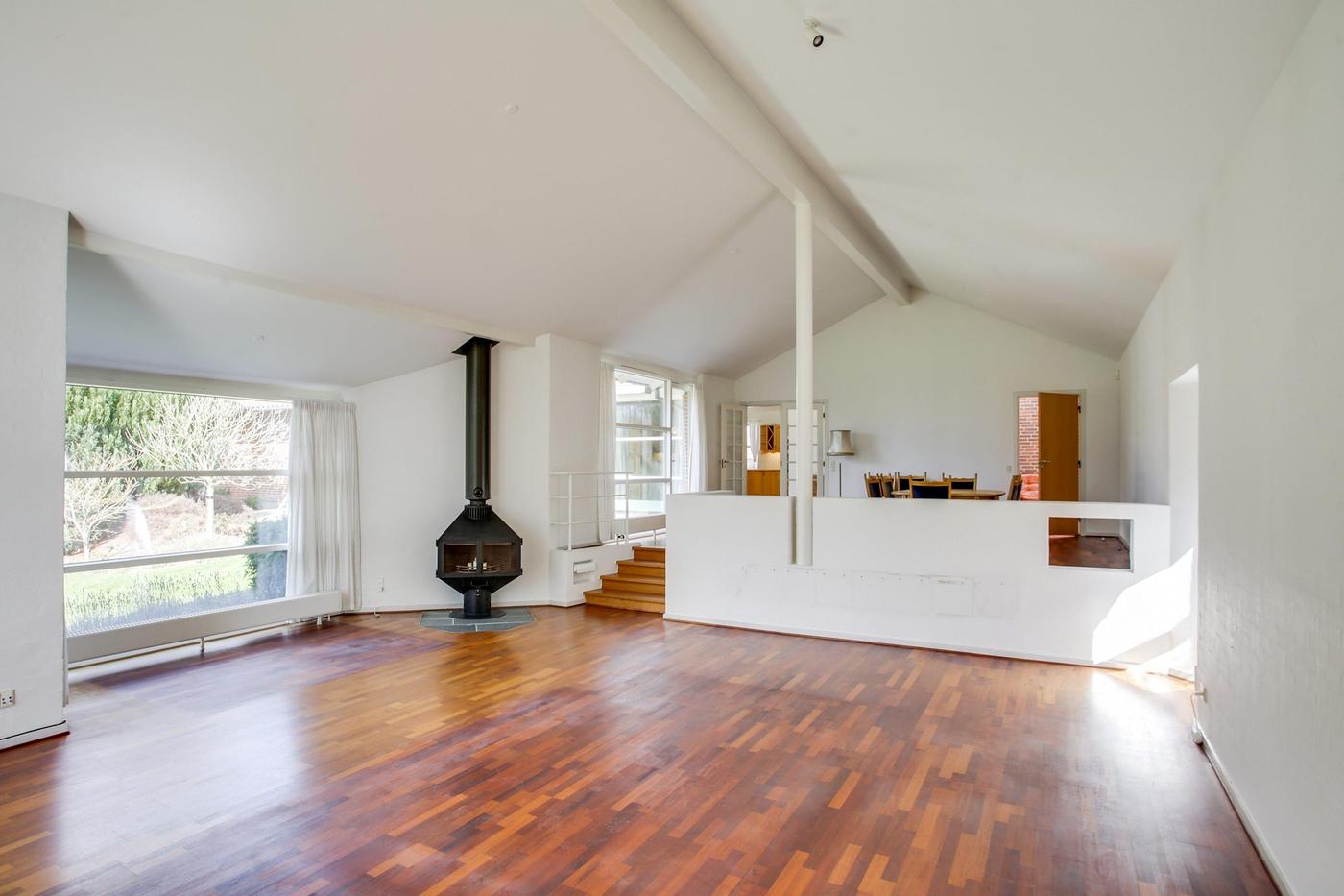 Ejendommen ligger tilbagetrukket og ugeneret omkranset af en stor flot have med plæne, træer og busker.