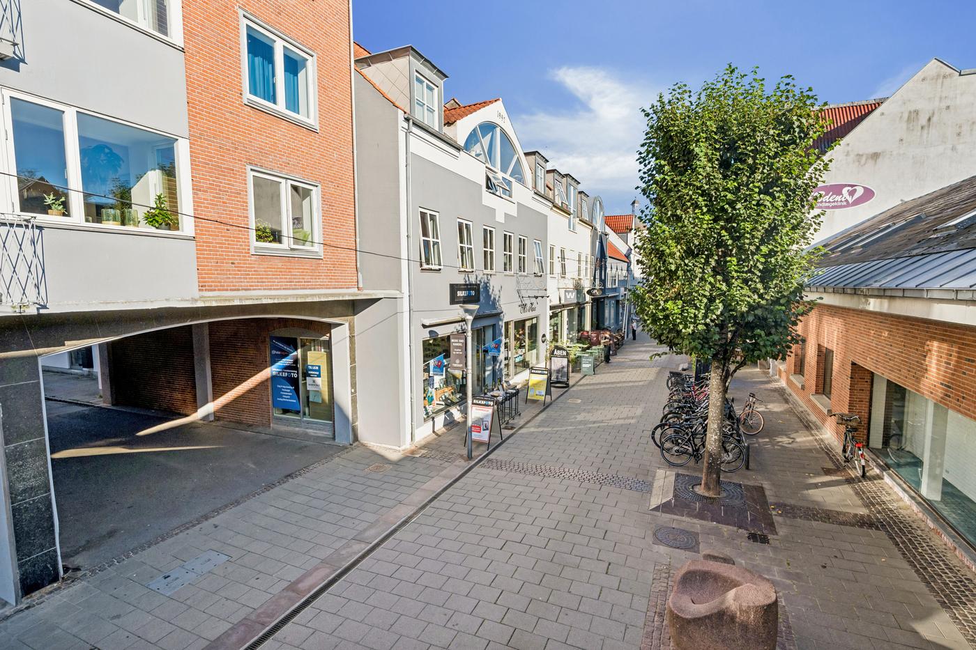 Facaden har store vinduespartier, som sikrer god eksponering og naturligt lysindfald. Den synlige placering på gågaden gør butikken ideel til at tiltrække forbipasserende, og med offentlig kundeparkering lige om hjørnet ved Bios Gård, er det nemt for kunder at komme til og fra. Ejendommen ligger i et område med et stærkt og varieret butiksmix, hvor naboerne inkluderer Matas, NEYE, Bolig Form, Parfumeriet, Yerst Glas, T.I.N.G., Humlechok og Joe & The Juice. Dette skaber et aktivt handelsmiljø og et godt naboskab, hvor butikkerne understøtter hinandens kundestrømme.