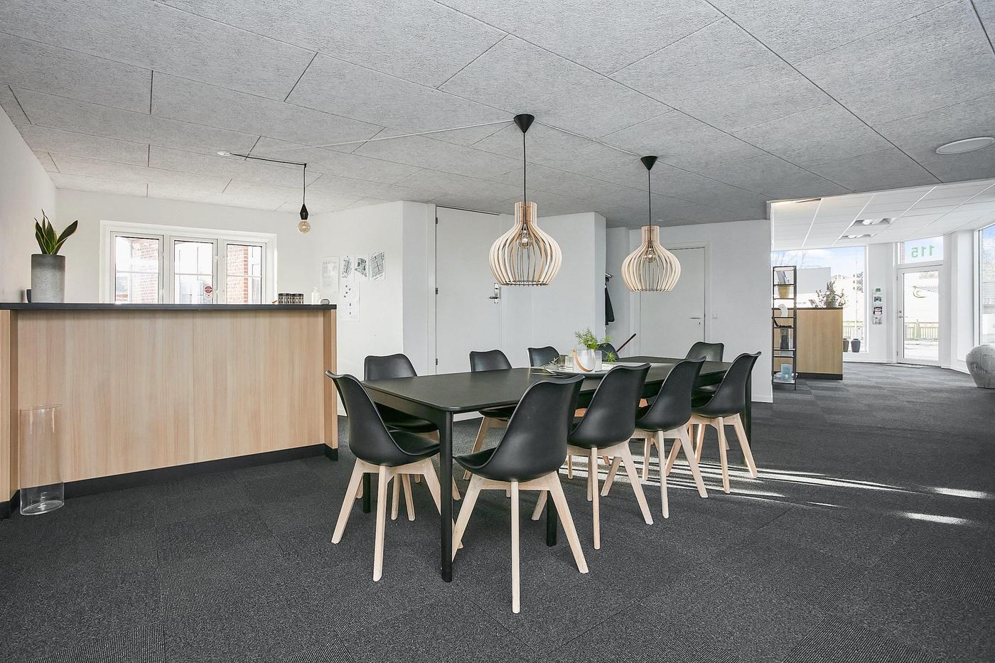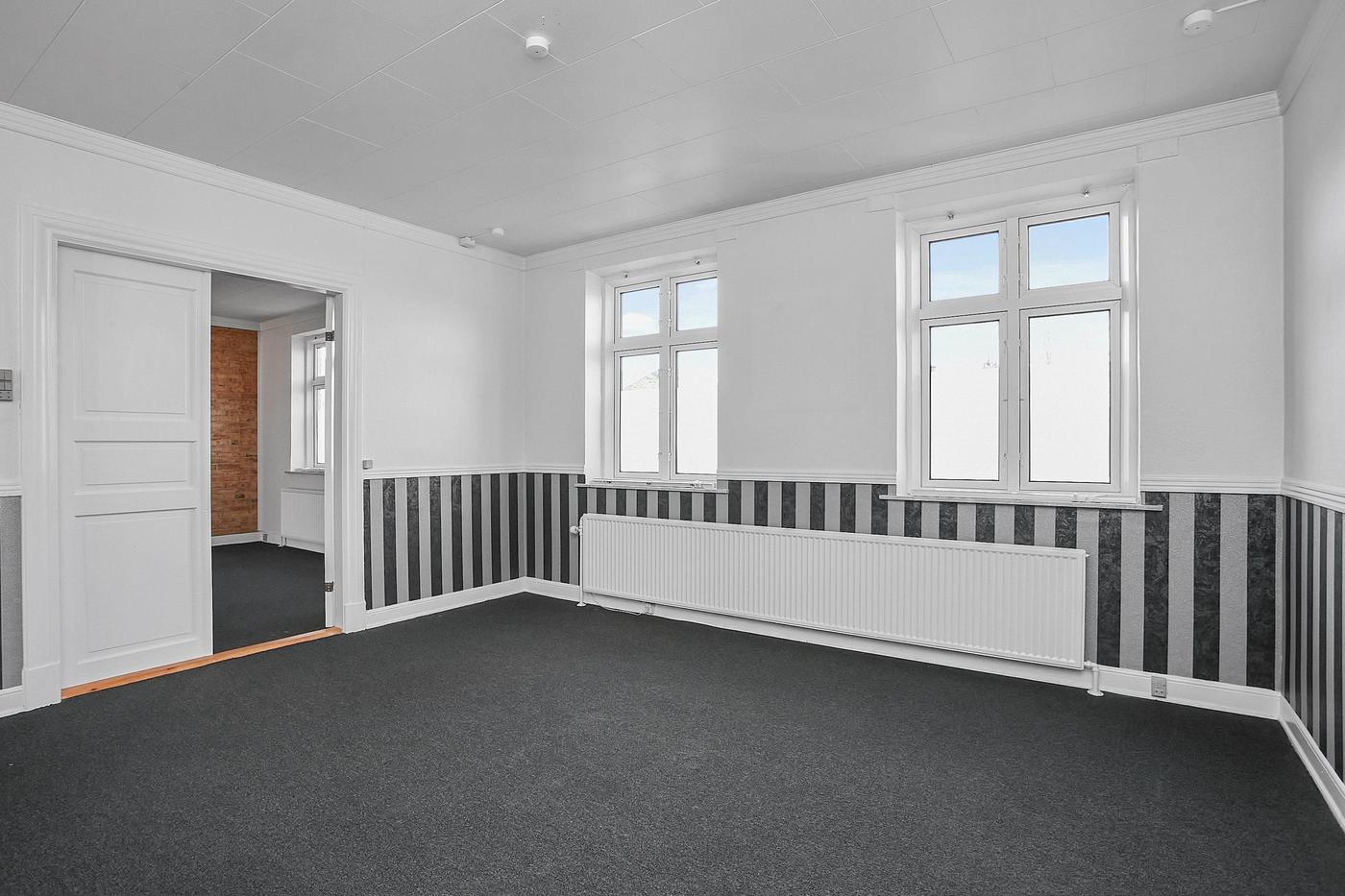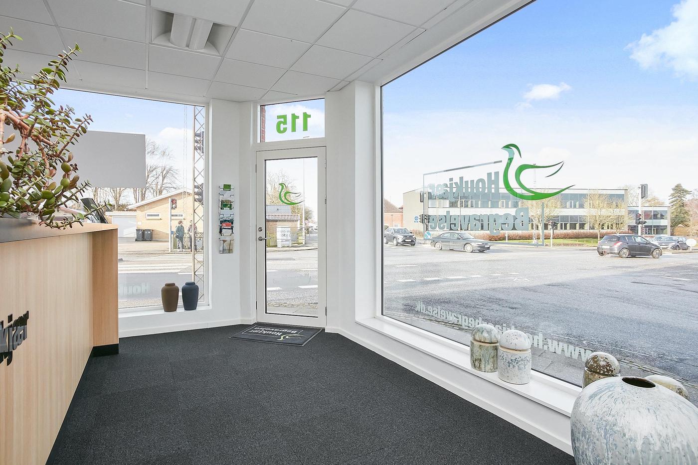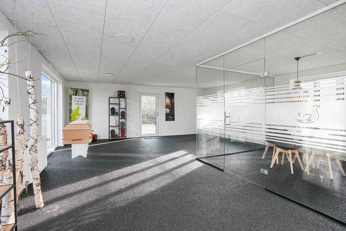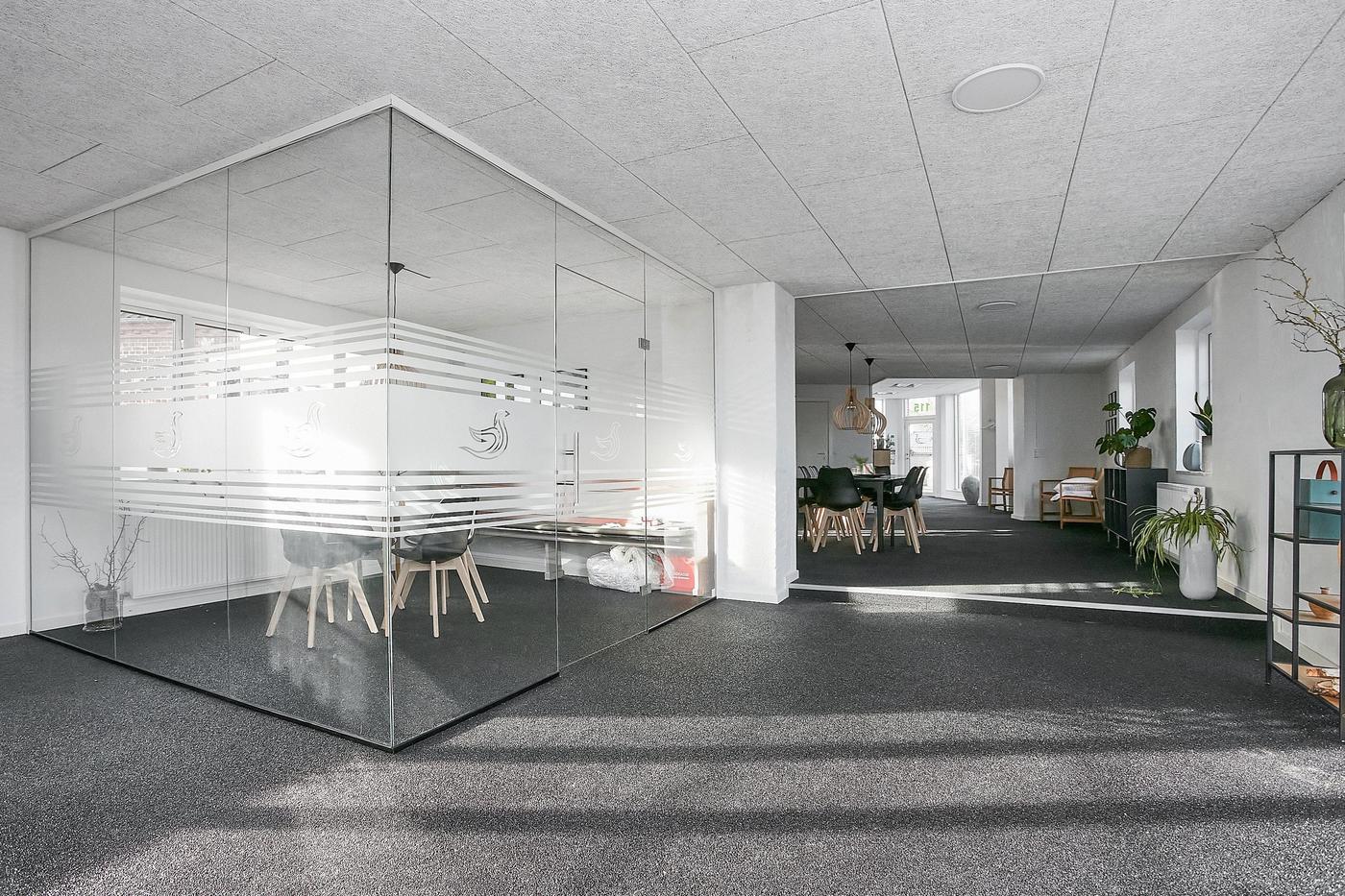 Erhvervslejemålet i stueplan på i alt 126 m² består af stort lokale med receptionsområde og område med mødebord, mødelokale med glasvægge samt toilet og garderobe.