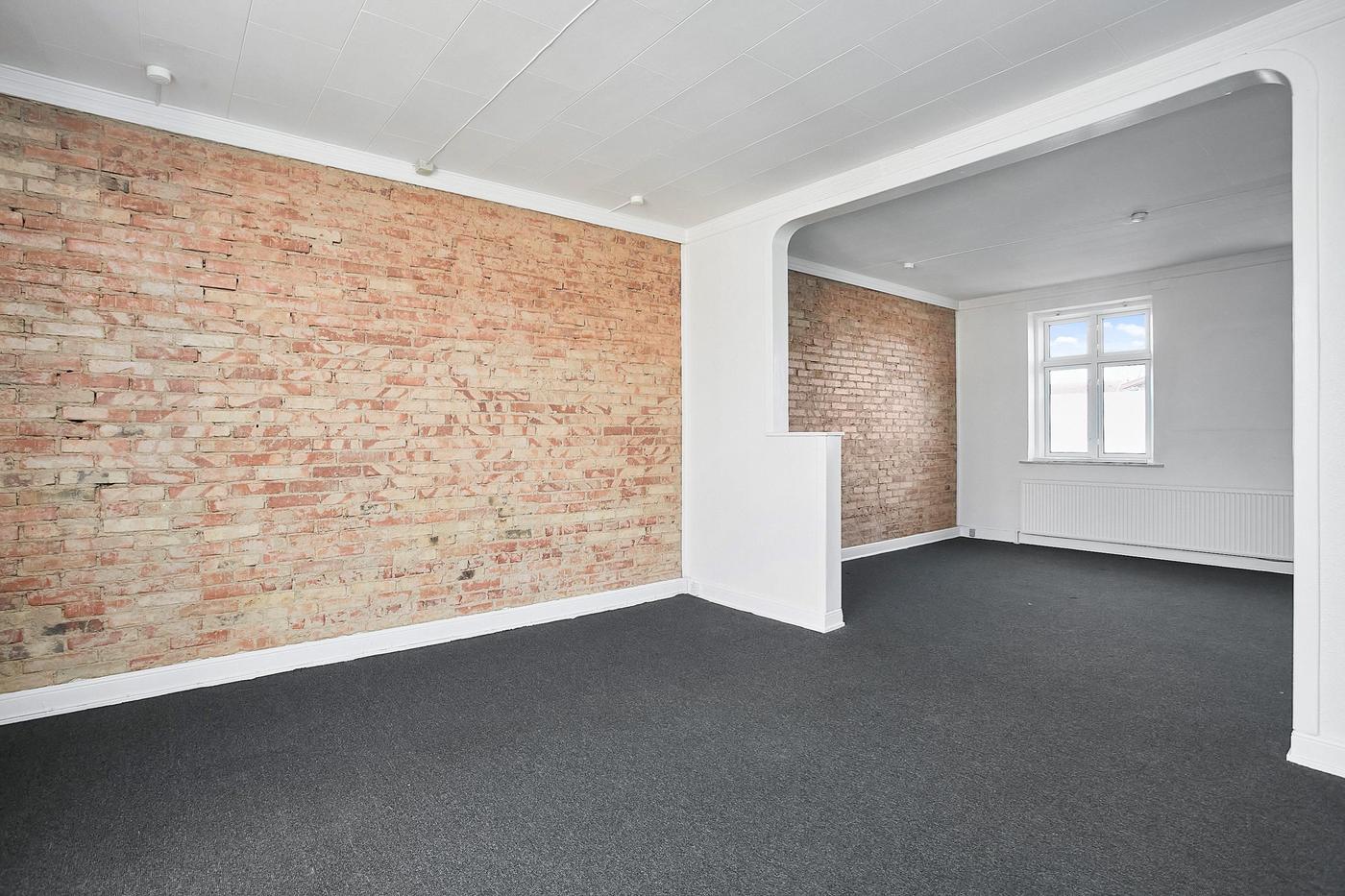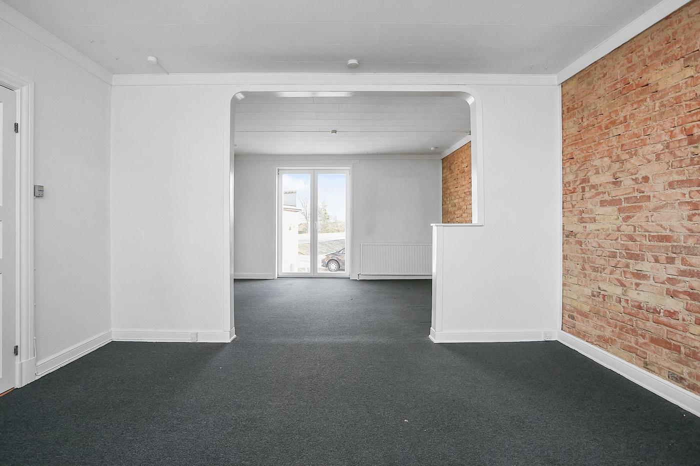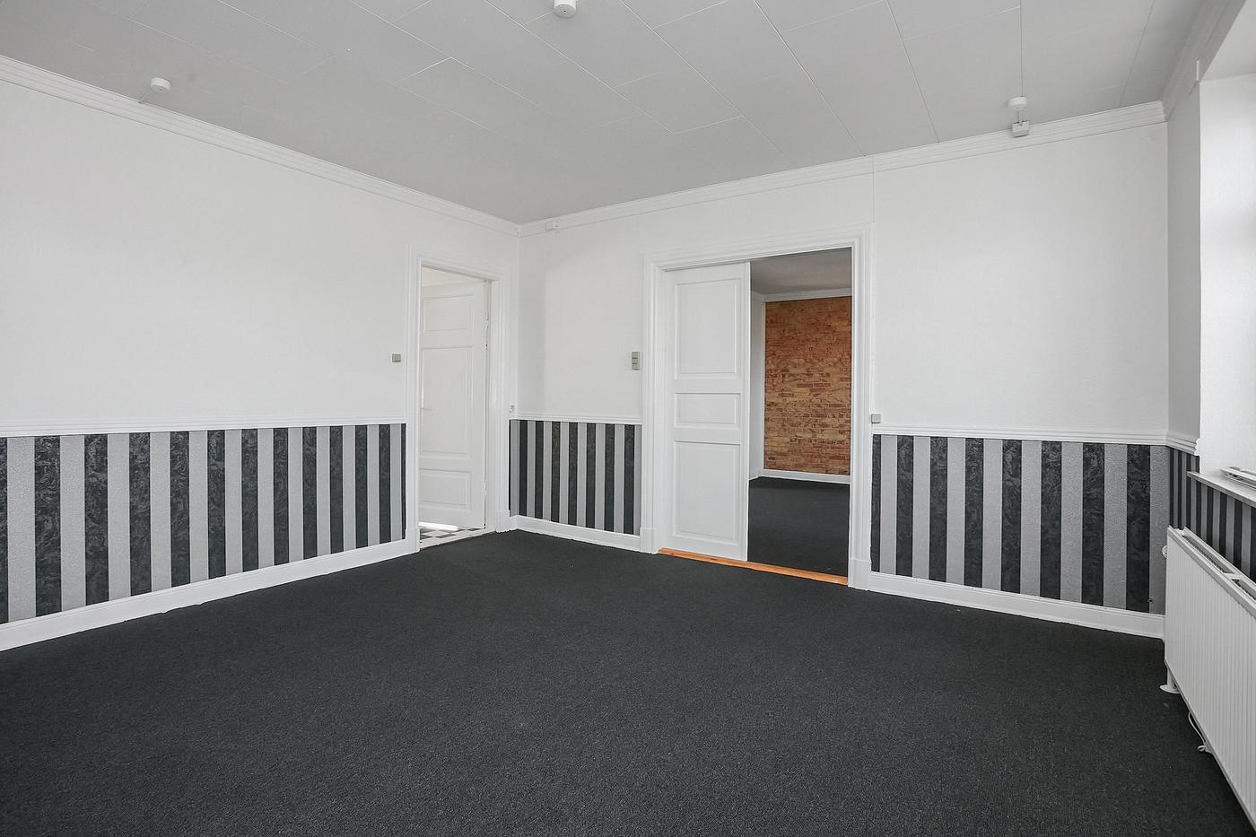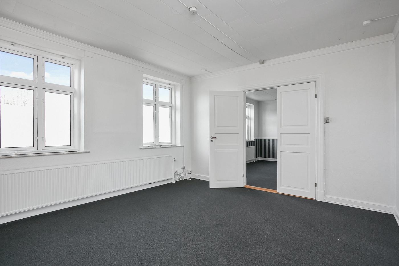 Erhvervslejemålet i stueplan på i alt 126 m² består af stort lokale med receptionsområde og område med mødebord, mødelokale med glasvægge samt toilet og garderobe.