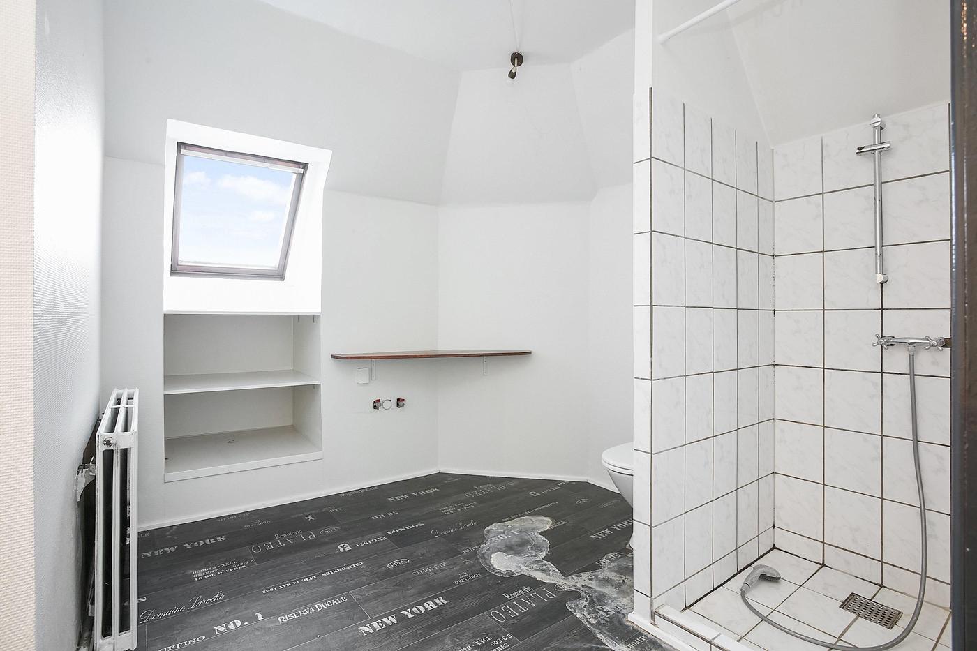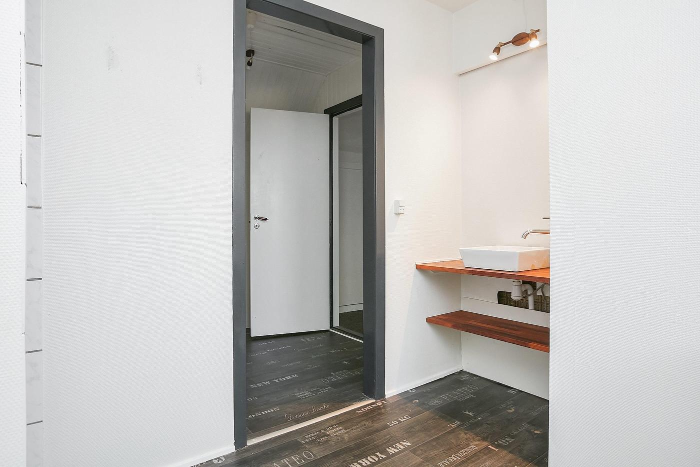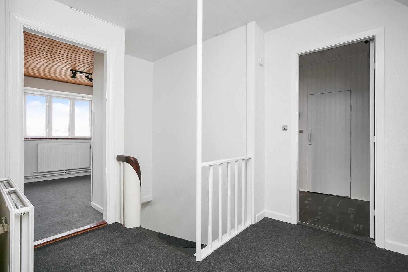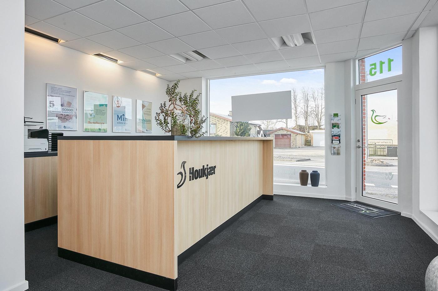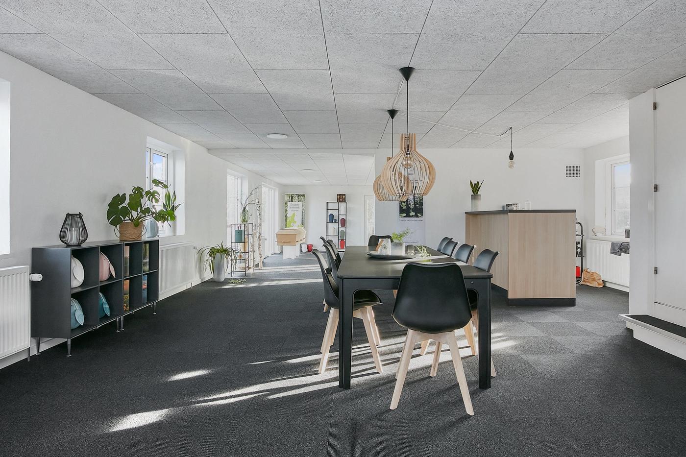 Erhvervslejemålet i stueplan på i alt 126 m² består af stort lokale med receptionsområde og område med mødebord, mødelokale med glasvægge samt toilet og garderobe.