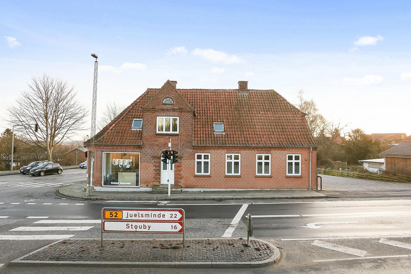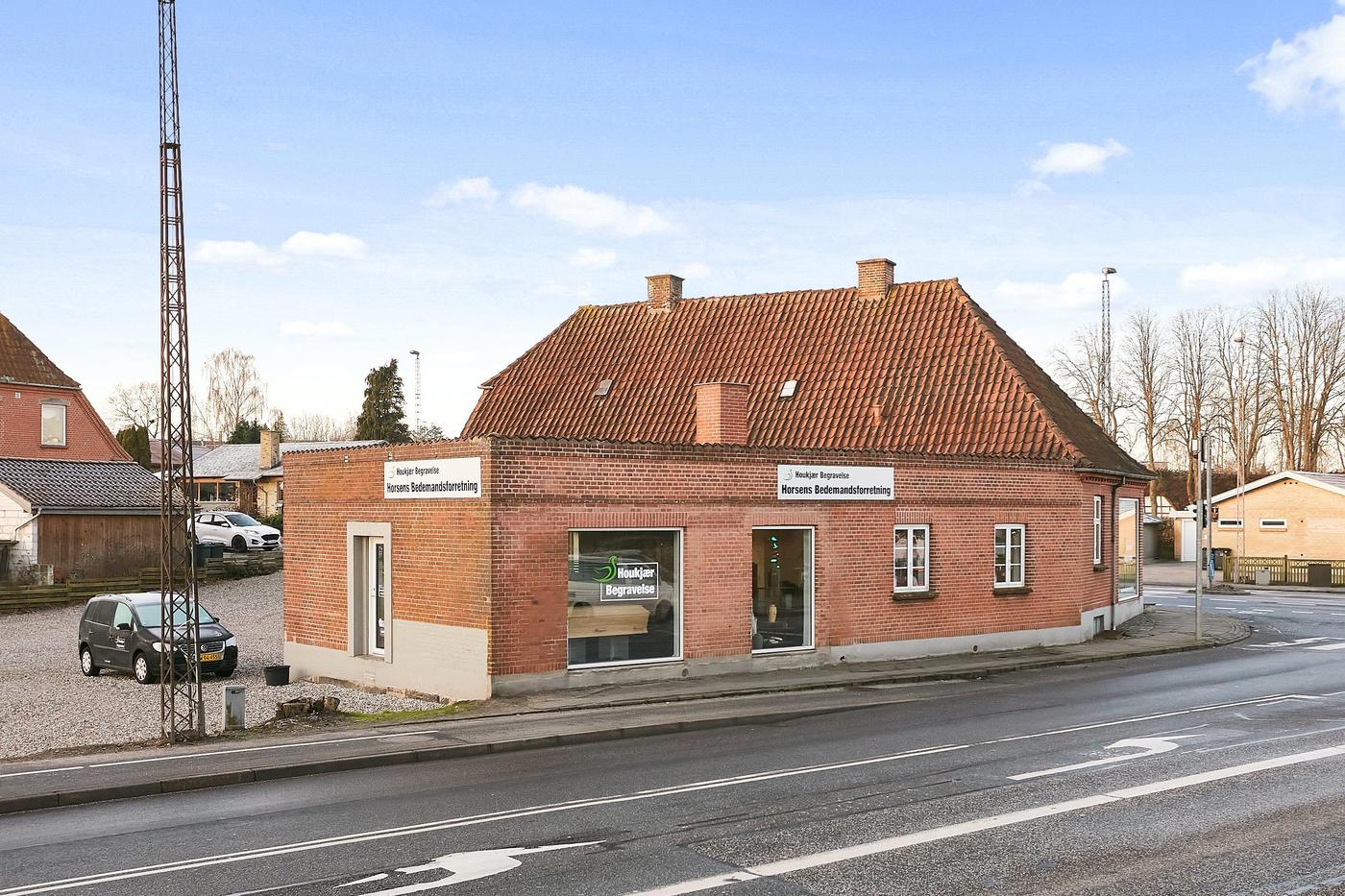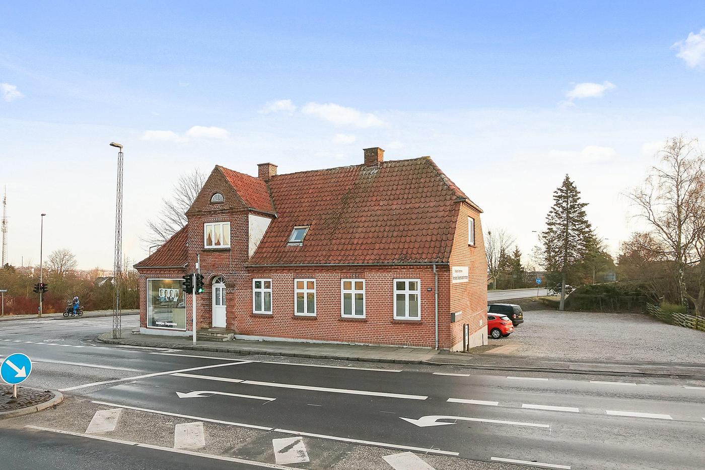 Ejendommen er beliggende på stor hjørnegrund mod lyskryds, og der er således stor synlighed.