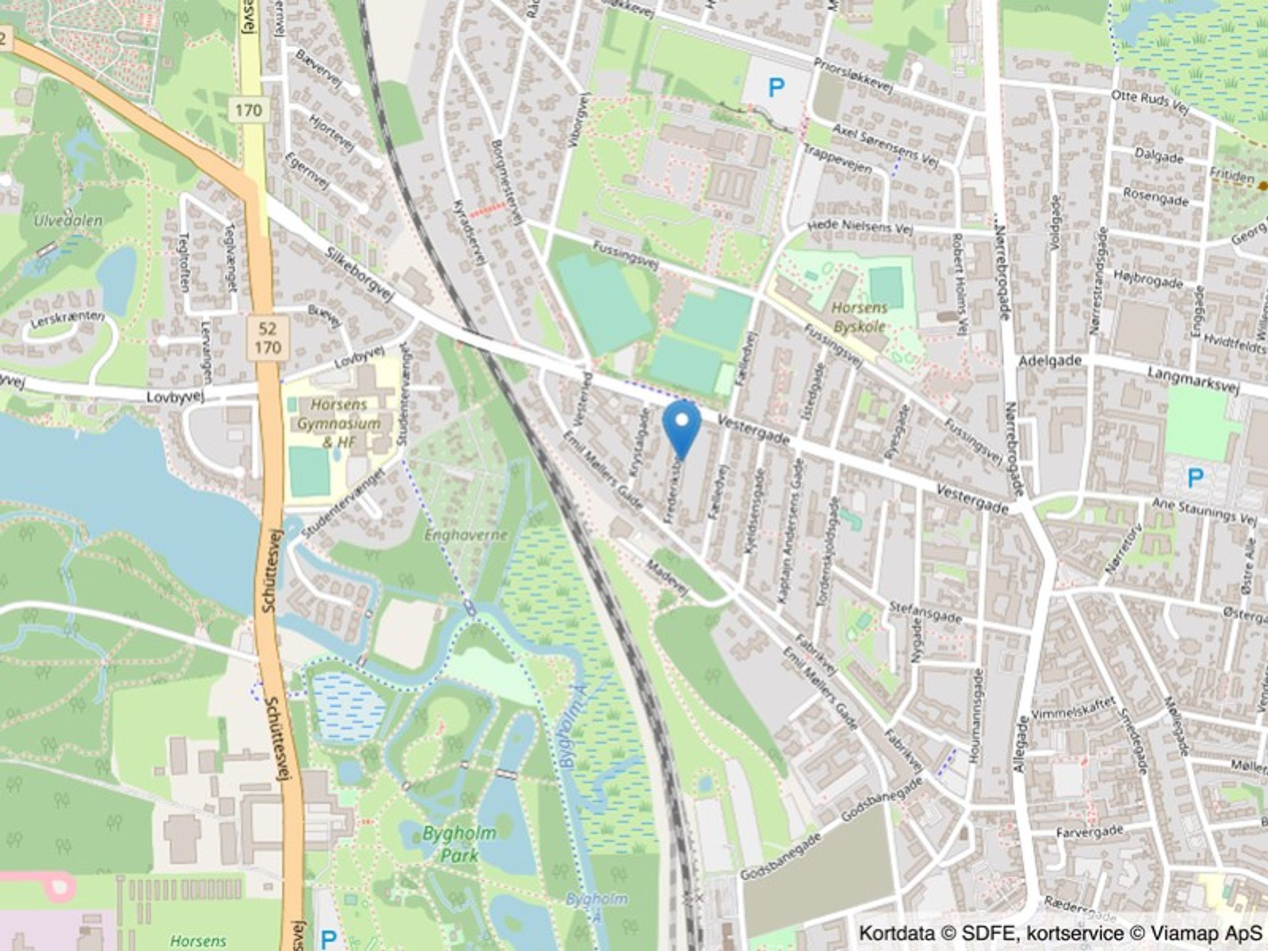 Frederiksberggade 11B er beliggende i den centrale del af Horsens, i Horsens vestlige bydel. Ejendommen ligger tæt på Horsens Centrum, Fængslet, VIA University College, Horsens Gymnasium.