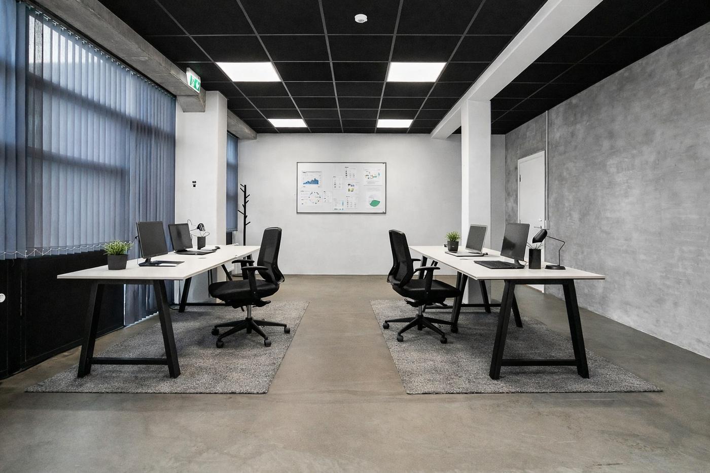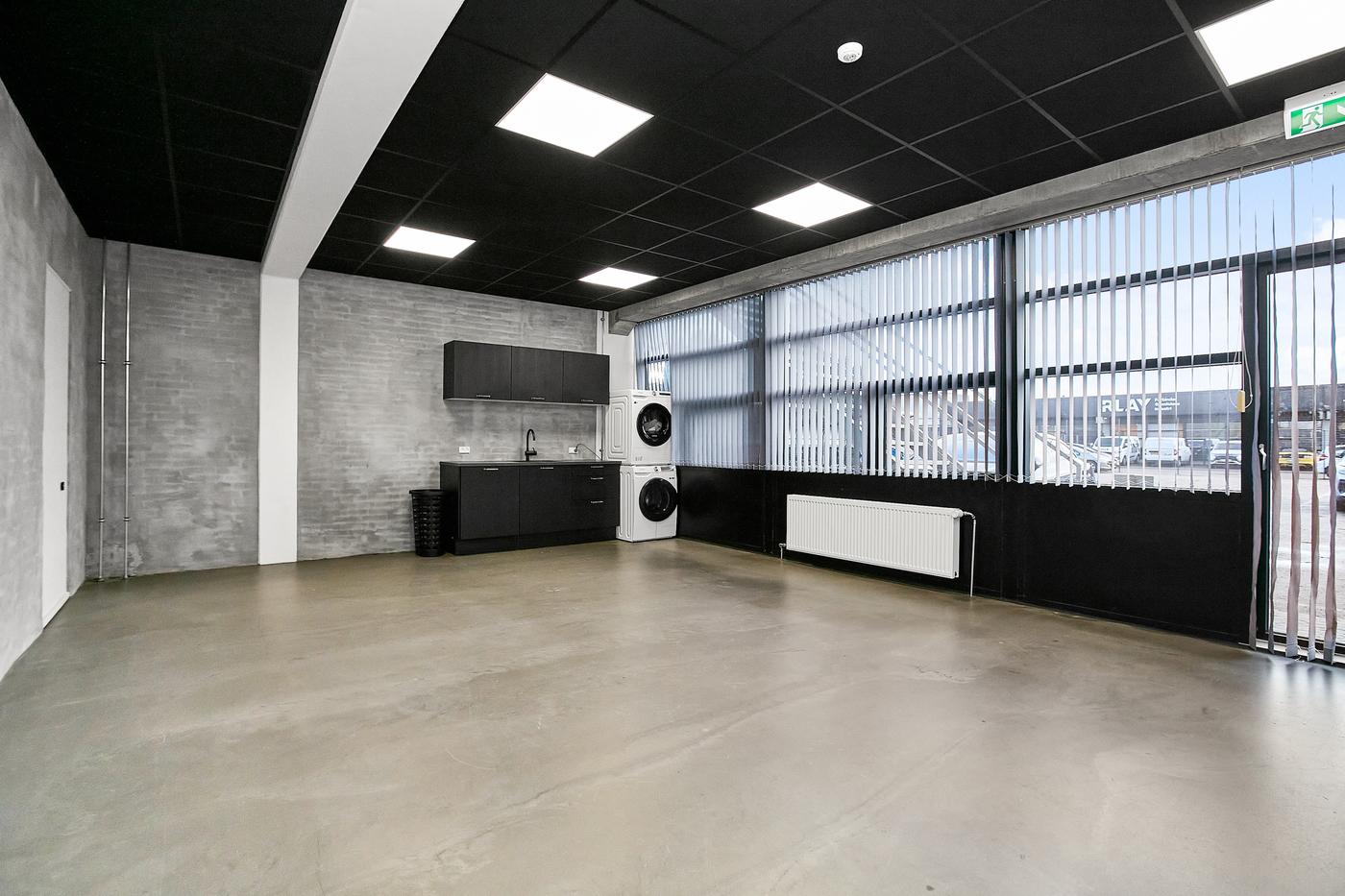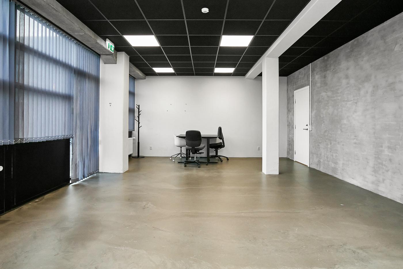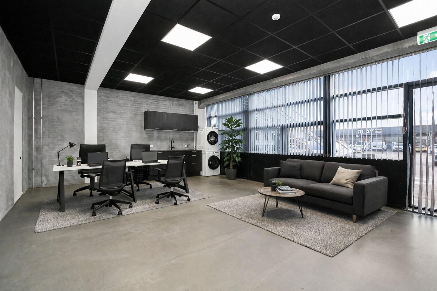 Kontoret har en moderne rå indretning med poleret betongulv og vægge i grå beton-look, samt sort loft med LED-belysning. Kontoret fremstår generelt lyst med en minimalistisk og moderne industriel stil. Kontoret har derudover et mindre tekøkken med sorte skabe samt vaskemaskine og tørretumbler.