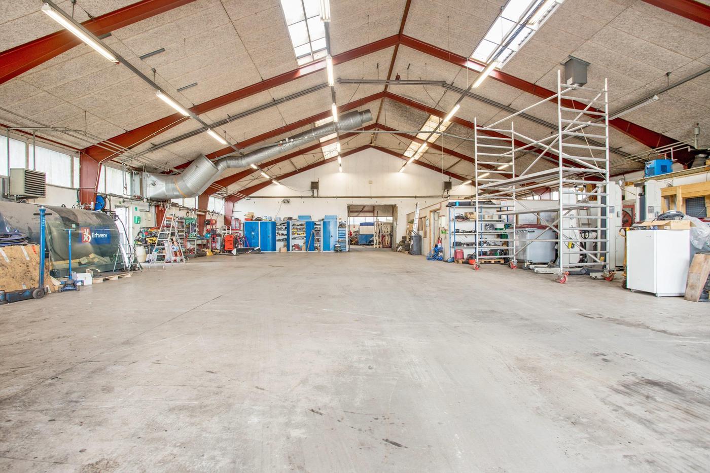 Hal på ca. 503 m² med loftshøjde fra ca. 3,5 til ca. 7 m i kip. Port i gavl ca. 3 m bred og 4,2 m høj. Der er installeret udsugningsanlæg. Der forefindes værkførerkontor.