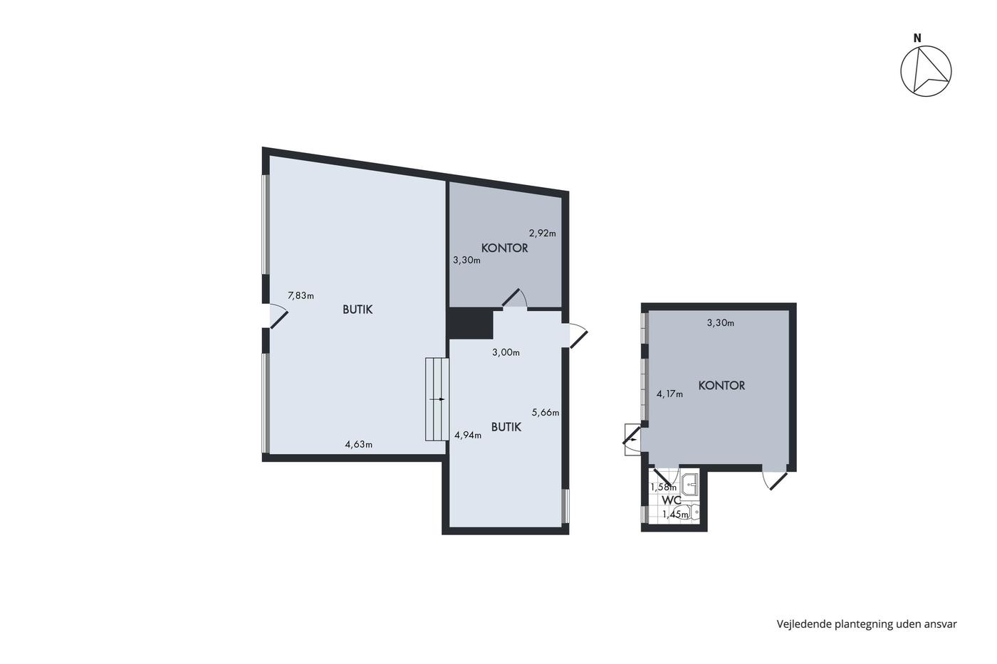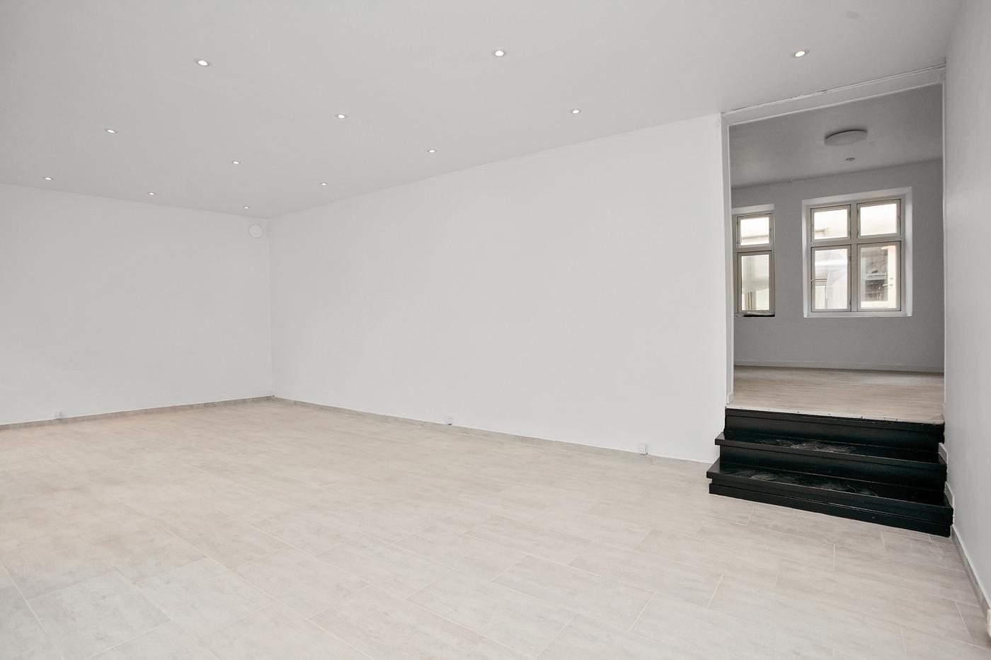 Lejemålet består af: 84 m² i stueplan i forhus indrettet med lyst butikslokale med et par trin op til bagbutik samt køkken. 45 m² lager og toilet i stueetage i baghus.