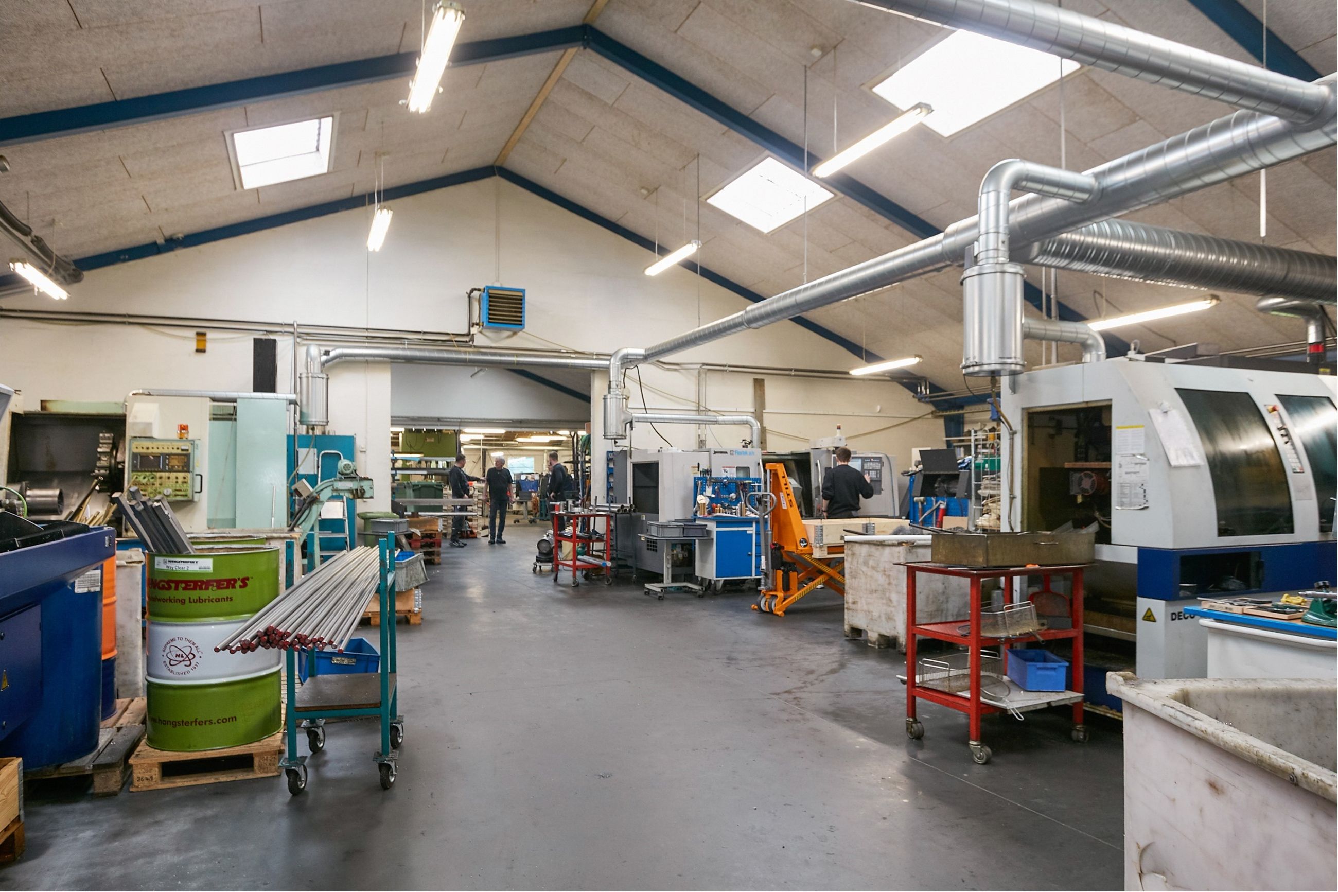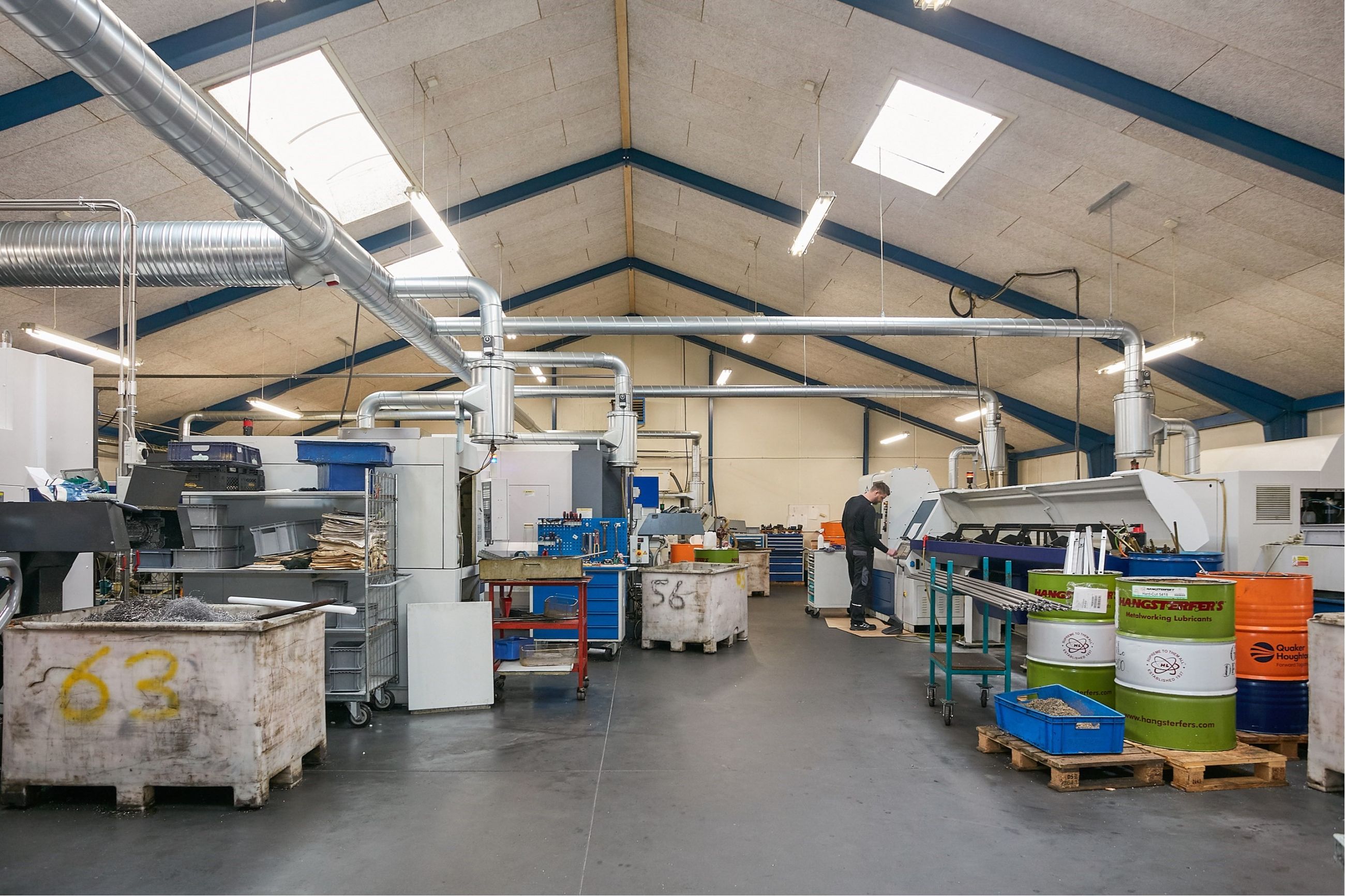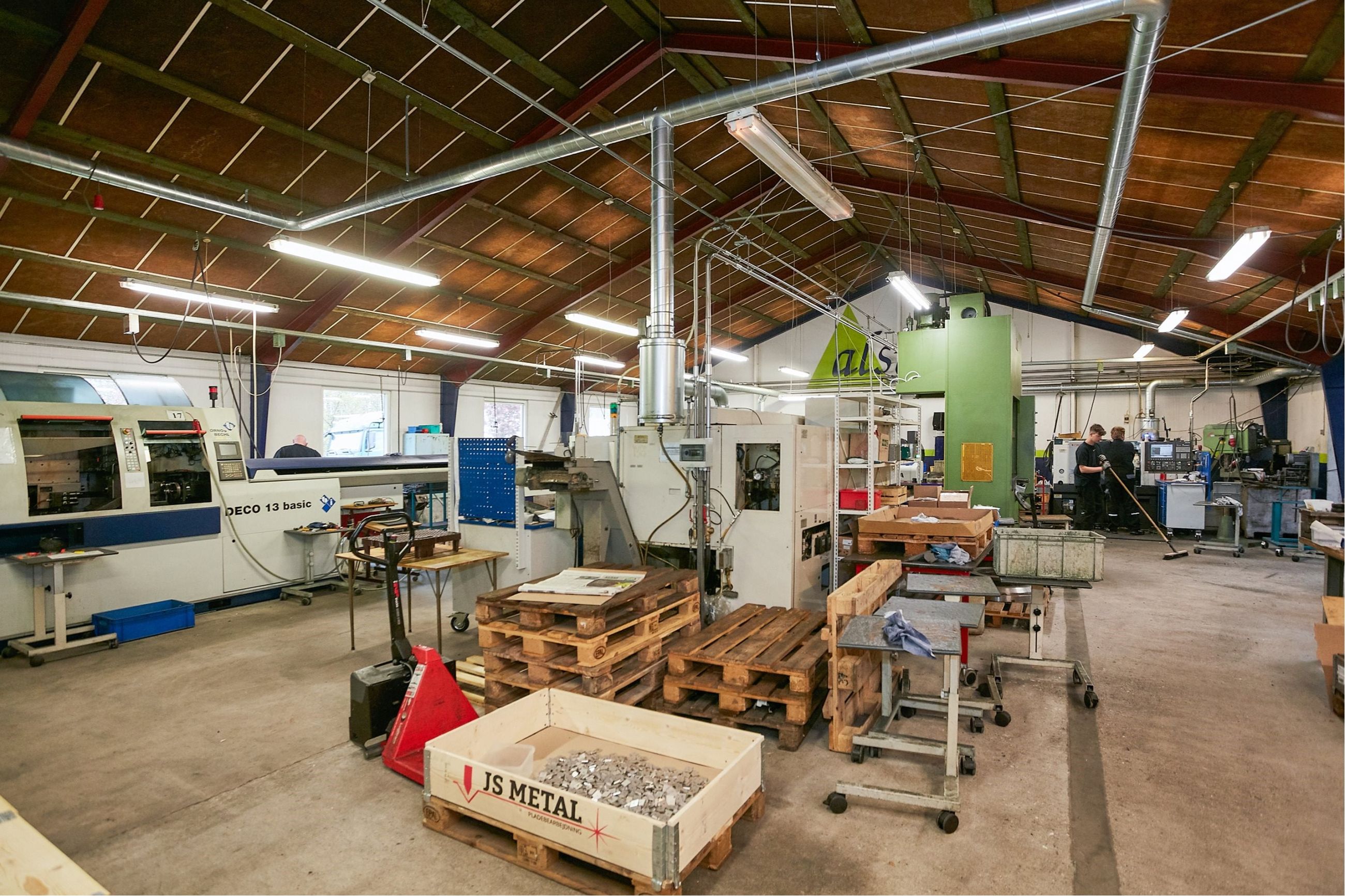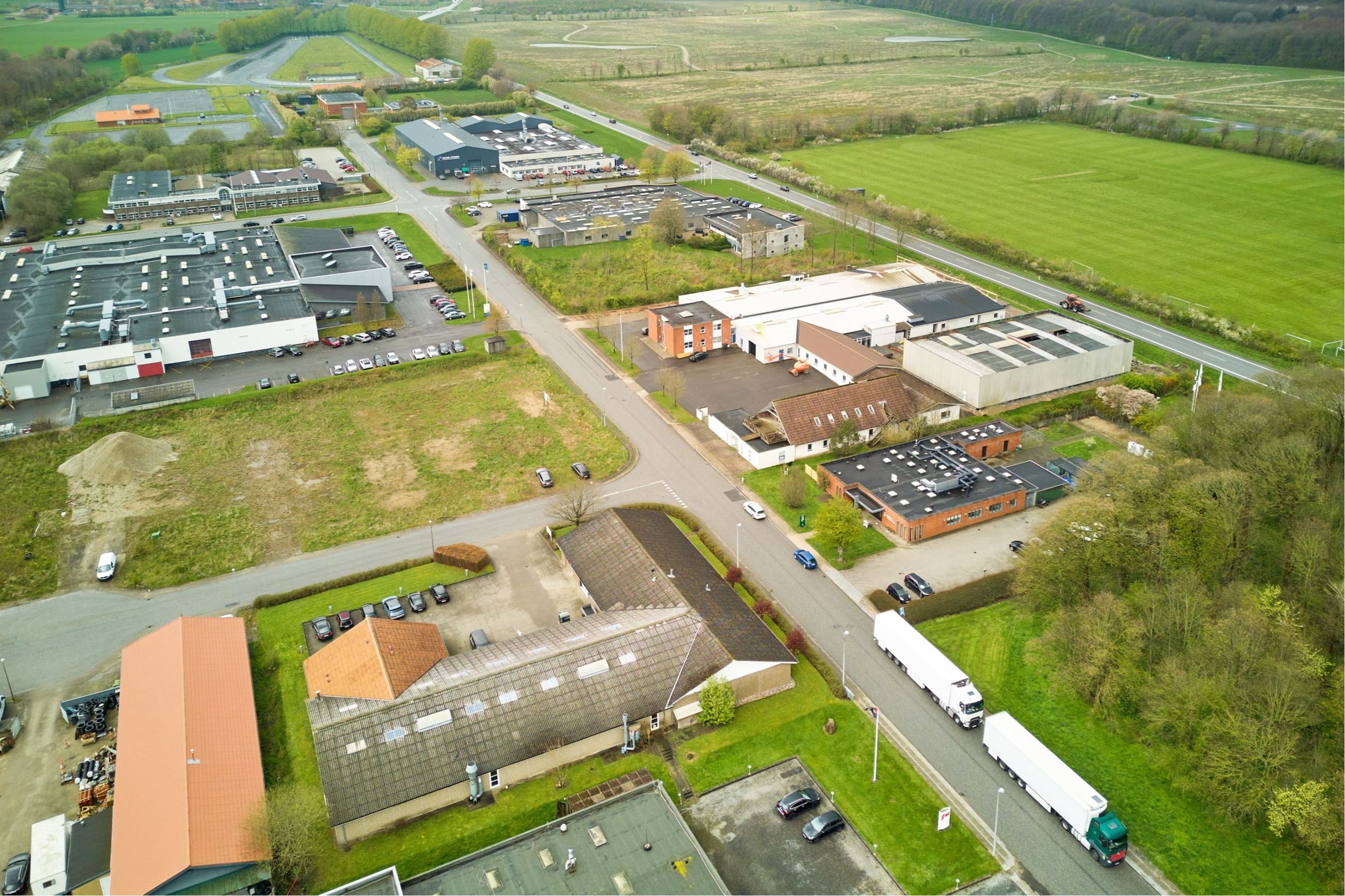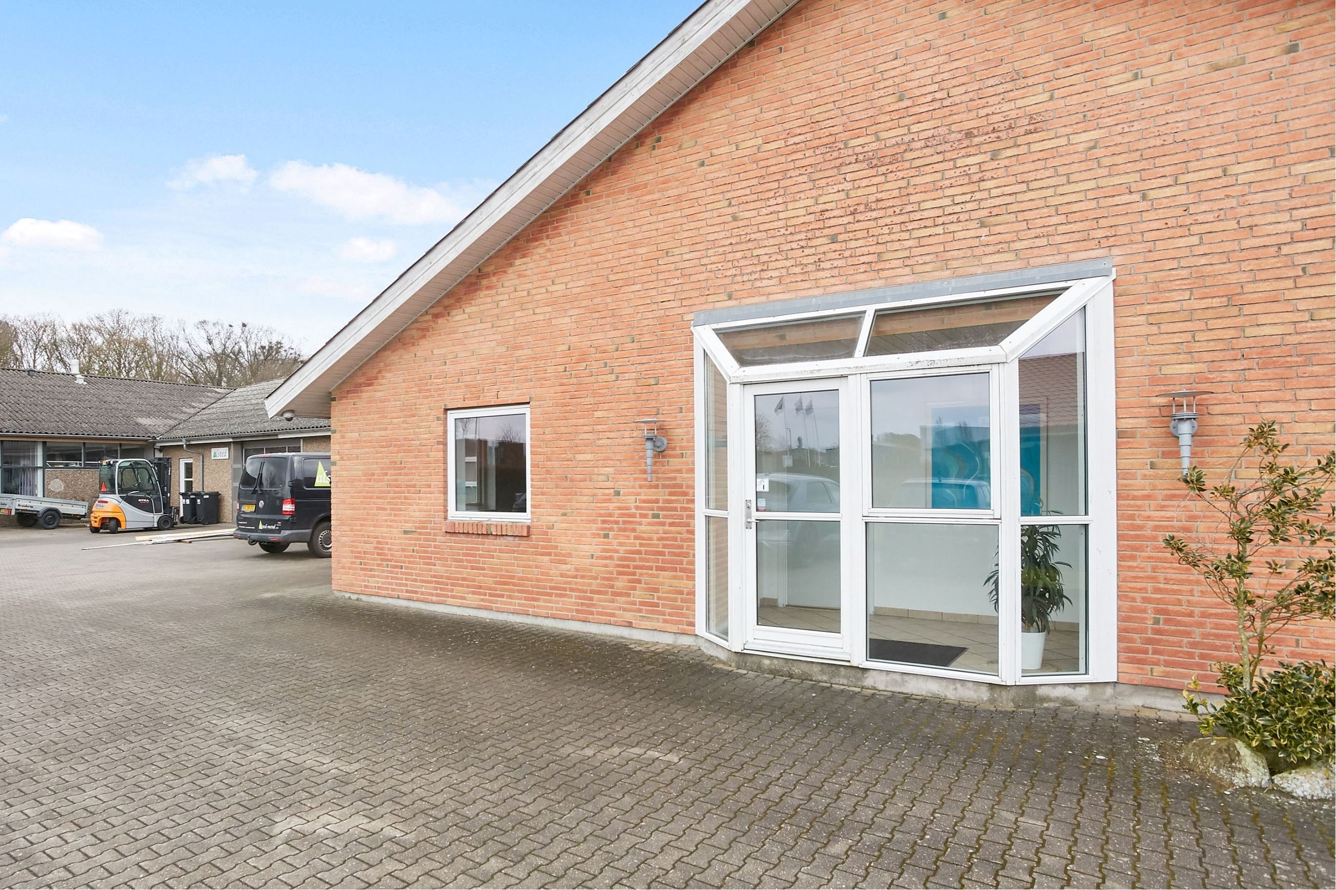 Den opr. bebyggelse på 533 m² er opført i 1979. Der er opført ny produktionshal på 599 m² og administrationsafsnit på 103 m² i 2001. Den opr. bebyggelse består af 2 haller - den ene med bred åbning mod den nyeste bygning og den anden med port. Der forefindes toilet og bad. Den nyeste værkstedsbygning er opdelt i 2 enheder, hver med ca. 3,6 m bred port. Lofthøjde i haller fra ca. 3 m i siderne til ca. 6 m i kip (se vedlagte skitse). Fint administrationsafsnit med indgangsparti, 2 kontorer, toilet, frokoststue, 2 omklædnings/baderum med tilhørende toiletter.