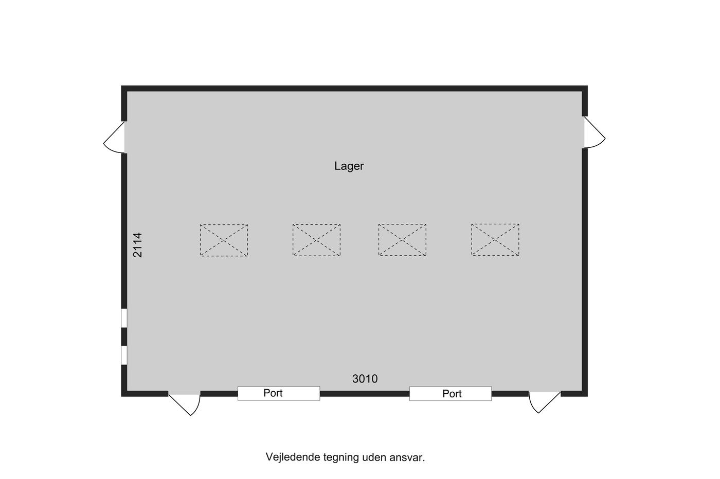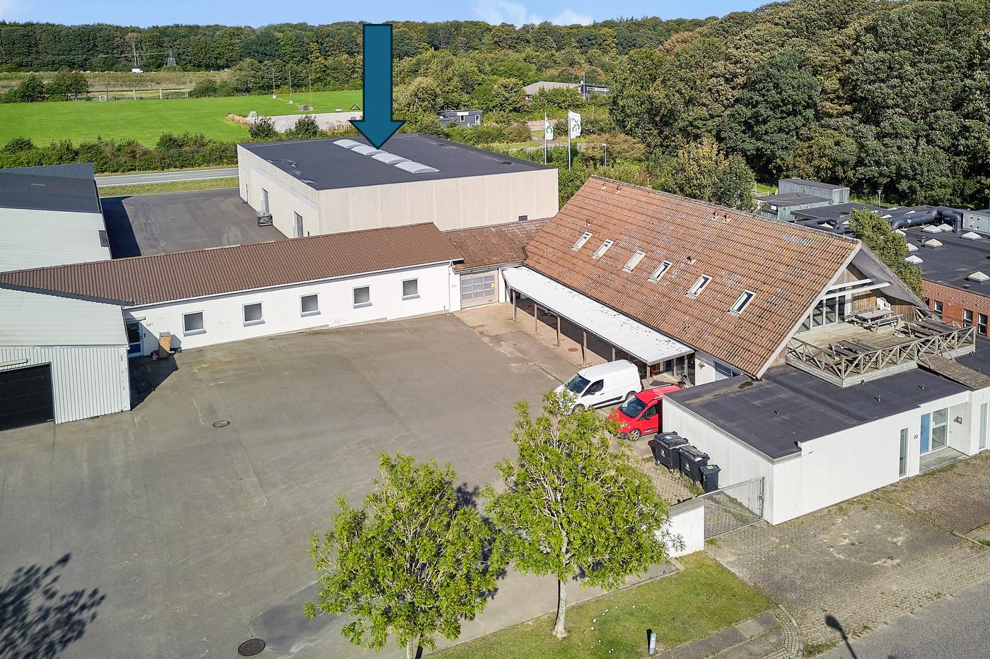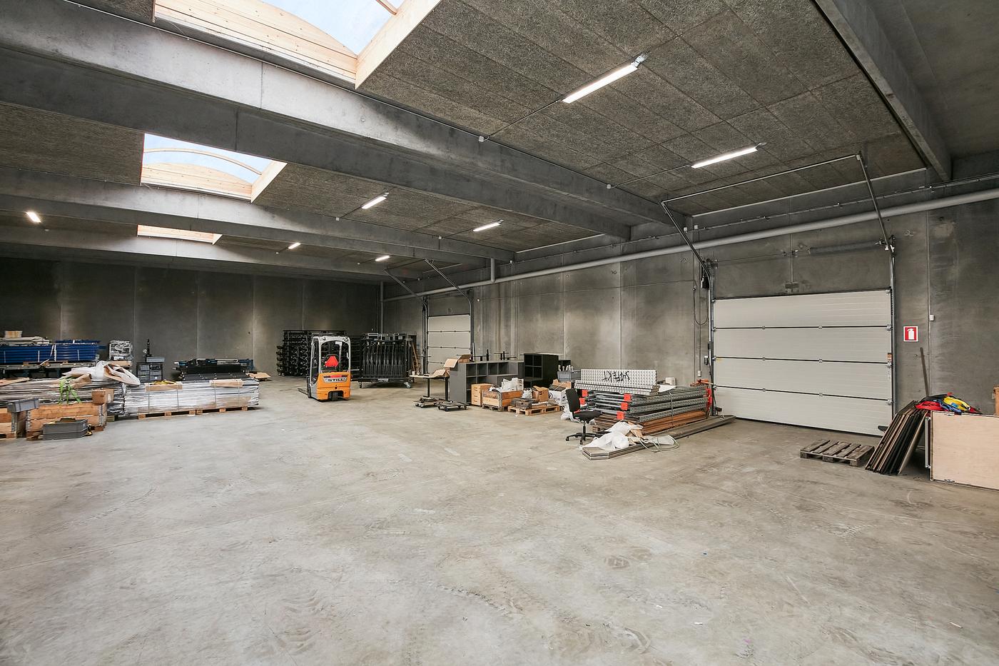 Den helt reelle hal på 800 m² fremstår lys og rigtig pæn. Der er to porte. Loftshøjde 5,0 meter til underkant TT-elementer.