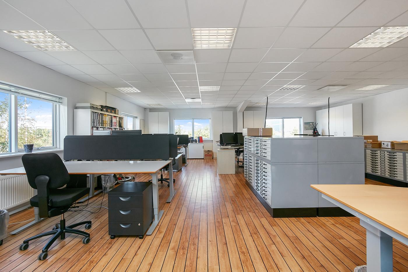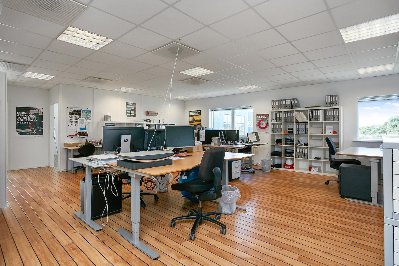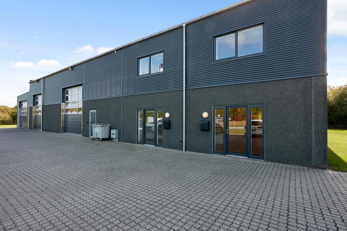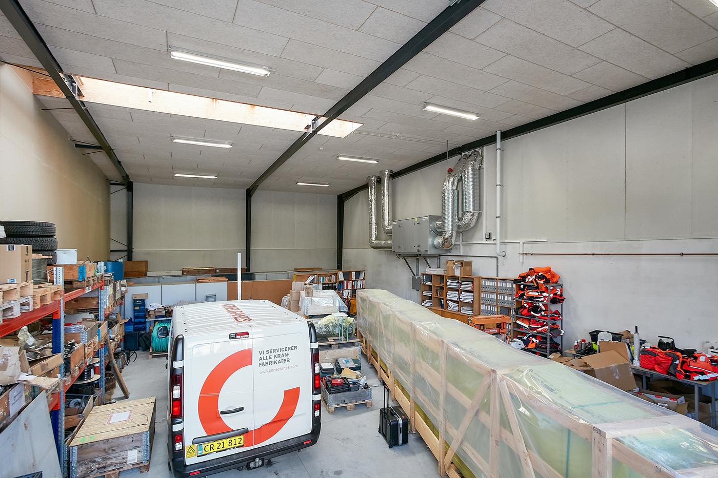 Lejemålet består af: Lagerhal på ca. 200 m² samt kontorafsnit på 1.sal på 195 m². Der er direkte adgang/indendørs adgang mellem kontor og lagerhal samt selvstændig indgang til kontorafsnit på 1.sal, som består af åbent kontorlandskab, møderum, frokostrum med thekøkken, 2 toiletter, hvoraf det ene er med bad. Flotte kontorlokaler med skibsplankegulve.