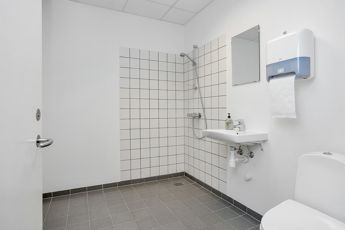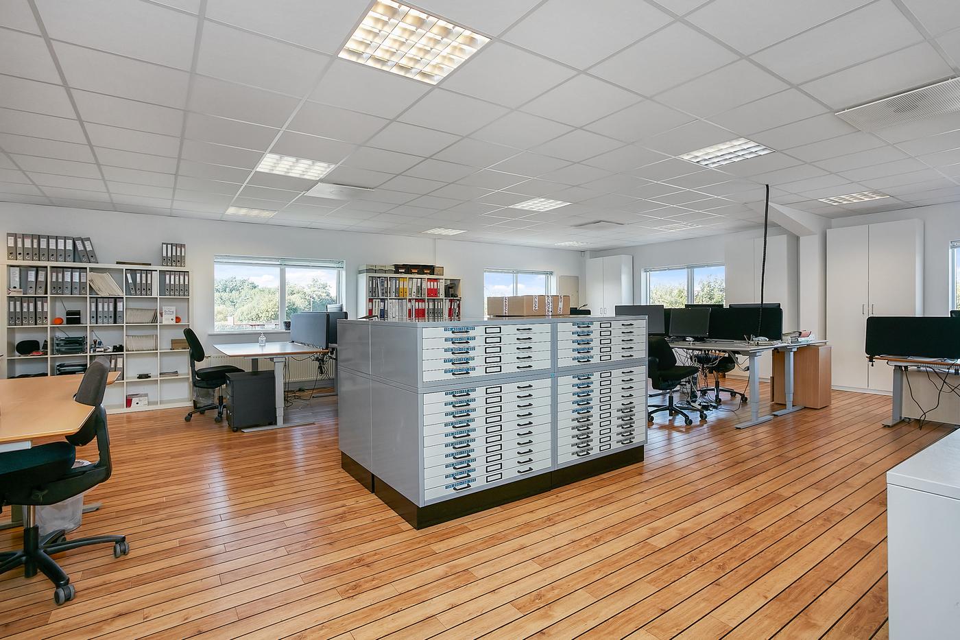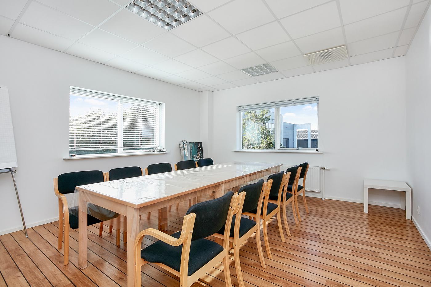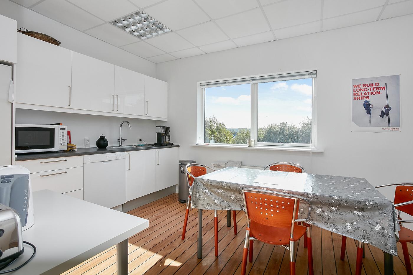 Lejemålet består af: Lagerhal på ca. 200 m² samt kontorafsnit på 1.sal på 195 m². Der er direkte adgang/indendørs adgang mellem kontor og lagerhal samt selvstændig indgang til kontorafsnit på 1.sal, som består af åbent kontorlandskab, møderum, frokostrum med thekøkken, 2 toiletter, hvoraf det ene er med bad. Flotte kontorlokaler med skibsplankegulve.