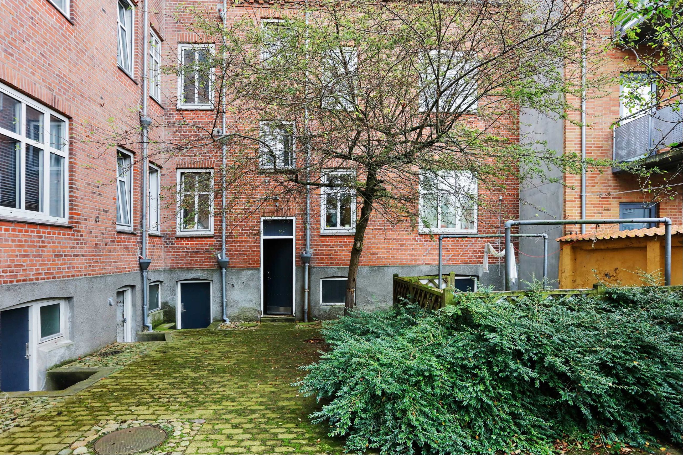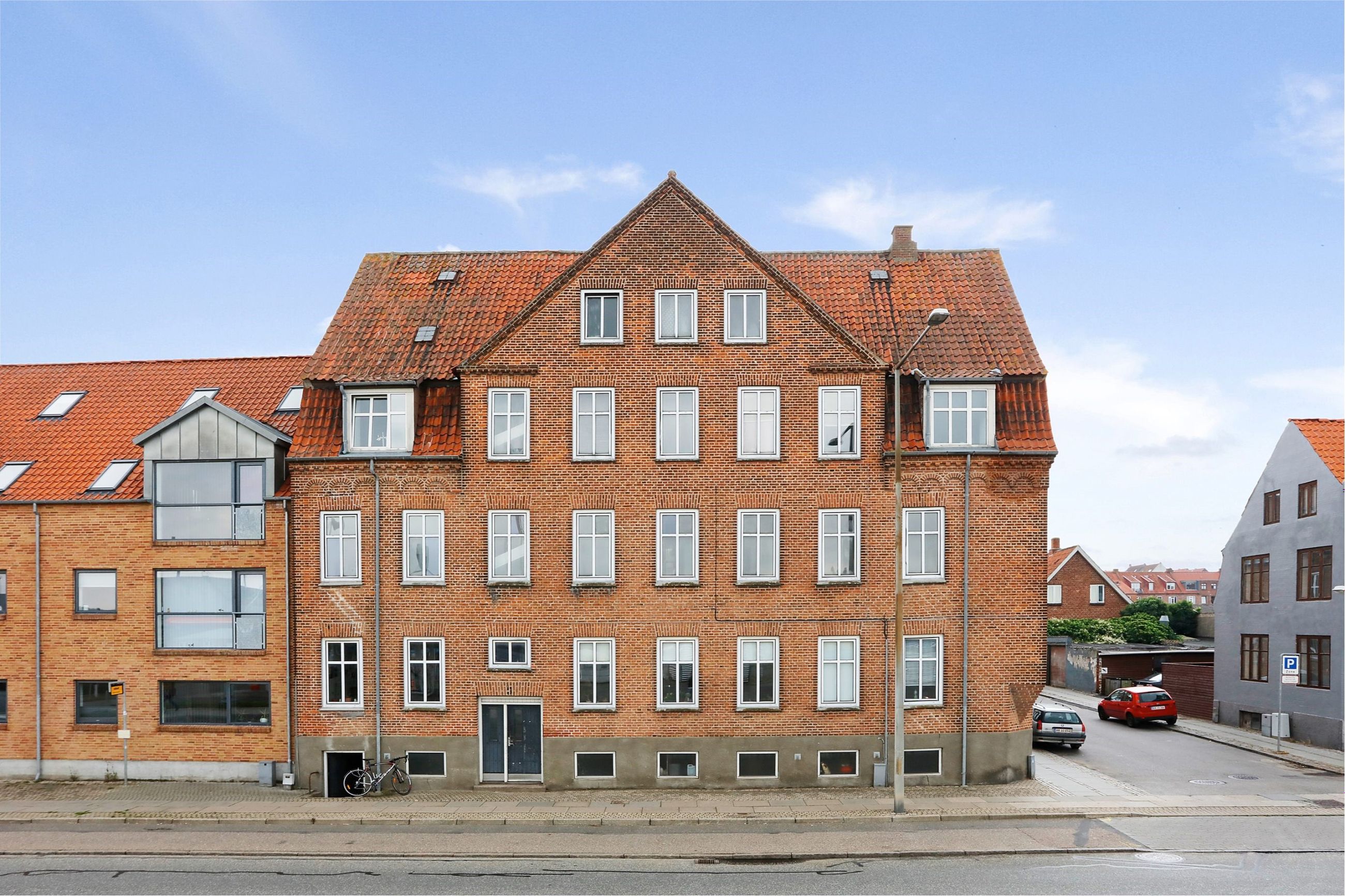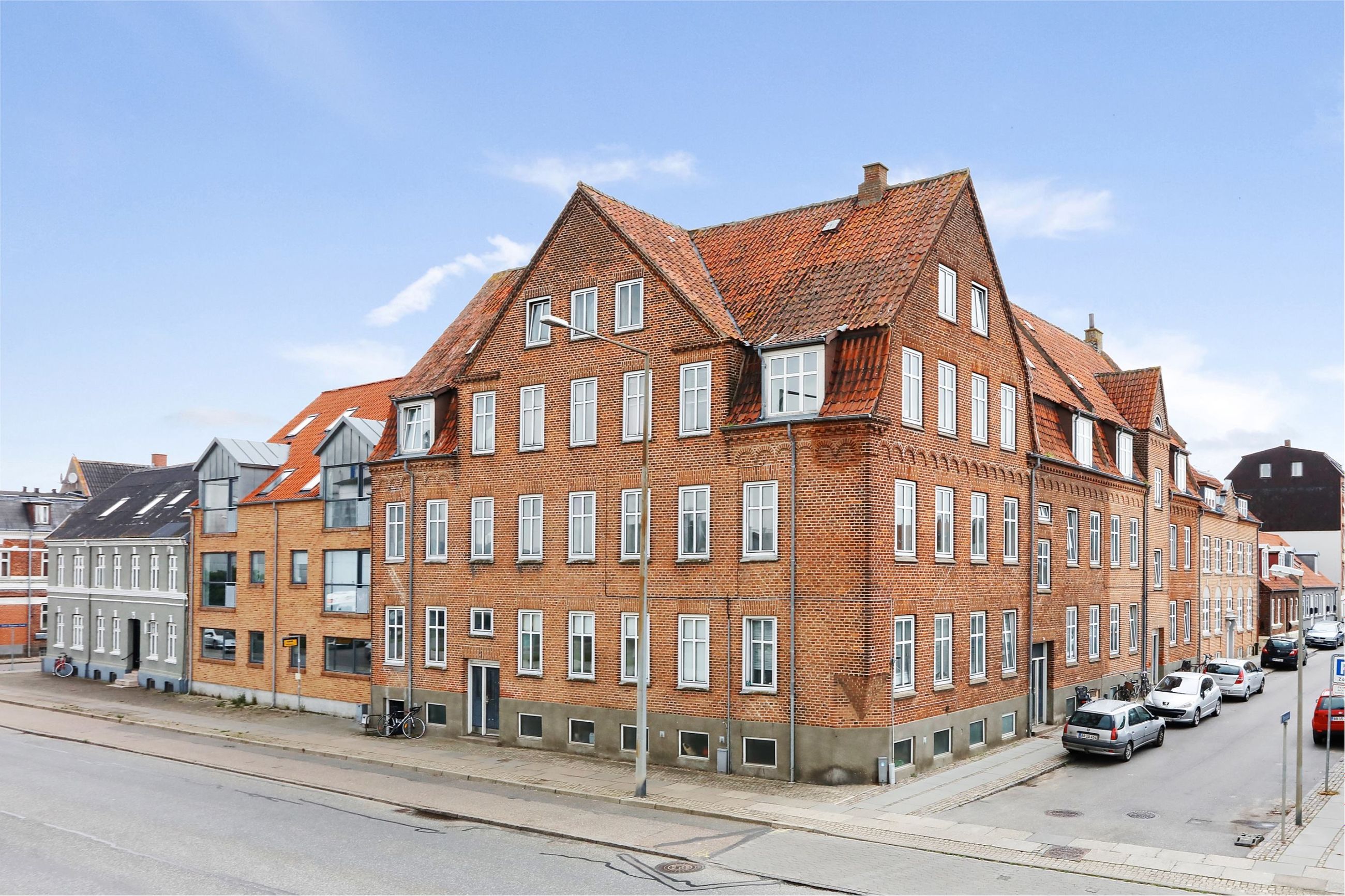 Markant og arkitektonisk flot rødstensejendom beliggende på hjørnet af Niels Gyldings Gade og Strandgade.