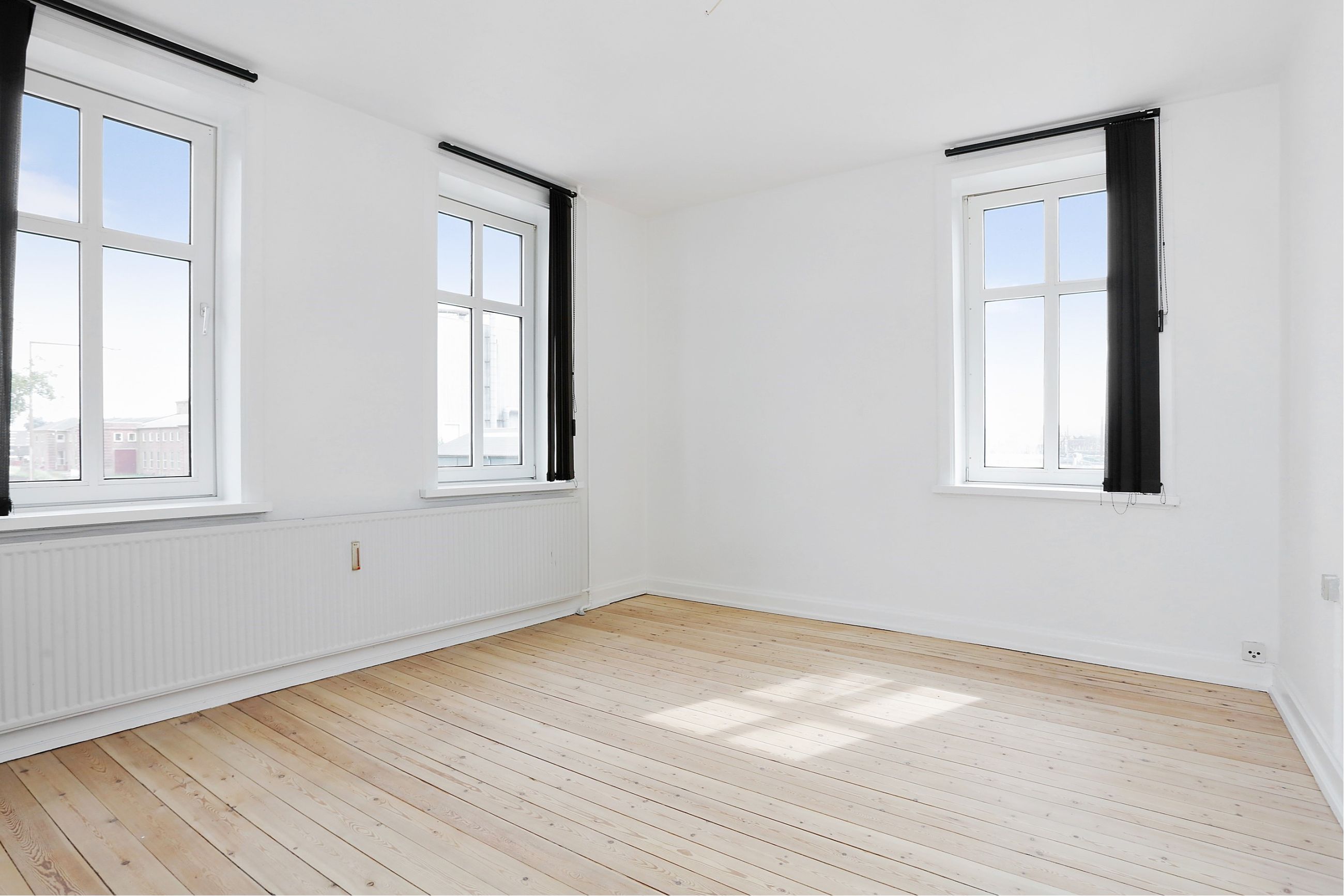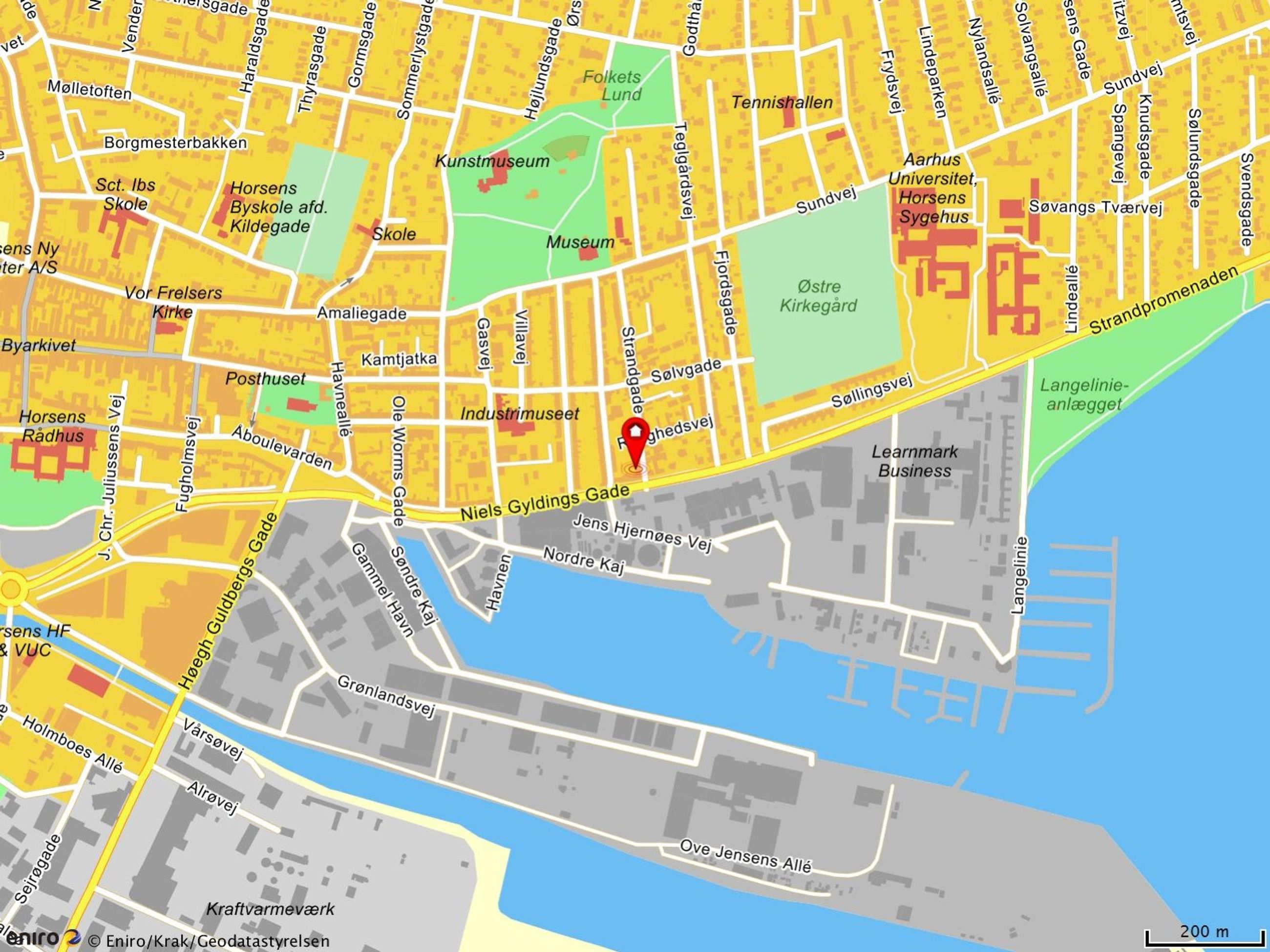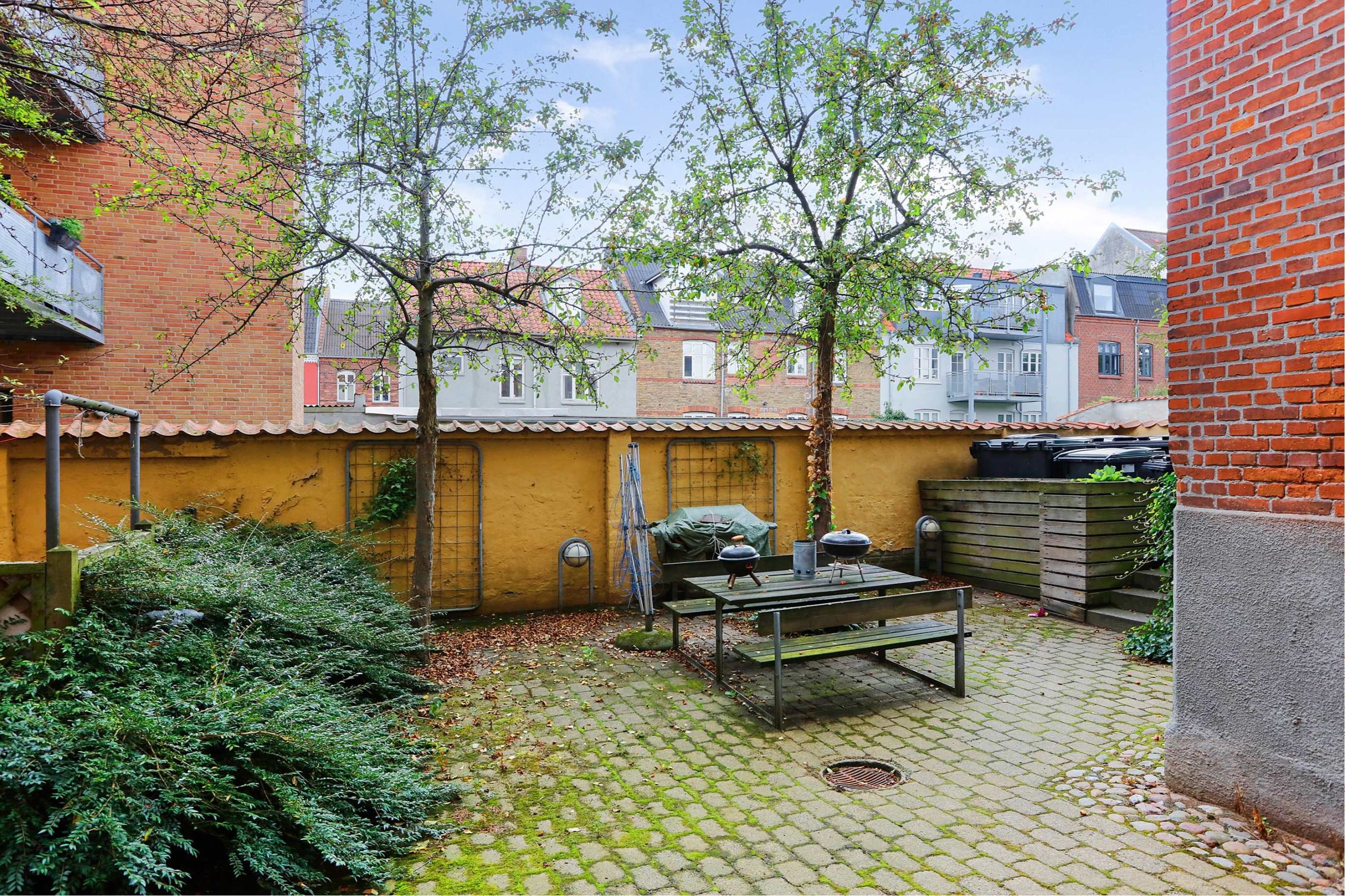 Markant og arkitektonisk flot rødstensejendom beliggende på hjørnet af Niels Gyldings Gade og Strandgade.