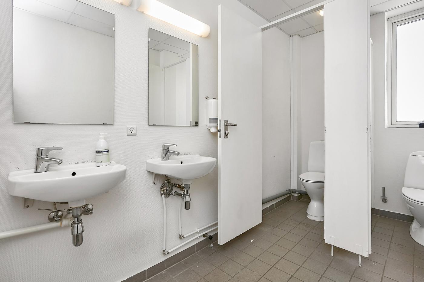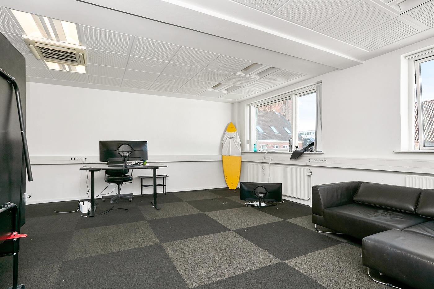 Derudover indeholder lejemålet et moderne køkken med hvide elementer og god skabsplads samt to separate toiletter. Ønskes yderligere plads, er der mulighed for at udvide lejemålet med et ekstra kontorlokale på ca. 30 m² i nabobygningen. Dette rum er ligeledes belagt med tæppegulv og er velegnet som møderum, projektkontor eller ekstra arbejdsstation. Ved samlet leje udgør kontorarealet ca. 102 m² fordelt på to nærliggende kontorrum. Begge enheder ligger centralt i Horsens med nem adgang til gågaden, indkøbsmuligheder, cafe- og spisesteder samt offentlig transport.