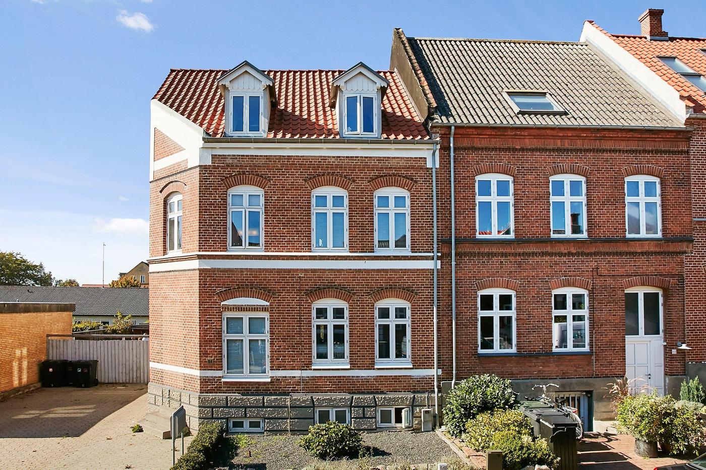 Stuelejlighed på ca. 78 m² bestående af: entre, 2 sammenhængende stuer, spisekøkken, baggang, badeværelse og soveværelse. Lejlighed på ca. 110 m² i 2 plan (65 m² på 1.sal og 45 m² tagetage). 1.sal indeholder: entre, 2 sammenhængende stuer, spisekøkken med udgang til tagterrassse, bagindgang og badeværelse. I tagetagen forefindes 3 værelser og badeværelse med hjørnebadekar. I kælderen forefindes vaskerum, toilet og div. disp. rum. Kælderen er med klinkegulv. Der er i 2015 installeret Drymat System, som afhjælper fugt i kælderen. Investering kr. 94.250.