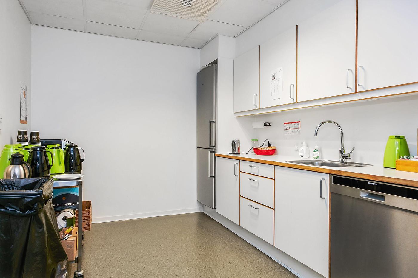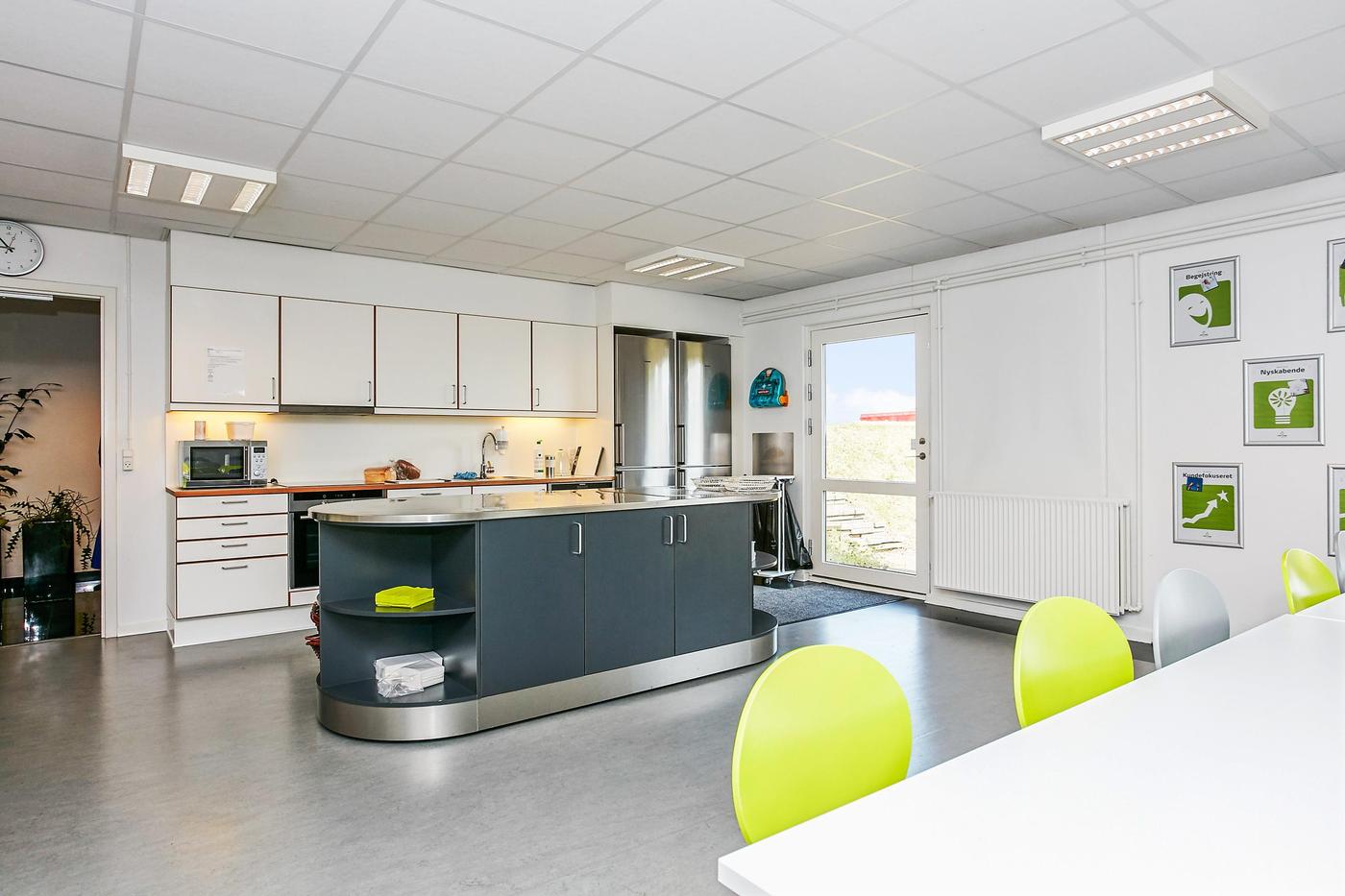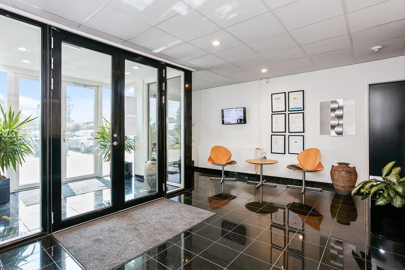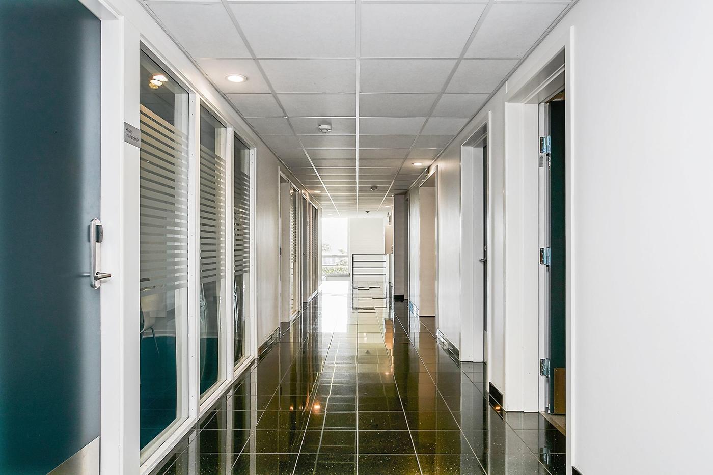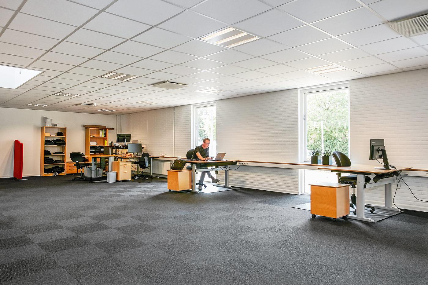 Det ledige lejemål på 487,5 m² incl. 76,1 m² andel af fællesarealer indeholder bl.a. pænt vindfang, reception med adgang til 2 store åbne kontorer med printerrum samt 3 mindre kontorer. Via fælles gang er der adgang til 4 fælles toiletter samt thekøkken. I underetagen er der fælles flot kantine.
