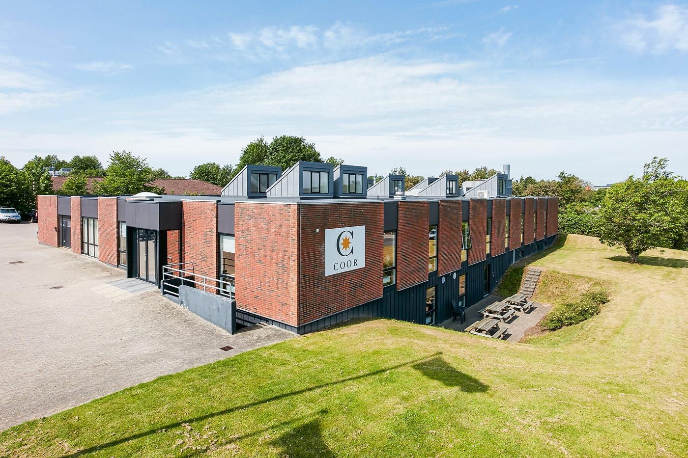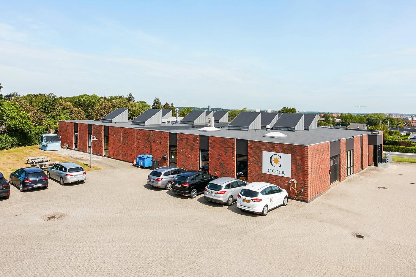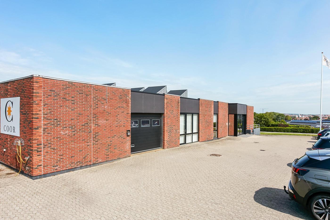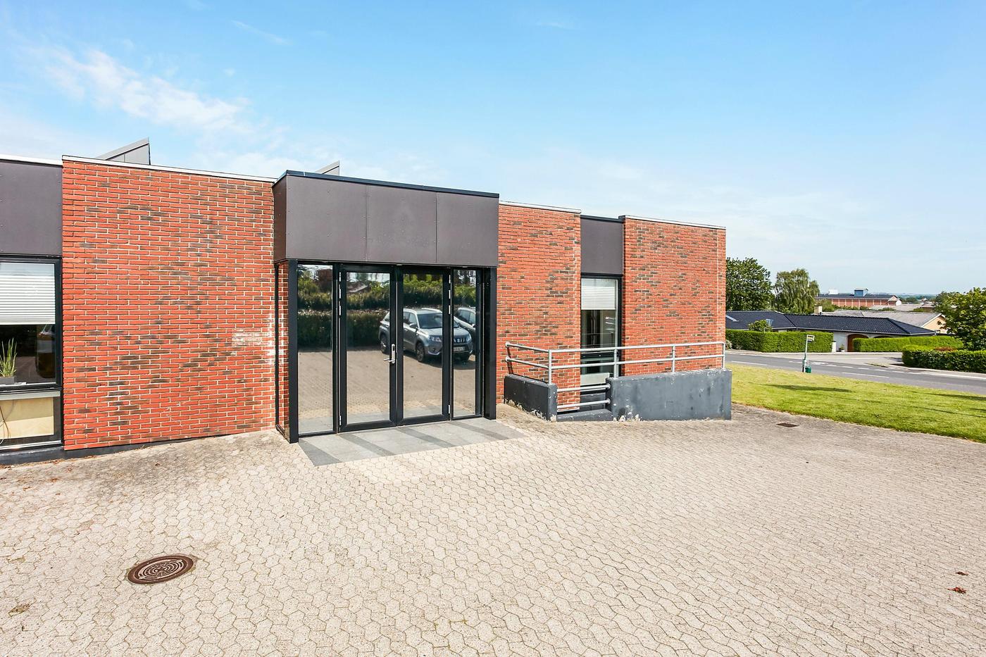 Del af særdeles velholdt ejendom opført i 1984 og indvendig gennemgribende renoveret i 2011, herunder med mange flotte ovenlysvinduer. Taget er netop renoveret i 2019. Ejendommen er velbeliggende i mindre erhvervsområde i den sydlige bydel, nær omfartsvejen og kun få km fra motorvejstilkørsel, og har meget synlig facadebeliggenhed mod den stærkt trafikerede Strandkærvej.