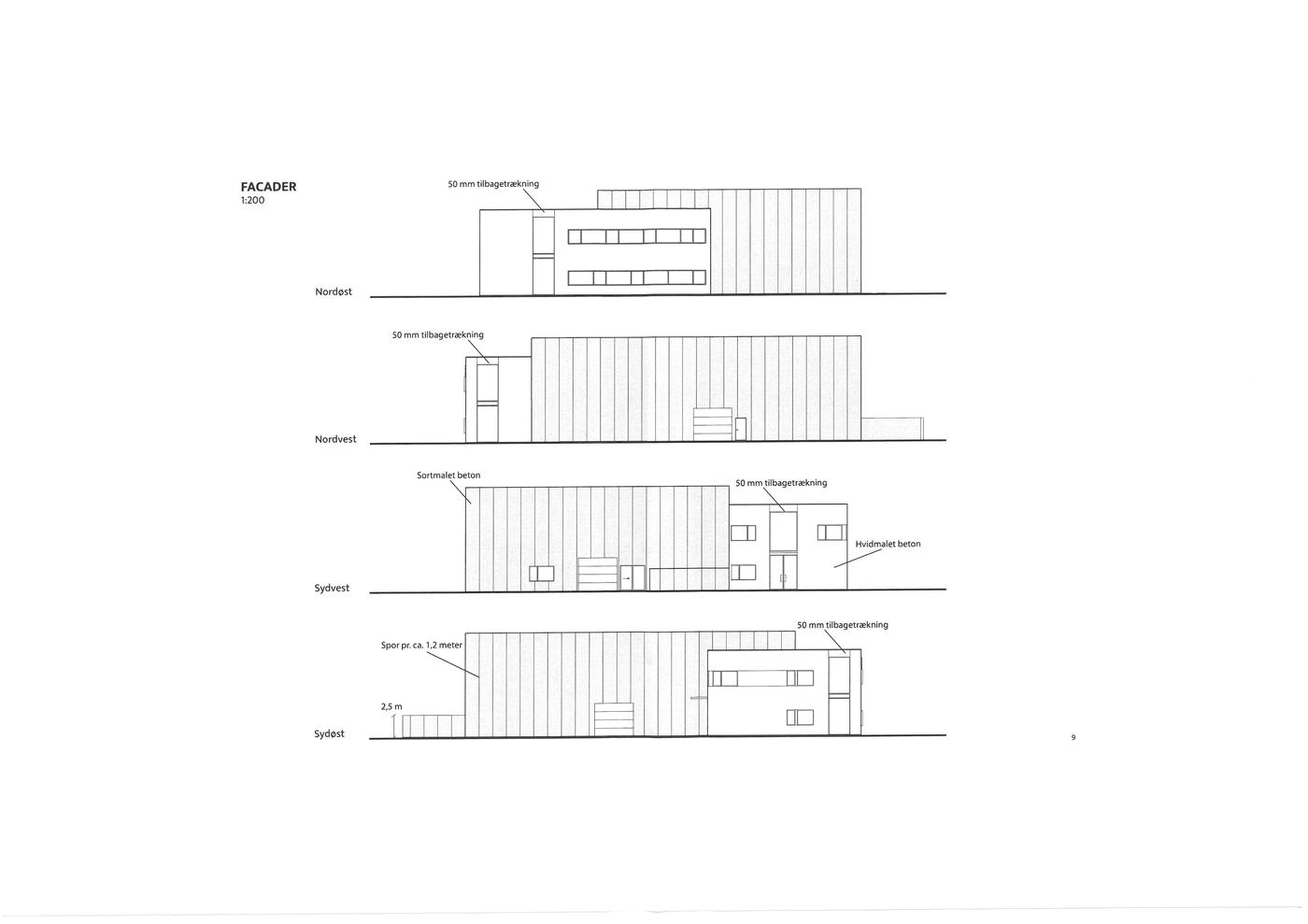 Hal i sortmalet beton og kontorafsnit i hvidmalet beton. Facader på administrationsbygning kan dog evt. opføres i grå teglsten med spil - se vedhæftede foto af anden af udlejer opført ejendom på adressen Rosenkrantzvej 20.