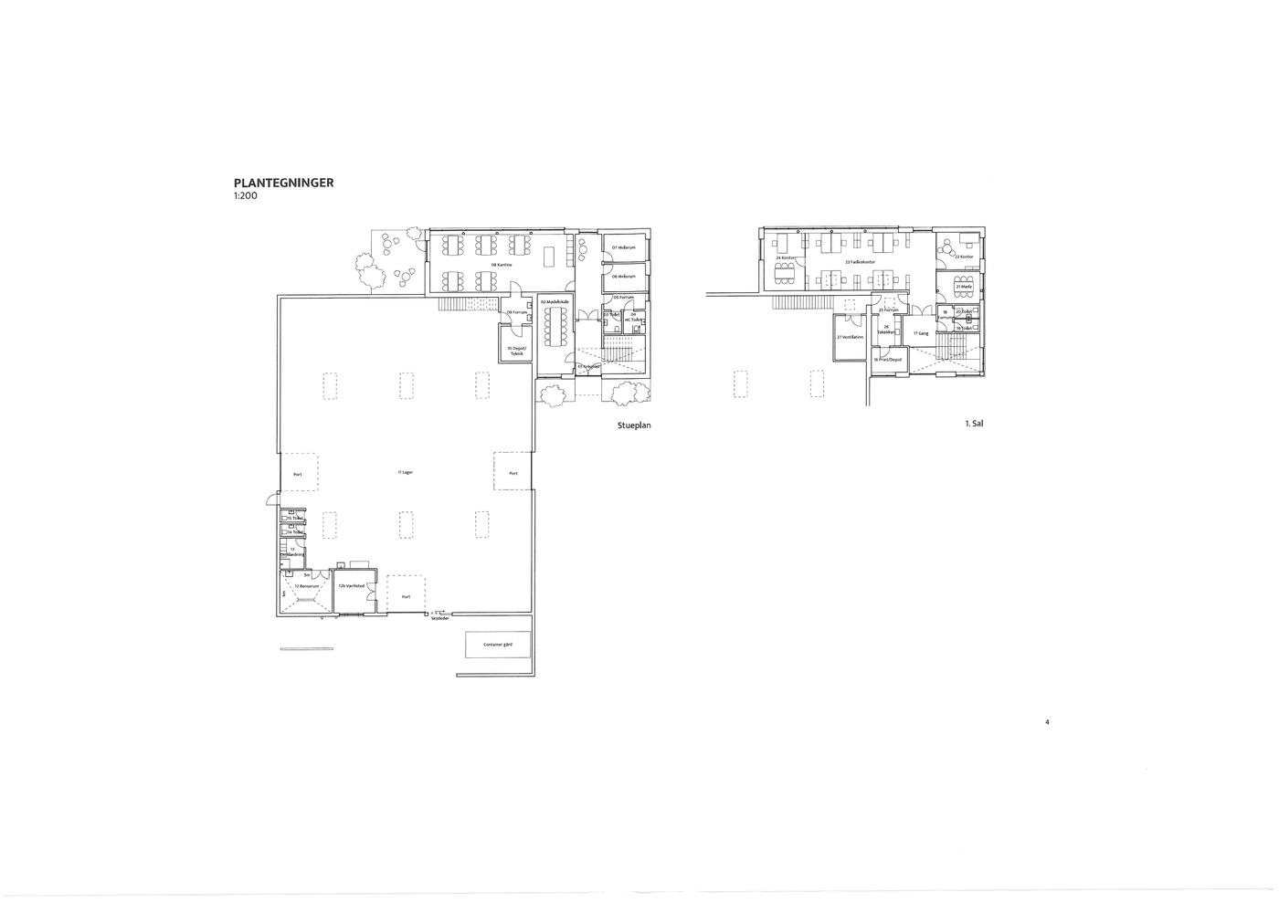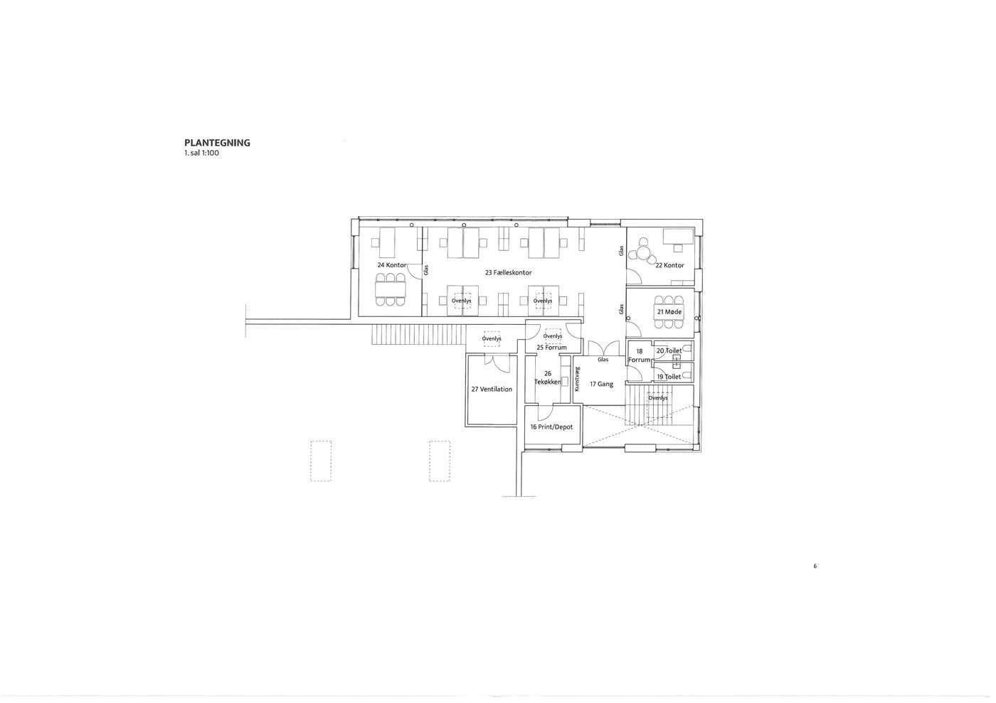Administrationsafsnit på 200 m² på 1.sal indrettes med storrumskontor, mødelokale, 2 kontorer, toiletrum med 2 toiletter, tekøkken, printerrum og ventilationsrum.