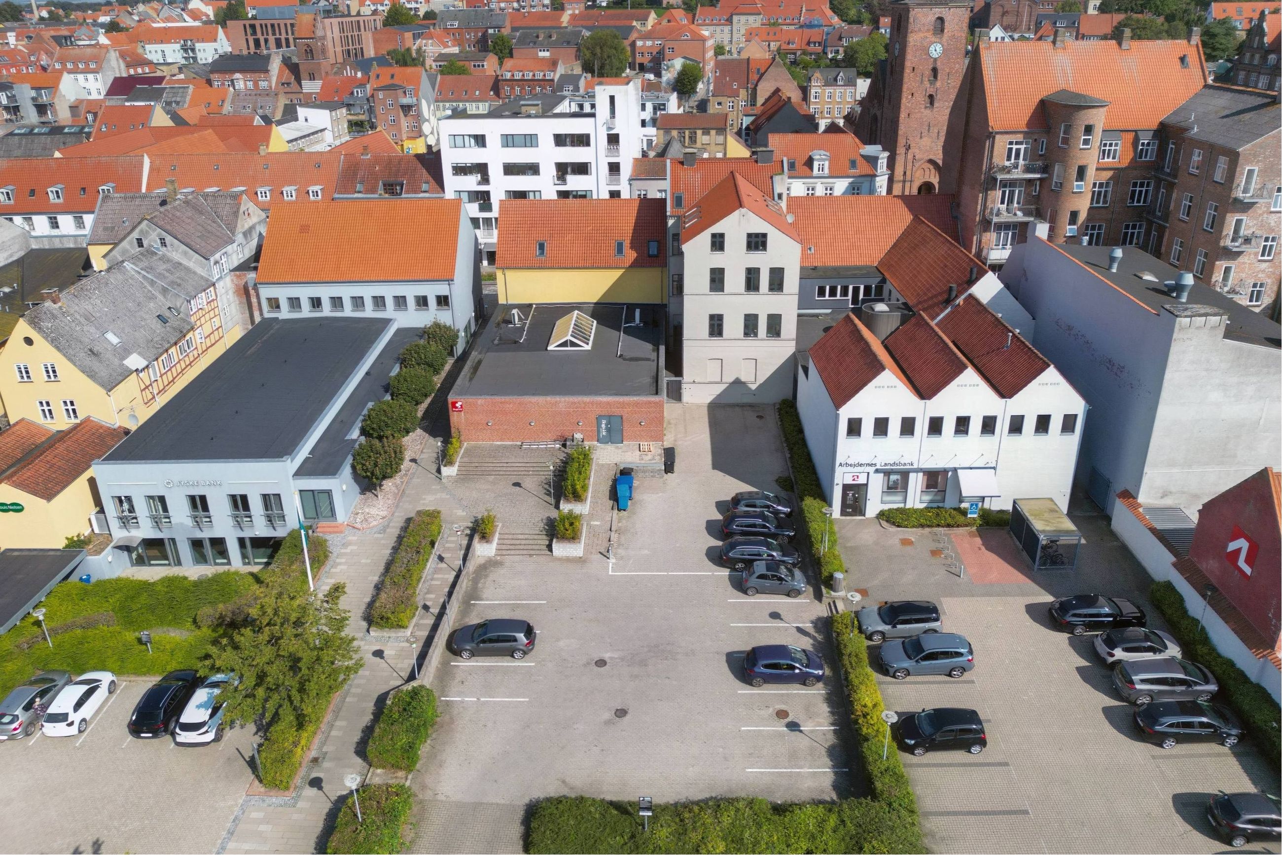 Der er 11 p-pladser på ejendommen. Tilkørsel til parkeringsarealet sker fra Åboulevarden.