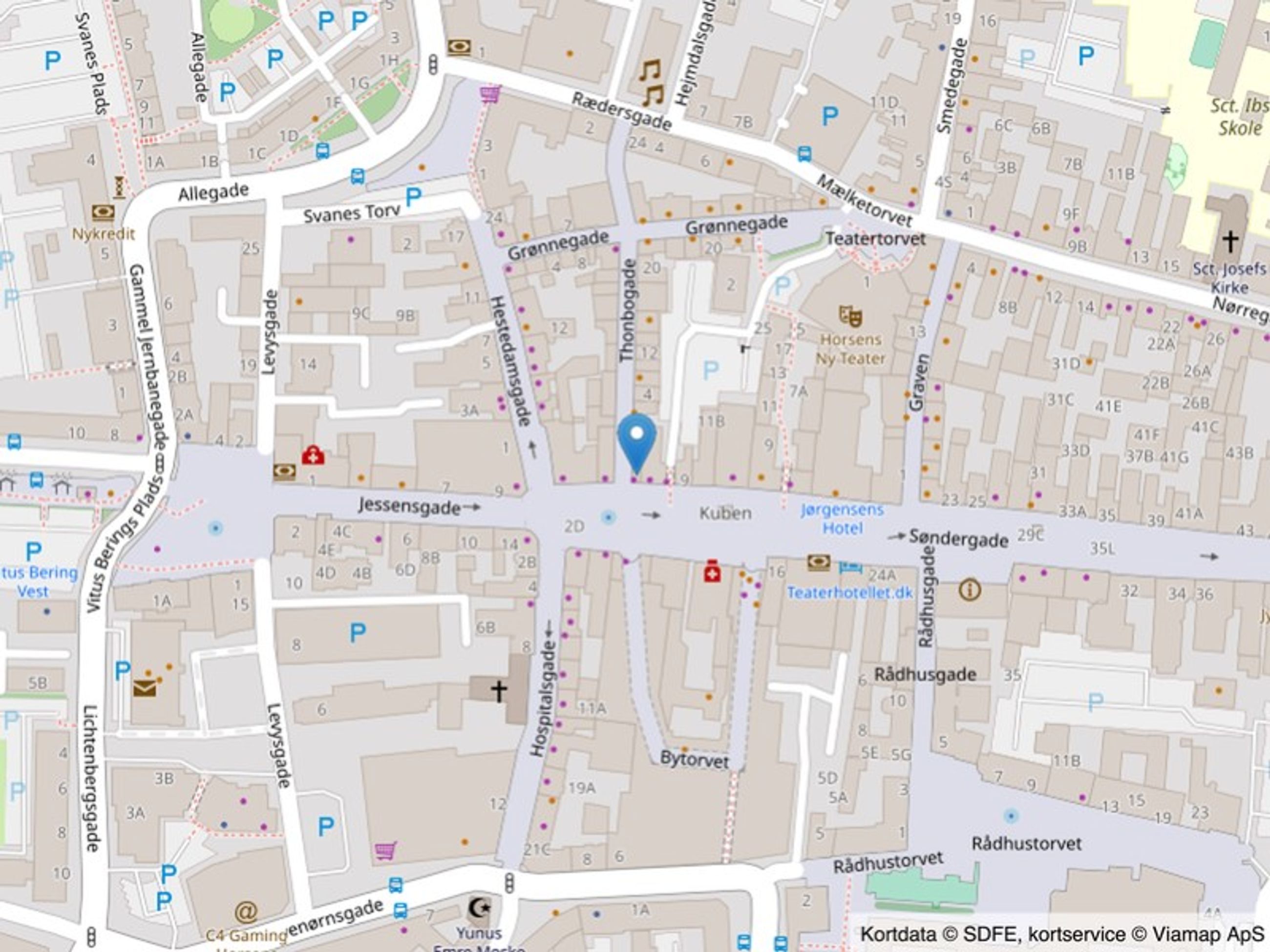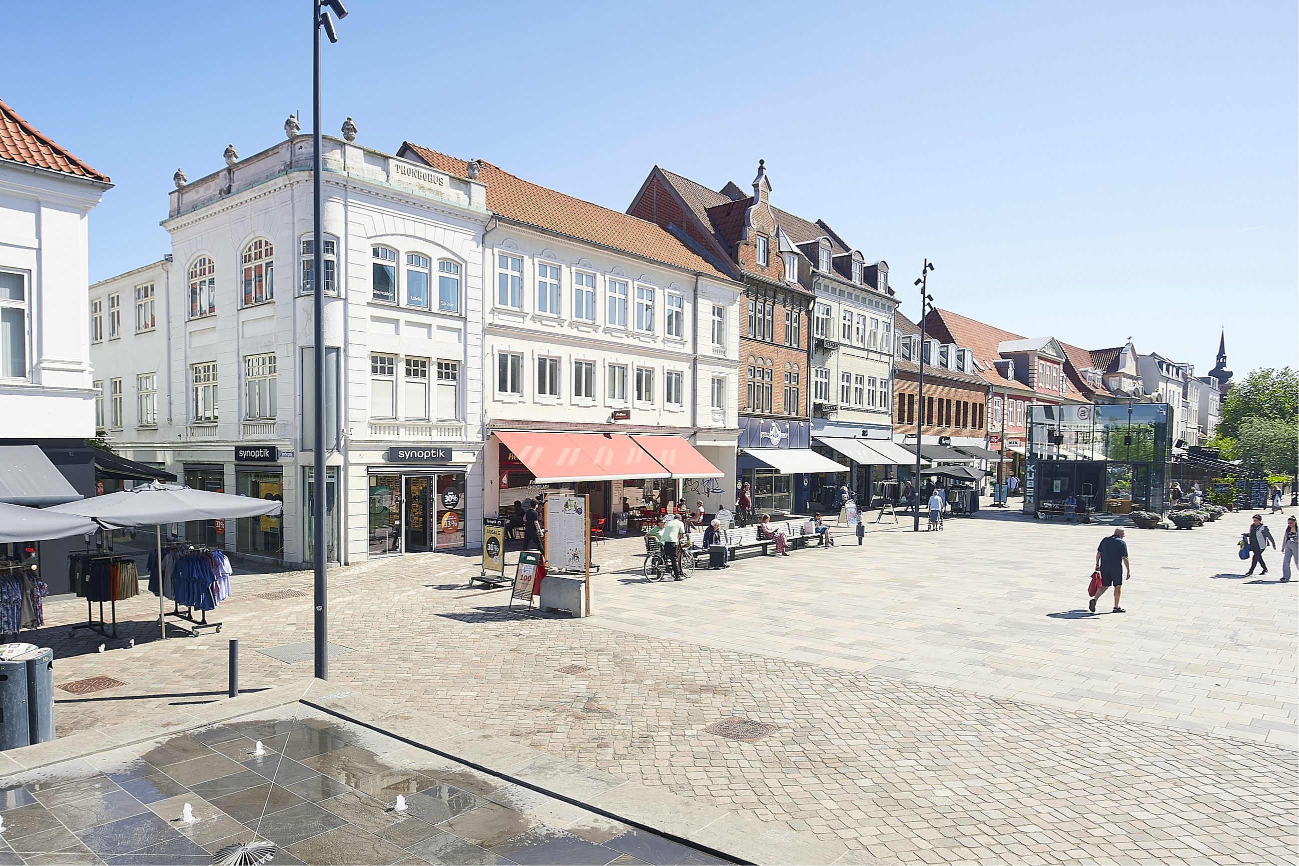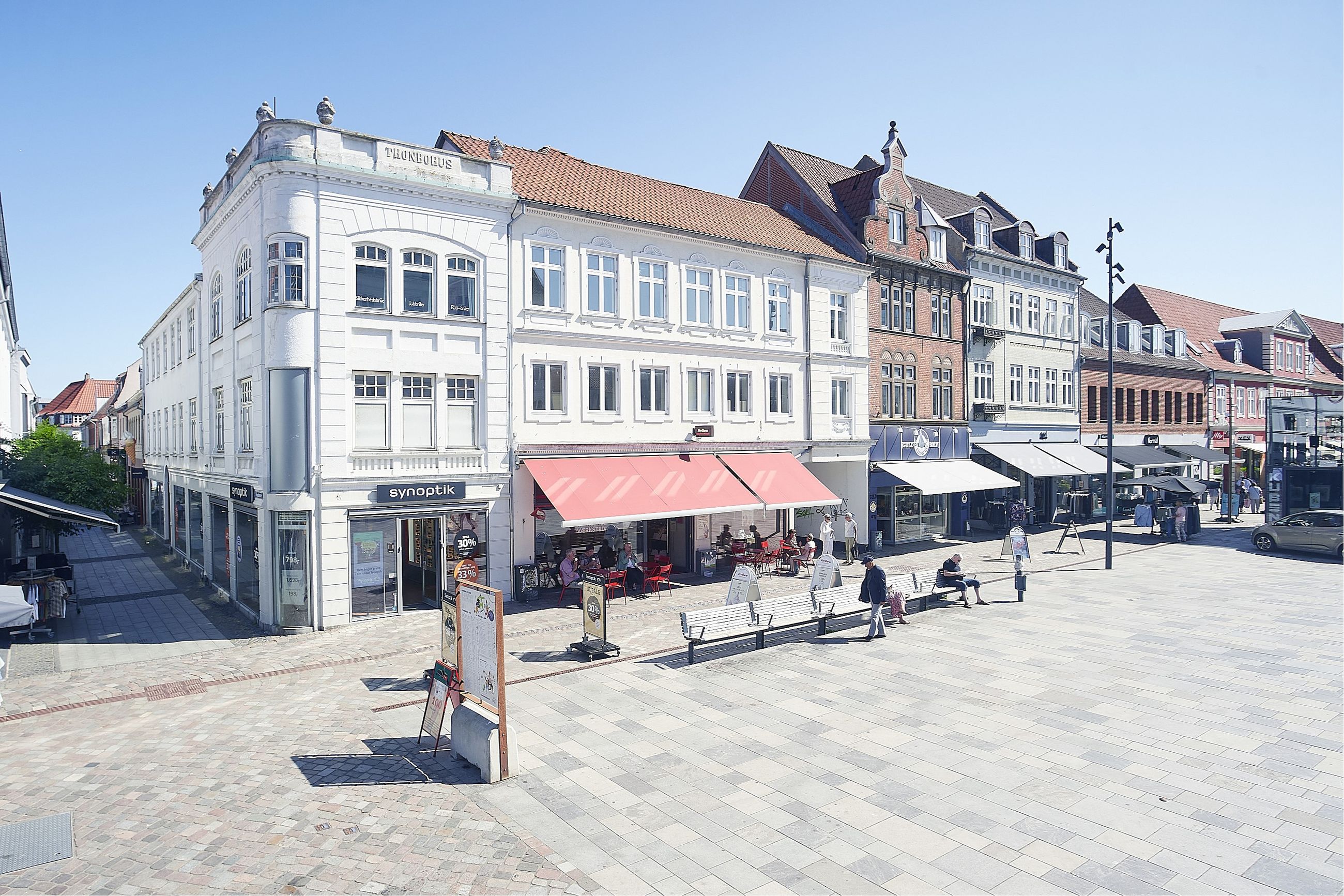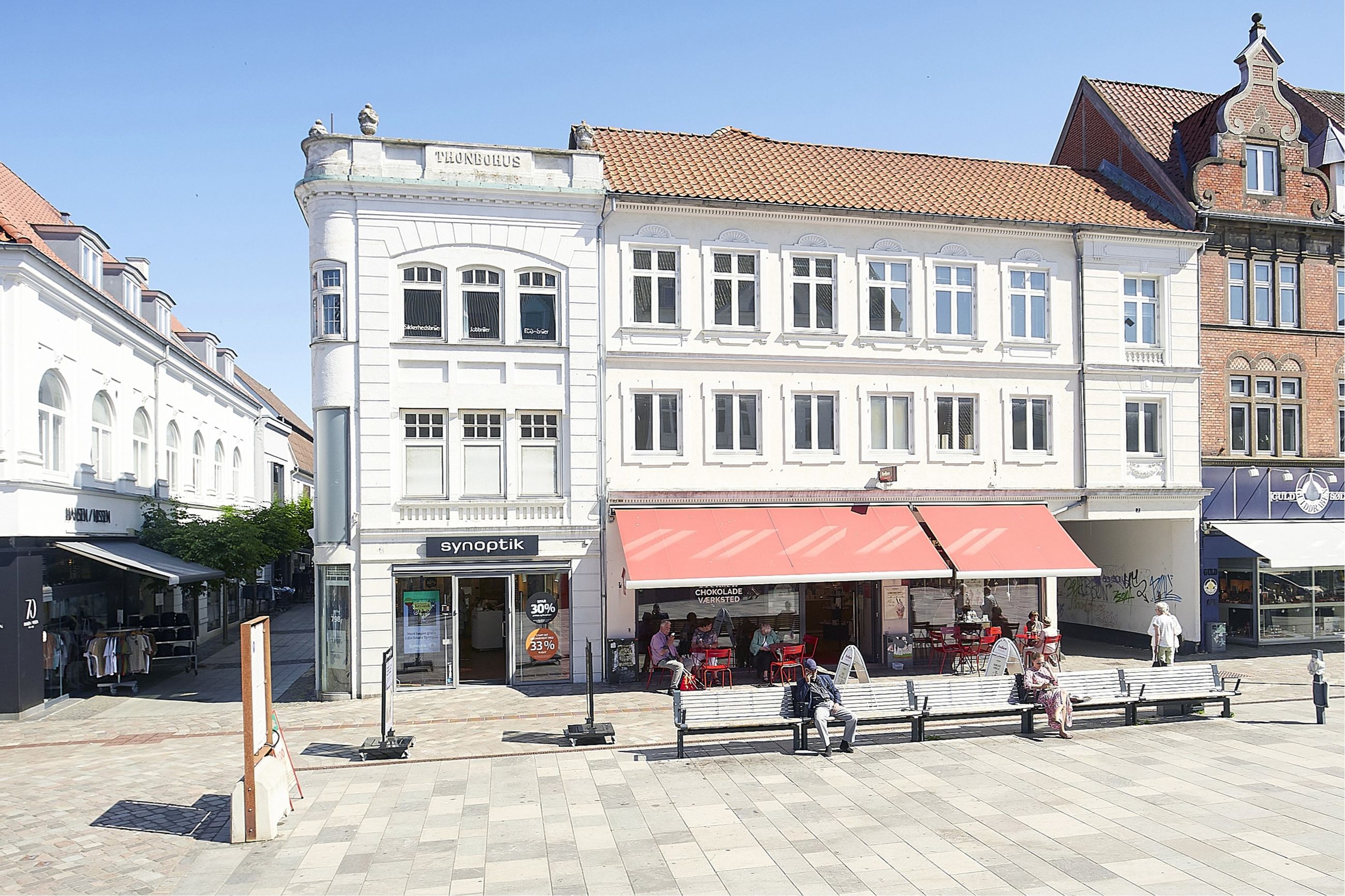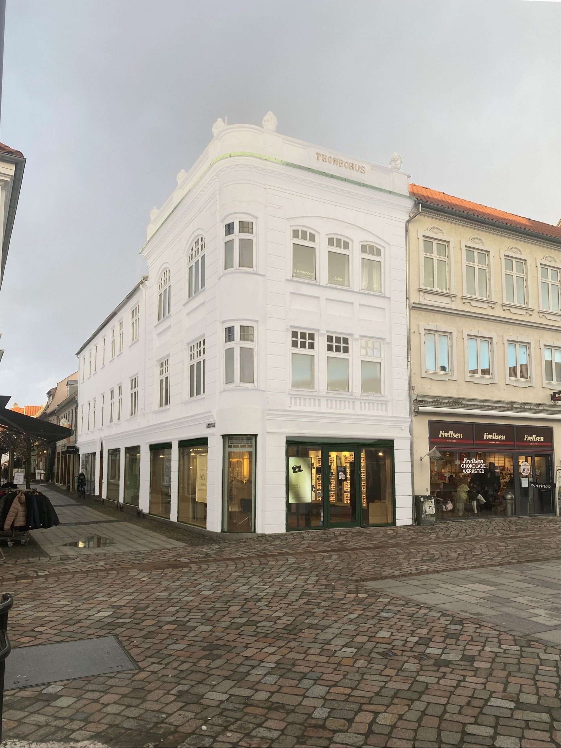 "Thonbohus" er en flot og meget markant ejendom i bybilledet og beliggende centralt på hjørnet af byens hovedgågade og indgangen til byens nye latinerkvarter med specialbutikker, restauranter m.v.