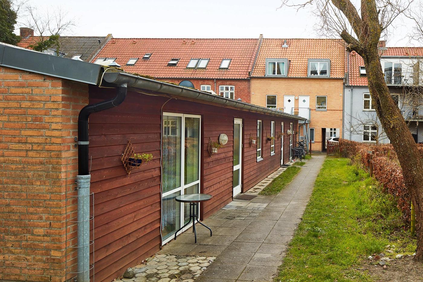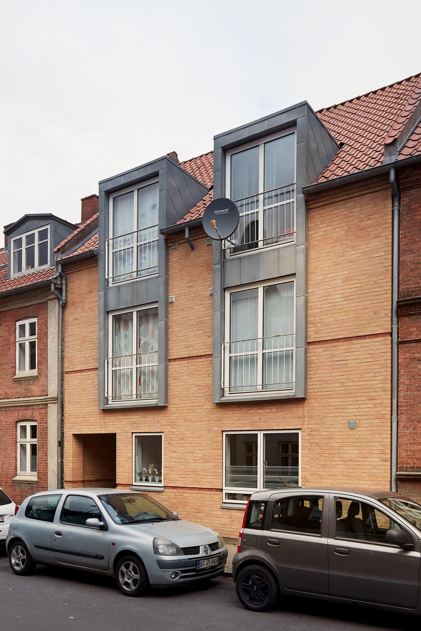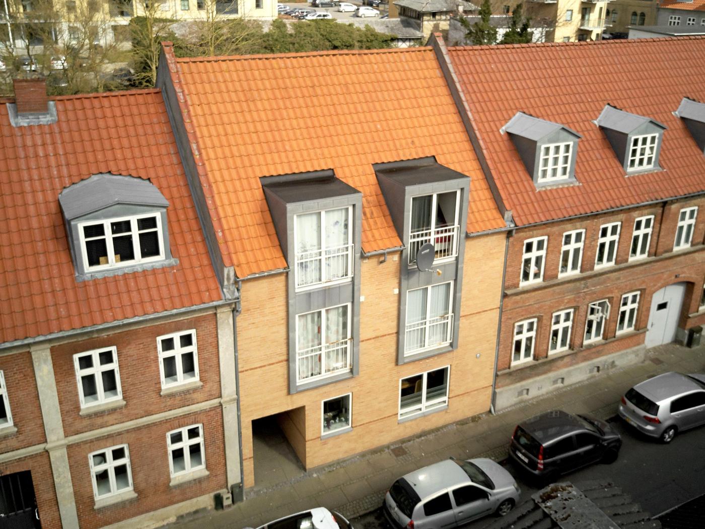 Forhus i 3 etager incl. tagetage + 20 m² kælder med fælles vaskerum og depotrum. Bygningen er opført i skalmur med tagdækning af teglsten. Bygningen indeholder 3 lejligheder, hvoraf de 2 er i 2 etager. Stuelejlighed på 56 m² indeholdende: entre, køkken, badeværelse, stue og soveværelse. Lejlighed 1./2.tv. på 66 m² indeholdende: entre, køkken, stue med trappe til tagetagen, som indeholder badeværelse og 2 værelser. Lejlighed 1./2.th. på 66 m² er indrettet som 1./2.tv. Adgang til 1.sals lejlighederne sker via udvendig trappe i gården.