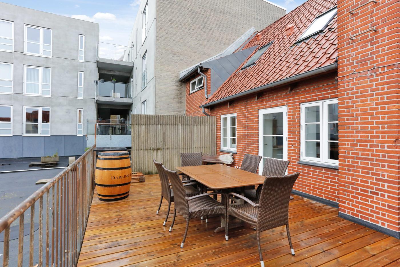 Butikslokale i stueplan er udlejet til The & Ide butik. Lokalet er yderst reelt. Der er stor glasfacade mod strøget. Indgangspartiet er belagt med flot sort naturskifer, i resten af lokalet er der lyst trægulv. Mod gårdsiden er hele bagvæggen udskiftet med glasparti ud til et hyggeligt lille gårdmiljø. Glaspartiet giver et rigtigt godt lysindfald og bidrager til at gøre lokalet lyst og venligt.