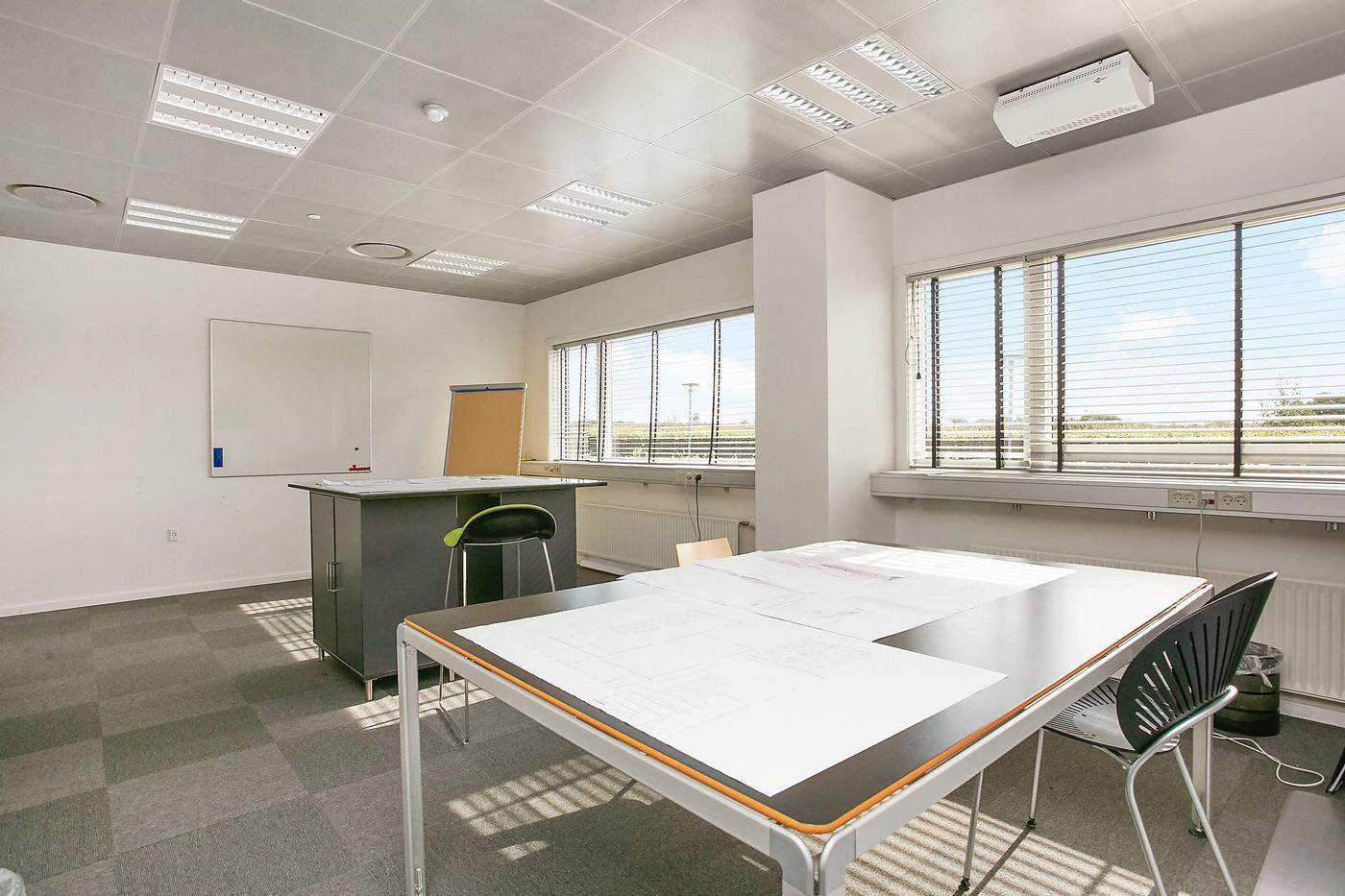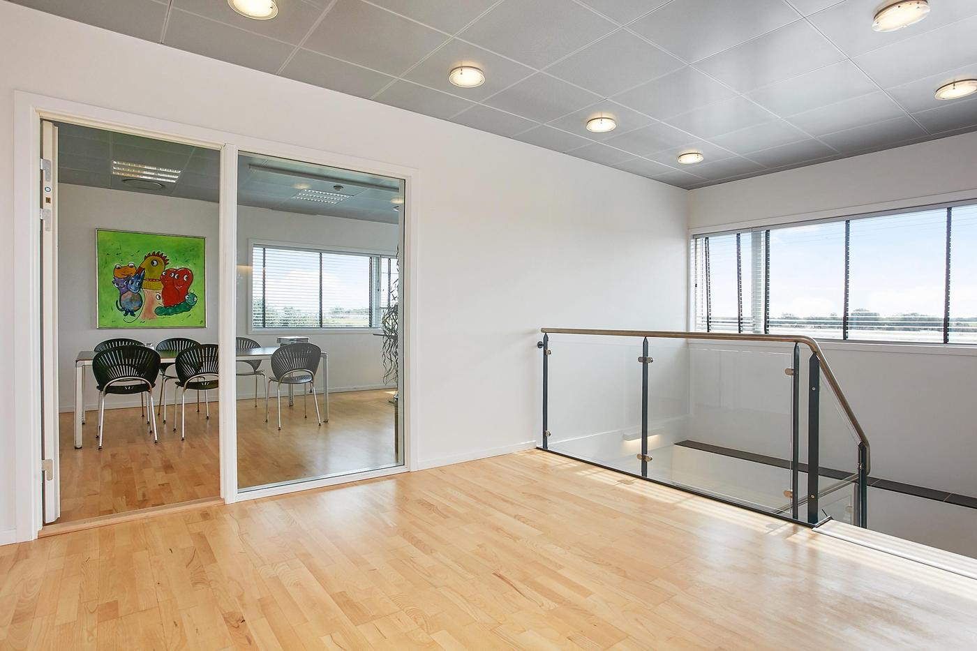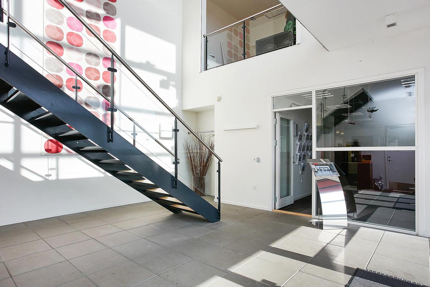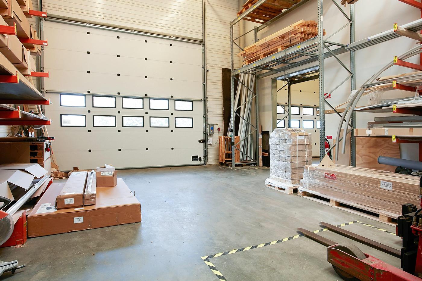 Stueplan består af: lagerhal med lofthøjde på ca. 8 m, 2 vareindleveringslokaler - hver med ca. 5 m bred og 4,5 m høj ledhejseport og hurtigport på 3 x 3 m til lagerhallen. I hallen forefindes lagerkontor og fyrrum. Kontor/velfærdsafsnit bestående af: foyer med trappe til 1.sal (fællesareal), depot/printerrum, storkontor, fordelingsgang, 6 kontorer af varierende størrelse, trapperum med toilet (fællesareal). Værkførerkontor, omklædning/bad, og 2 toiletter (fællesareal). 1.sal består af: showroom, fordelingsgang, 6 kontorer af varierende størrelse, trapperum. Trapperum ved opgangen fra foyer (fællesareal), fælles kantine med udgang til ca. 10 m² tagterrasse