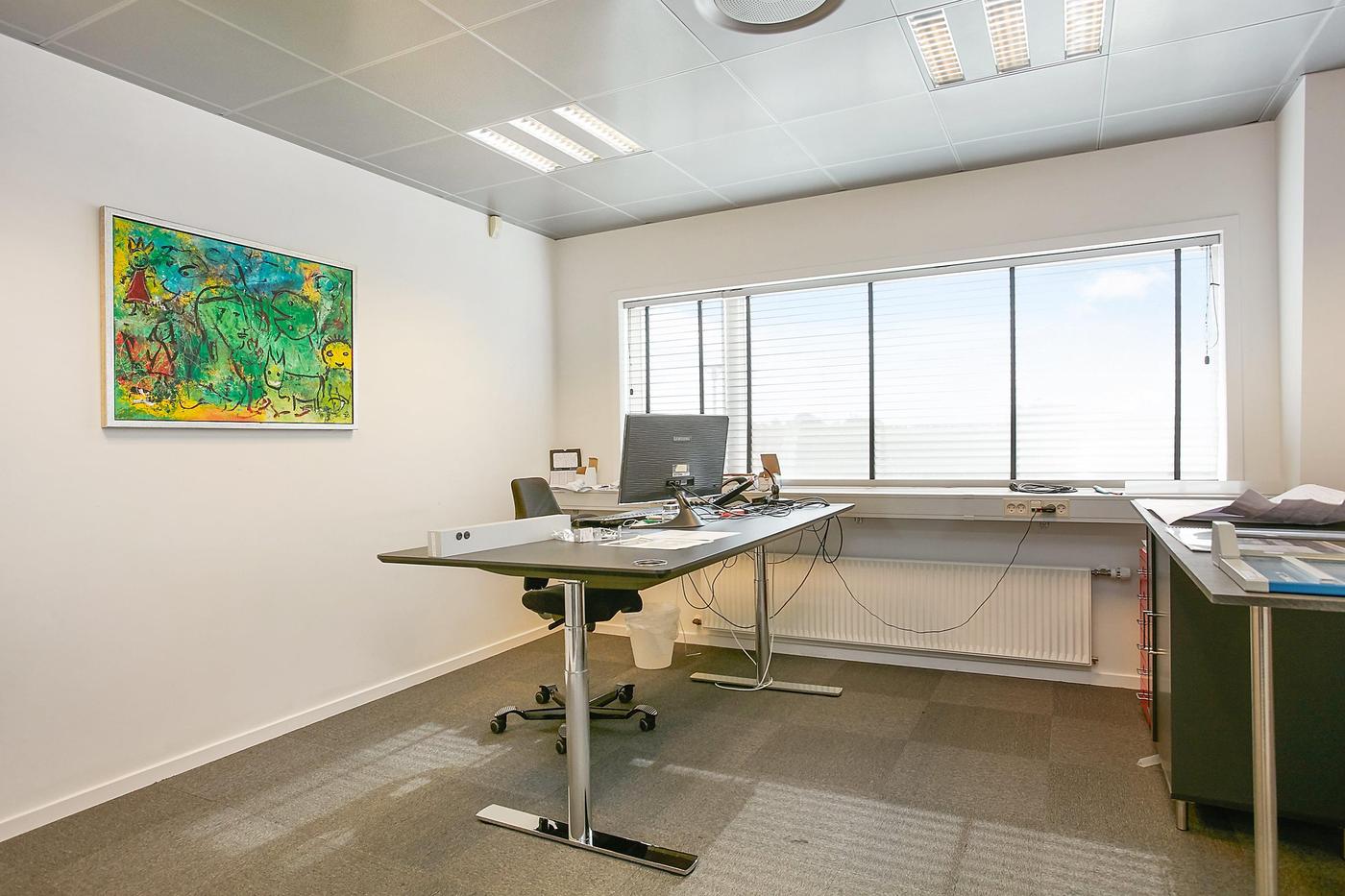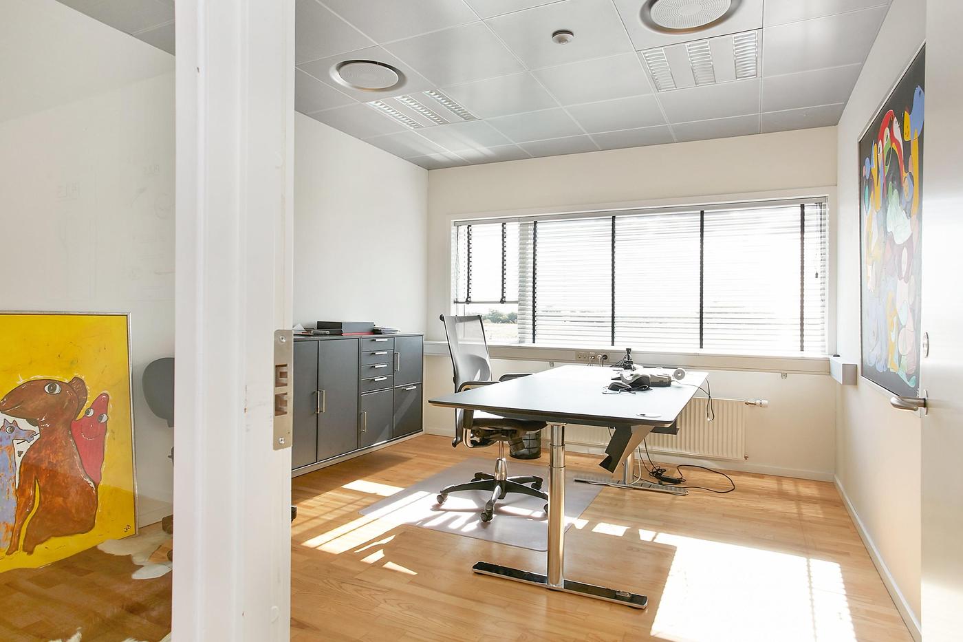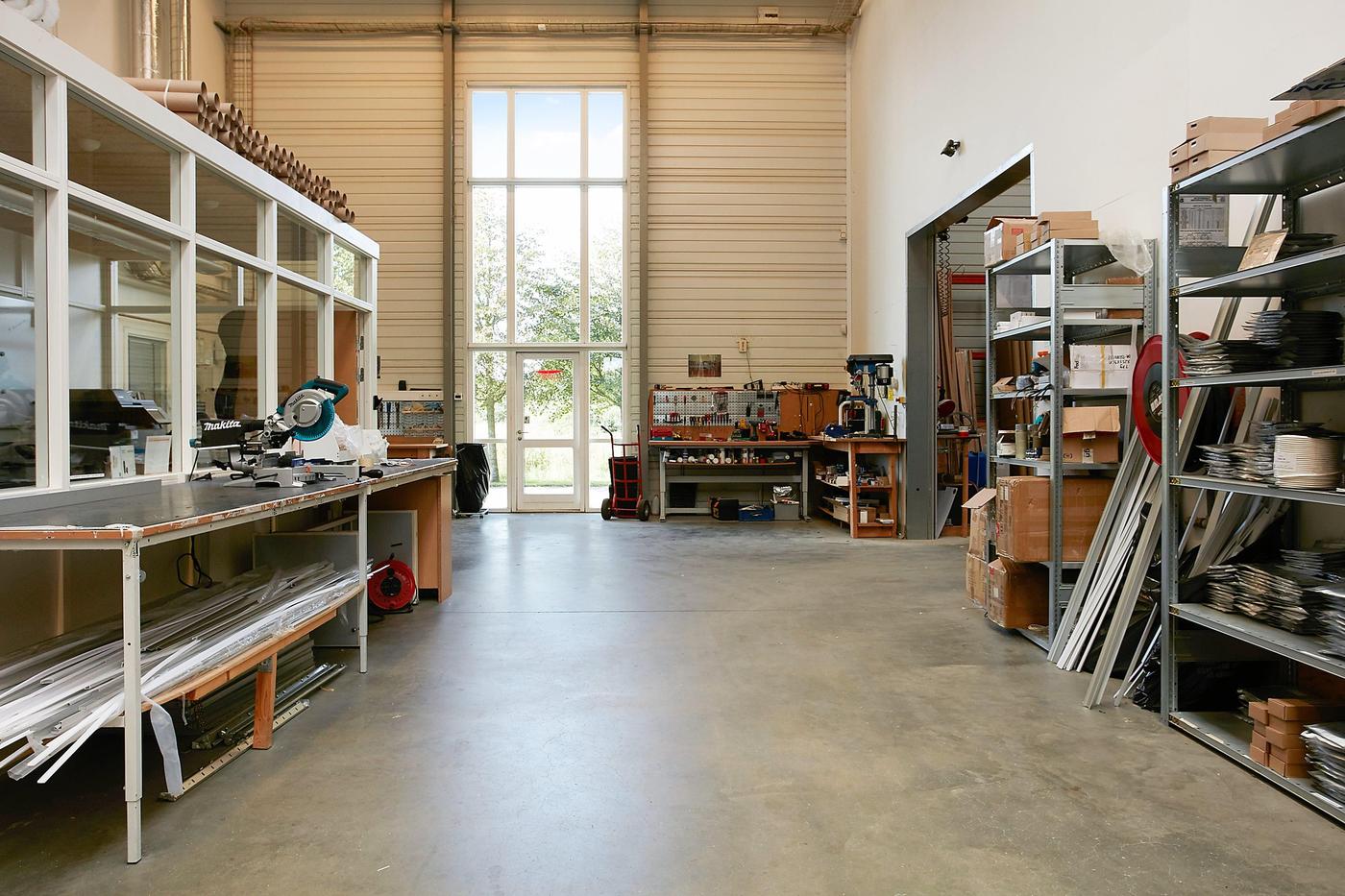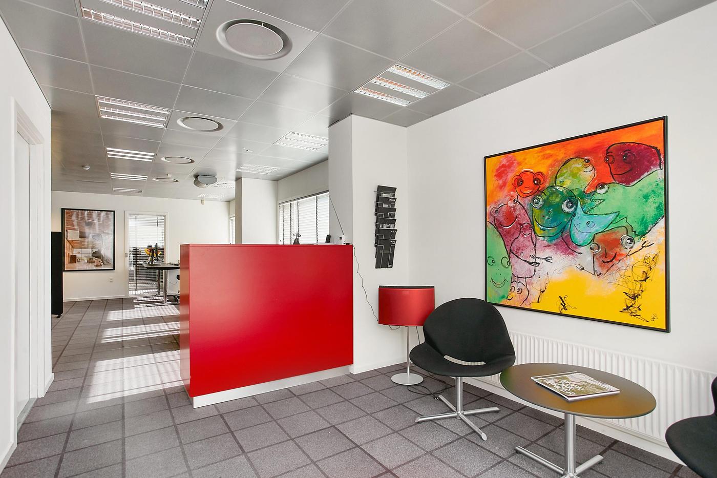 Stueplan består af: lagerhal med lofthøjde på ca. 8 m, 2 vareindleveringslokaler - hver med ca. 5 m bred og 4,5 m høj ledhejseport og hurtigport på 3 x 3 m til lagerhallen. I hallen forefindes lagerkontor og fyrrum. Kontor/velfærdsafsnit bestående af: foyer med trappe til 1.sal (fællesareal), depot/printerrum, storkontor, fordelingsgang, 6 kontorer af varierende størrelse, trapperum med toilet (fællesareal). Værkførerkontor, omklædning/bad, og 2 toiletter (fællesareal). 1.sal består af: showroom, fordelingsgang, 6 kontorer af varierende størrelse, trapperum. Trapperum ved opgangen fra foyer (fællesareal), fælles kantine med udgang til ca. 10 m² tagterrasse