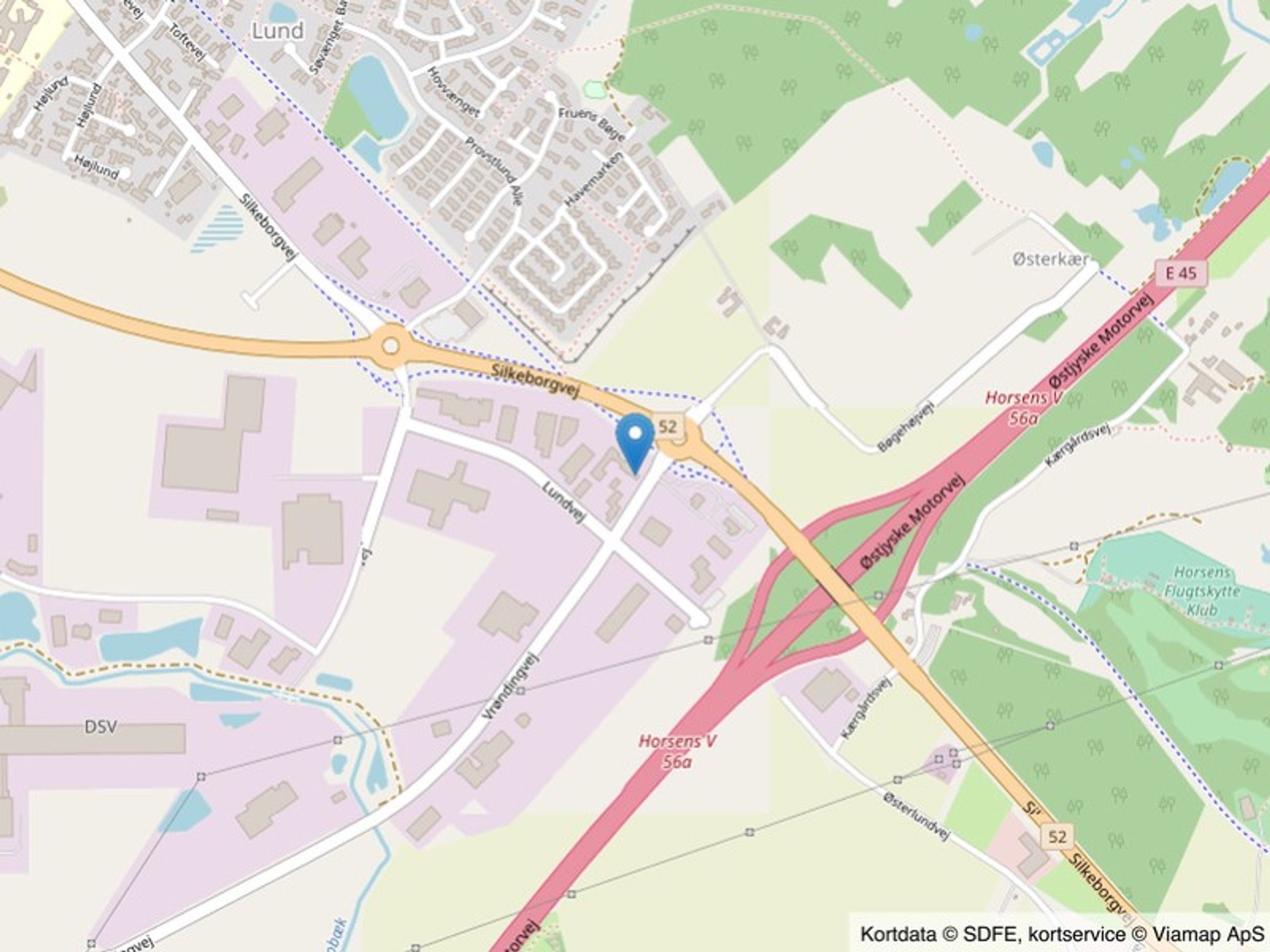 Velbeliggende lige ved rundkørslen ved motorvejstilslutning Horsens V og kun ca. 300 m herfra. Lejemålet har dog ikke synlighed fra denne, men fra Vrøndingvej/Silkeborgvej. Der er ca. 5 km til Horsens midtby.