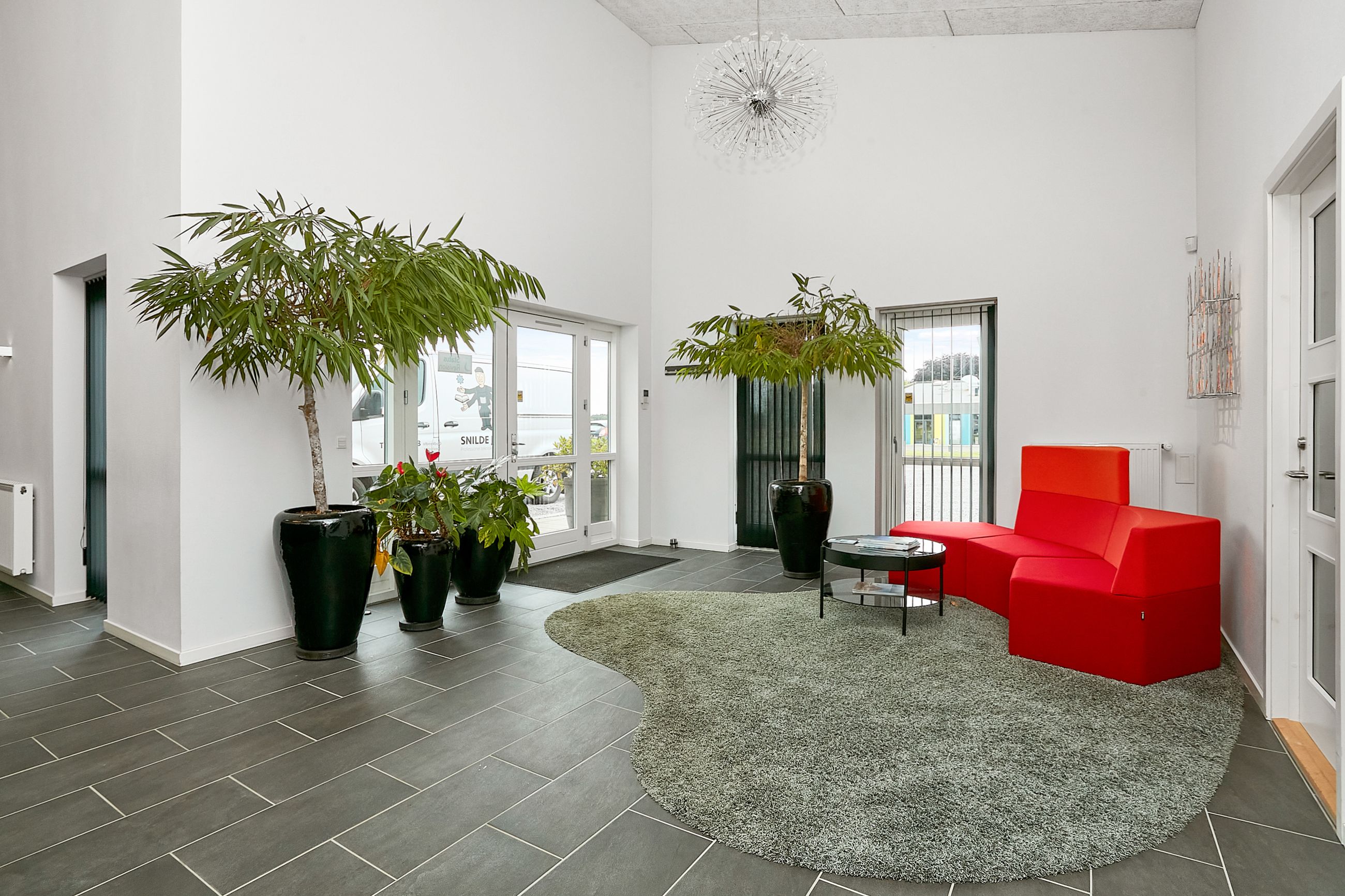 Stort receptionsområde med klinkegulv og stilrent udtryk.