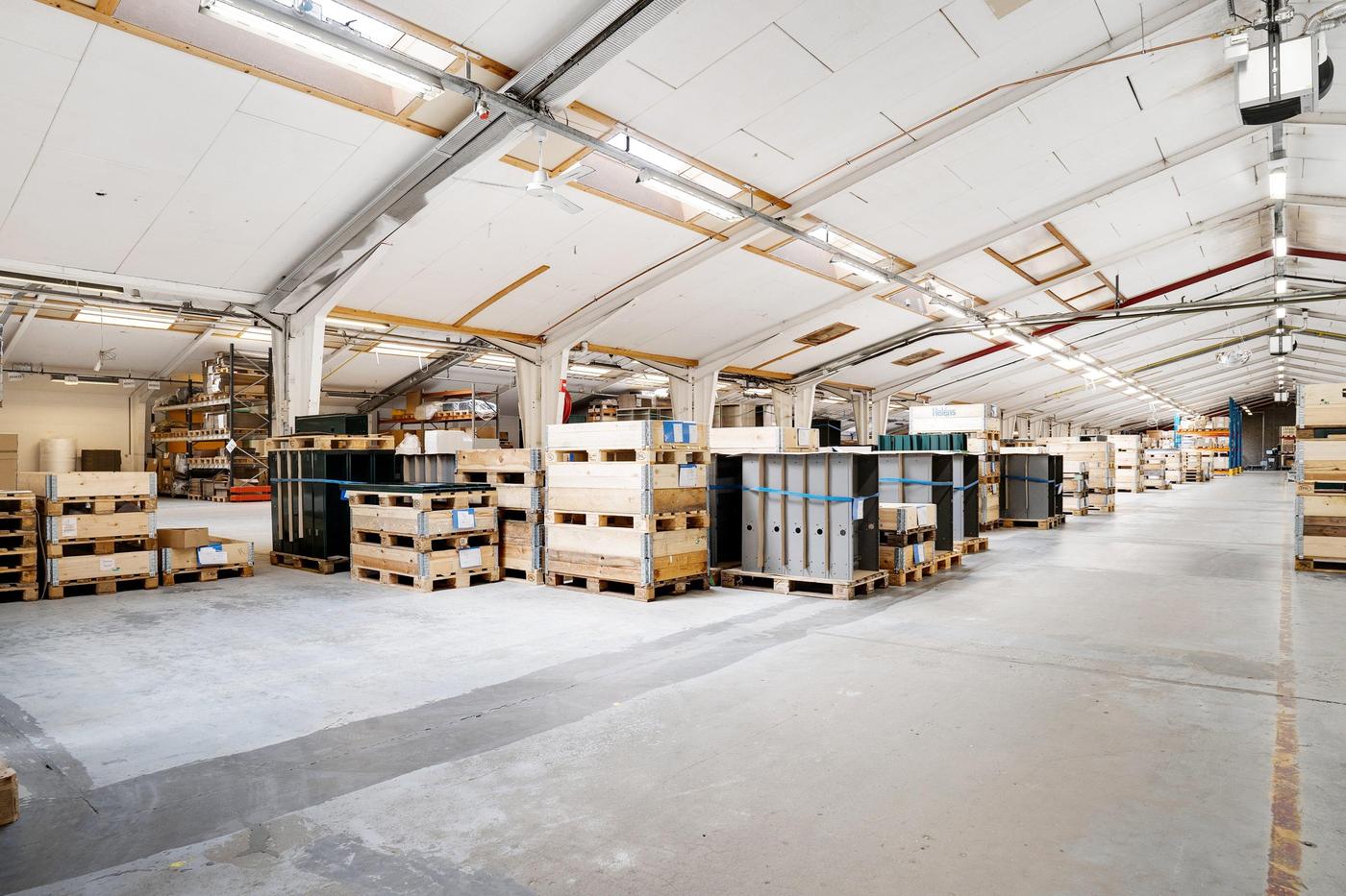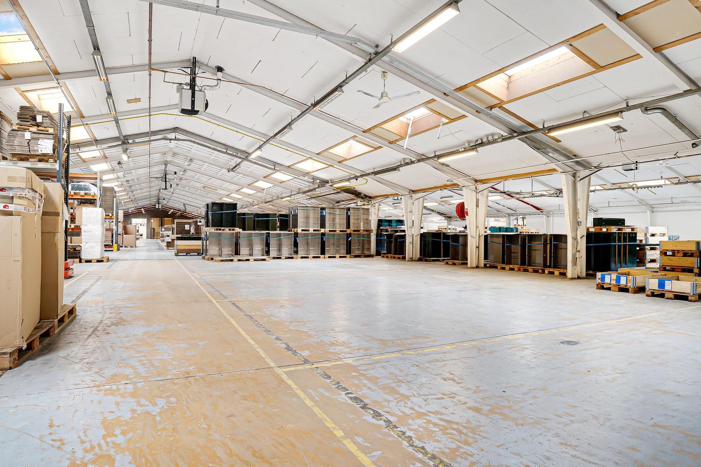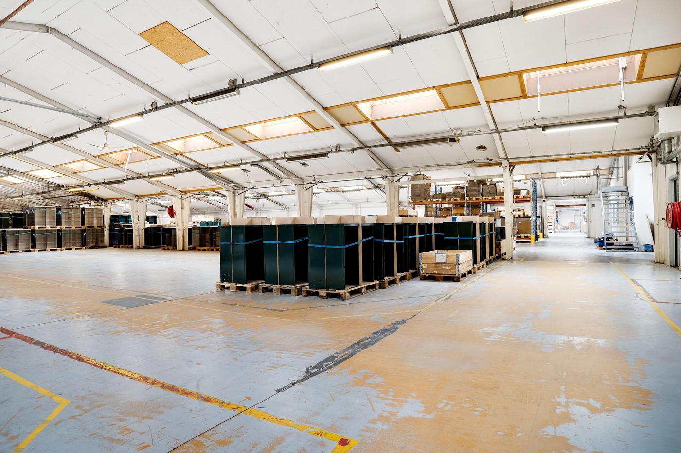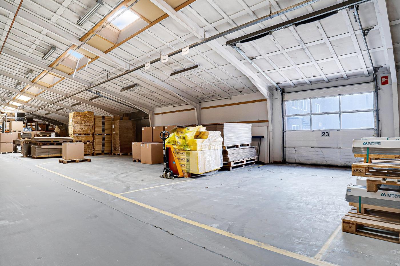 Lagerområdet kan være på op til 1.000 m² og er beliggende i ejendommens bygning 1, der er en del af en større produktionsejendom. Det er et relativt åbent område, som efter aftale med udlejer kan lukkes mere eller mindre af. Loftshøjden er blandet fra lav til høj, da loftet er opført i V-konstruktion. Fra lagerområdet er der relativ let adgang til aflæsningsramperne.