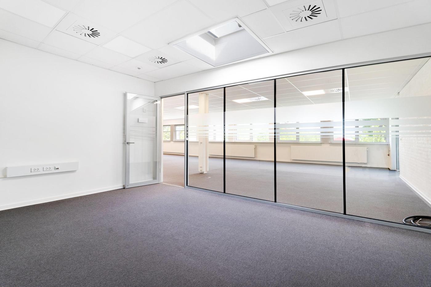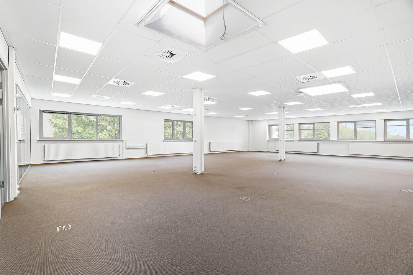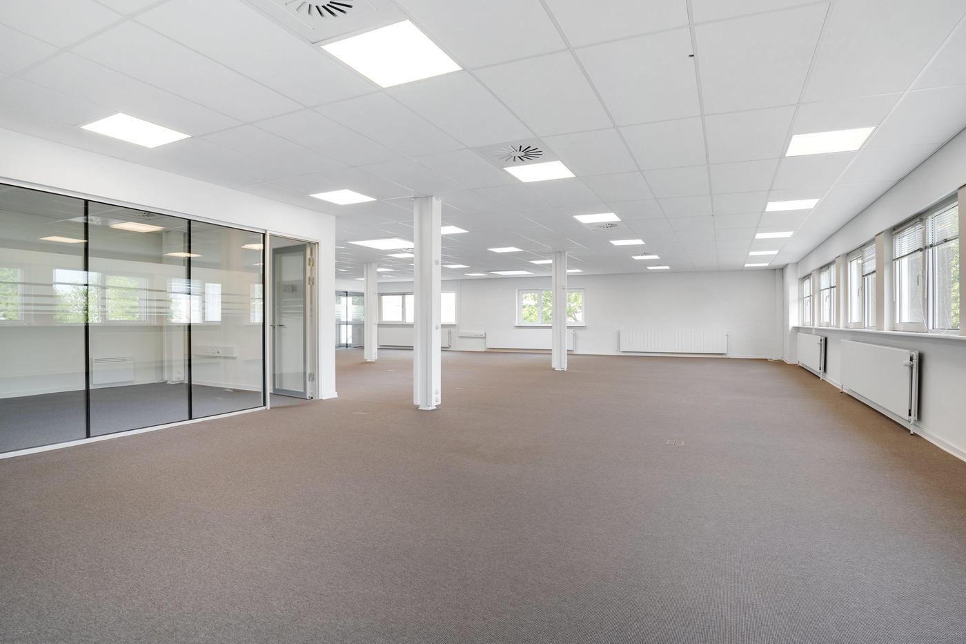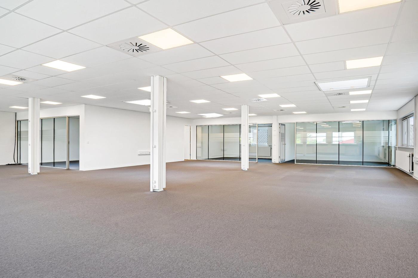 Kontordelen udgør 380 m² og er beliggende på førstesal i ejendommens bygning 2. Arealet er indrettet til storrumskontor med 3 tilhørende kontorer eller mødelokaler, som afgrænses af et glasparti. Der forefindes desuden egne toiletfaciliteter til kontoret samt elevator til brug for gods og handicap. Det bemærkes, at kontordelen ikke er beliggende i forlængelse af lageret.