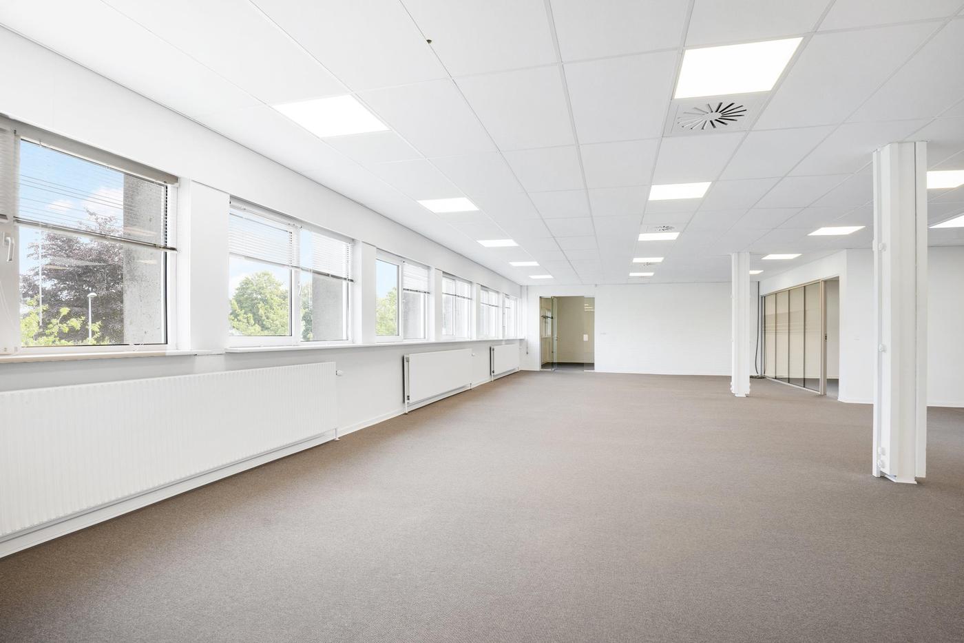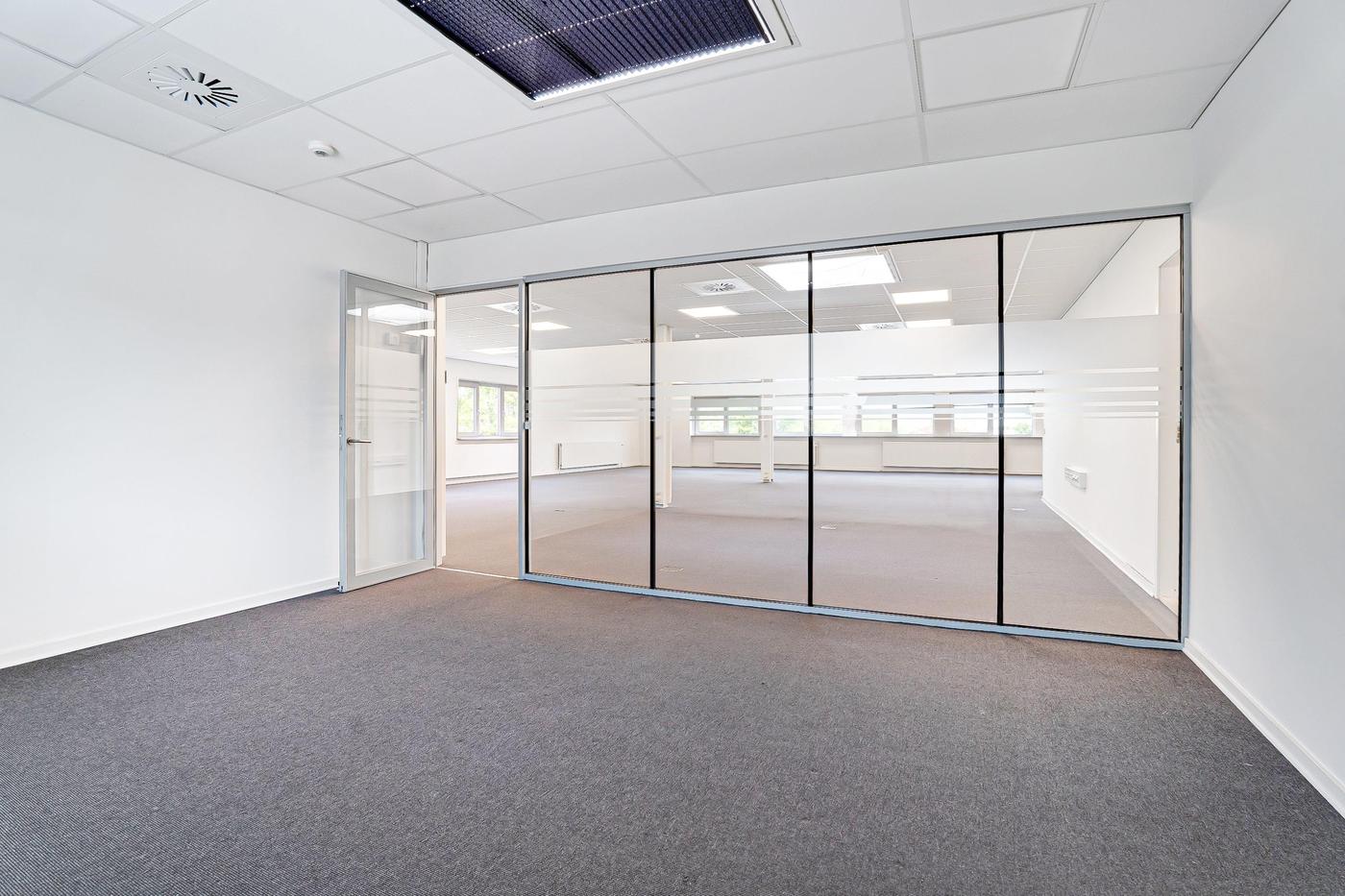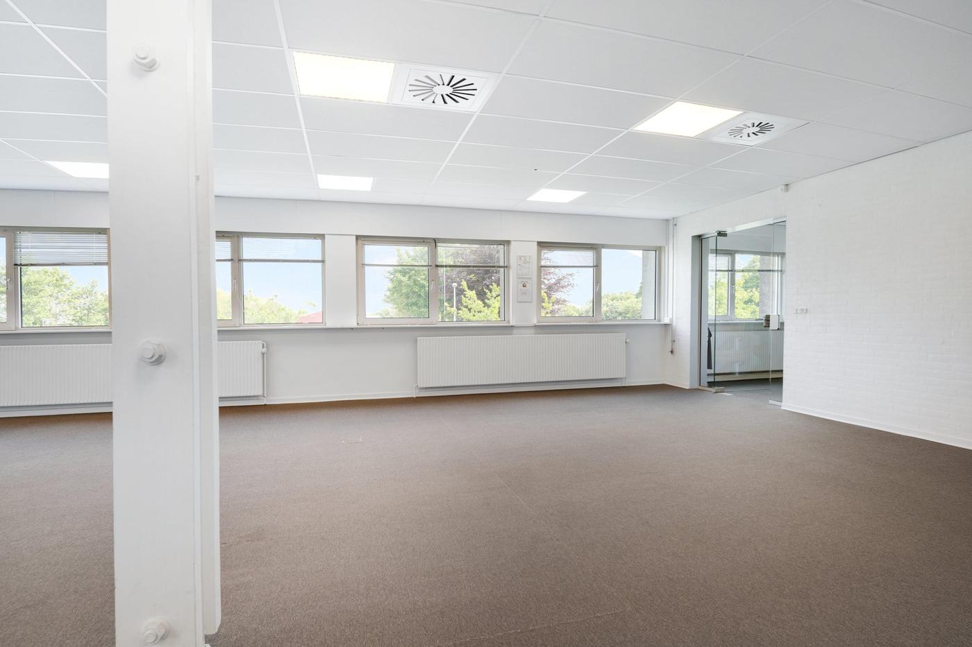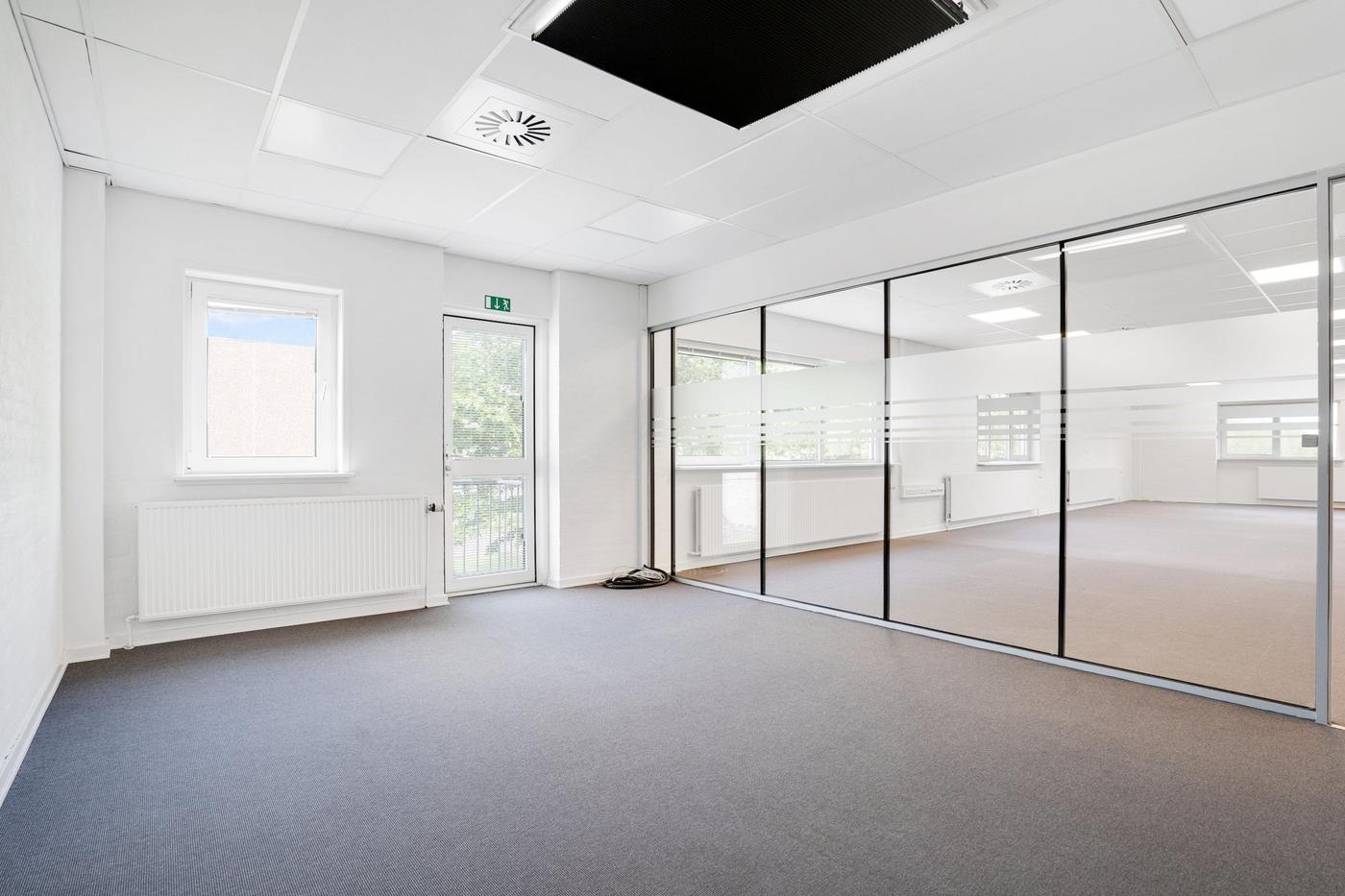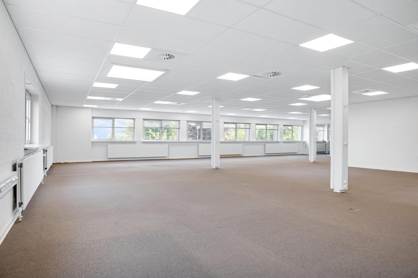 Kontordelen udgør 380 m² og er beliggende på førstesal i ejendommens bygning 2. Arealet er indrettet til storrumskontor med 3 tilhørende kontorer eller mødelokaler, som afgrænses af et glasparti. Der forefindes desuden egne toiletfaciliteter til kontoret samt elevator til brug for gods og handicap. Det bemærkes, at kontordelen ikke er beliggende i forlængelse af lageret.