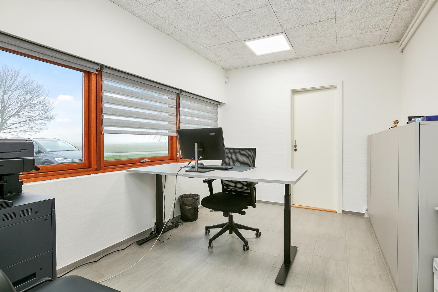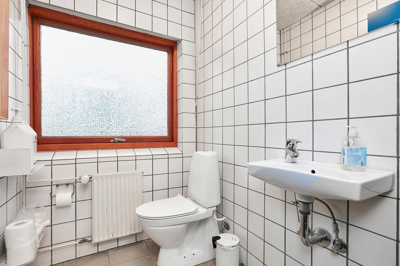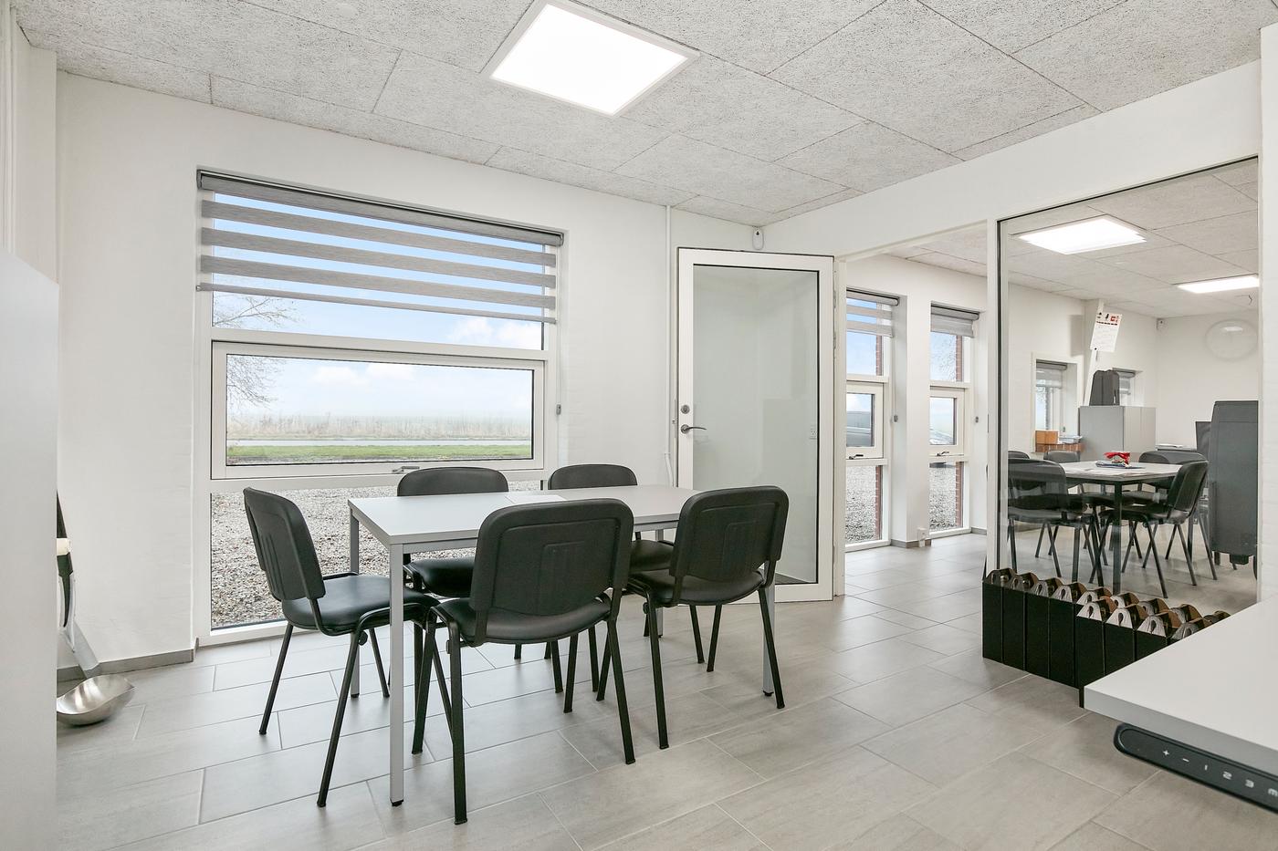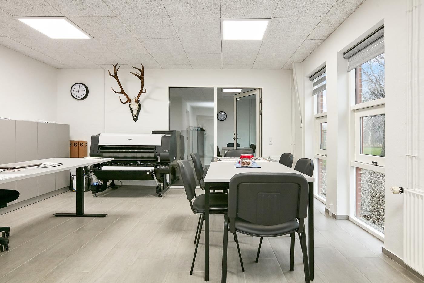 Kontordelen opvarmes med radiatorvarme samt udgør 82 m² og fremstår nyistandsat med pæne grå klinkegulve og et moderne velholdt udtryk, velegnet til administration og ledelse.