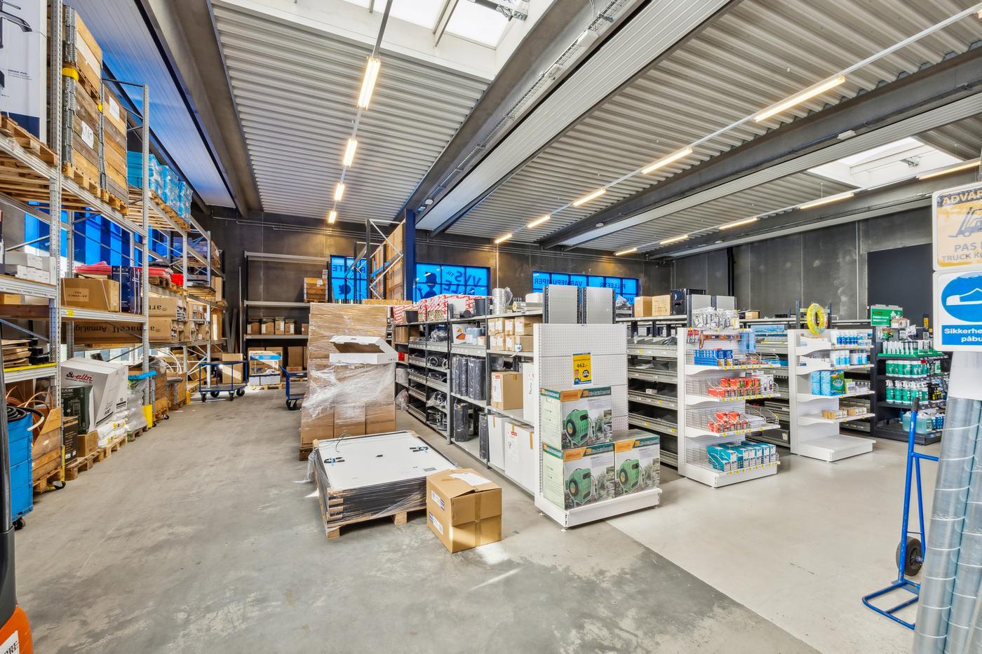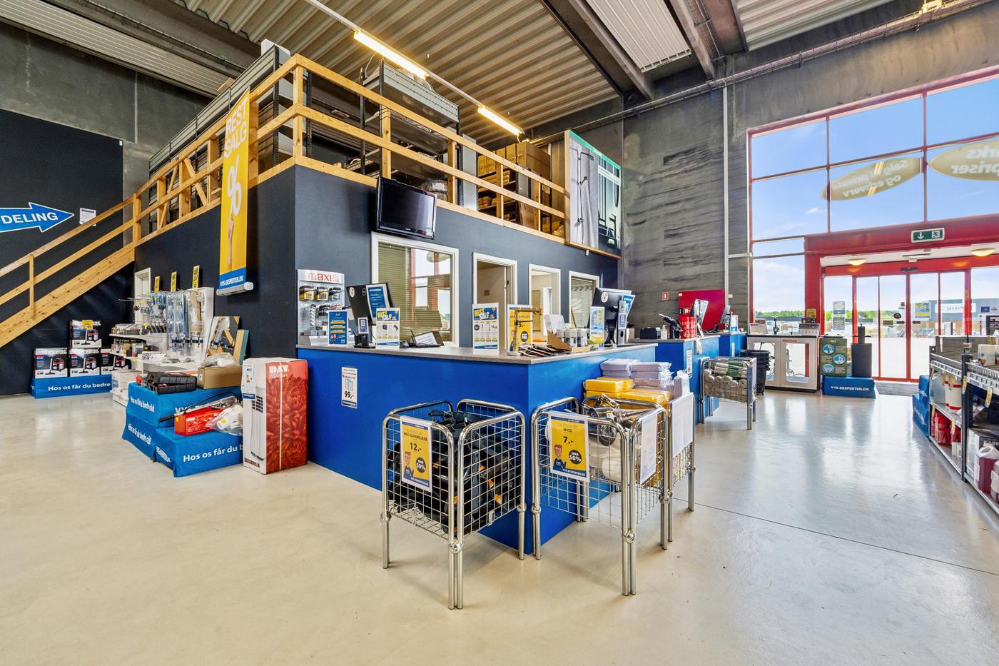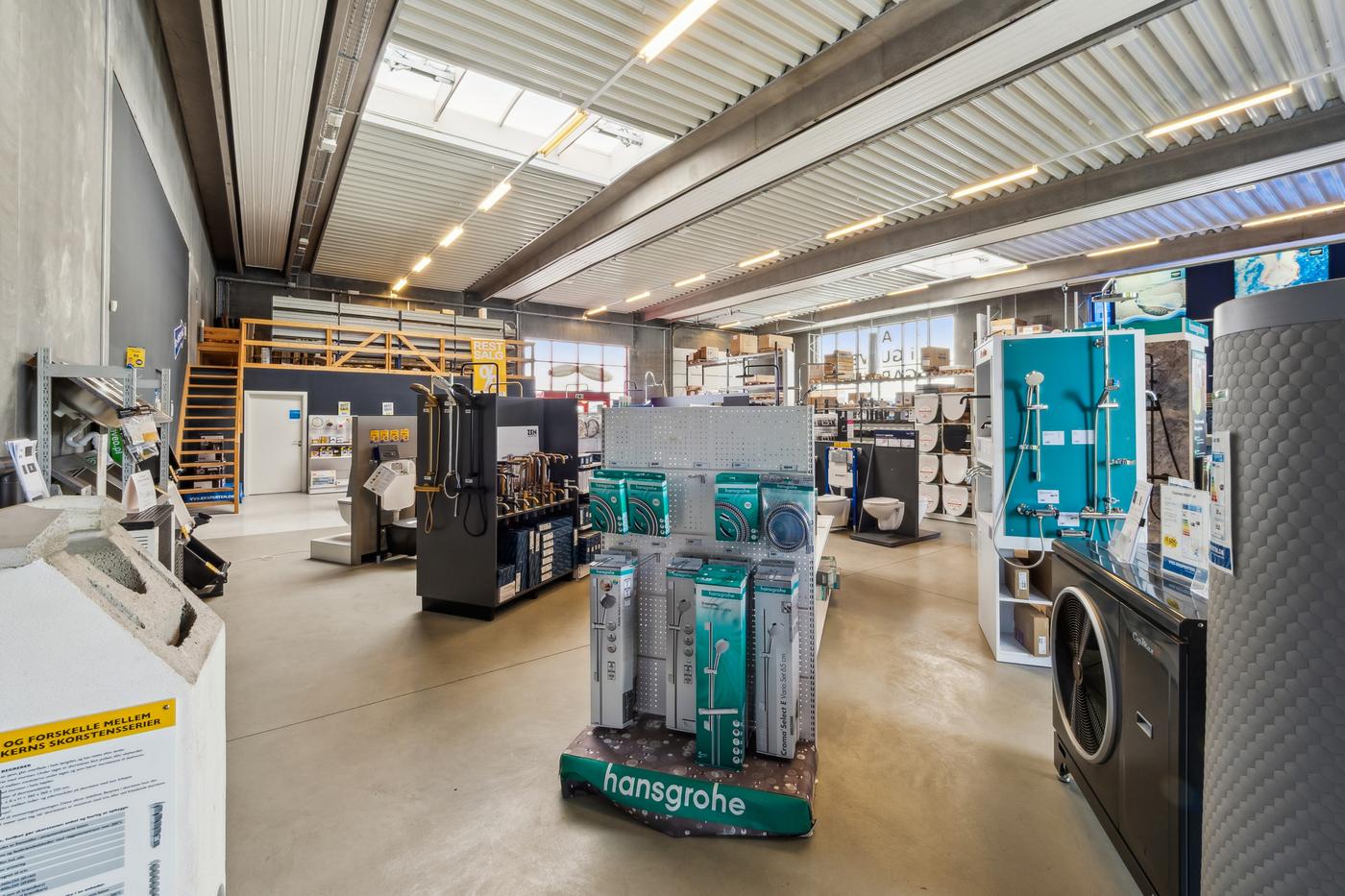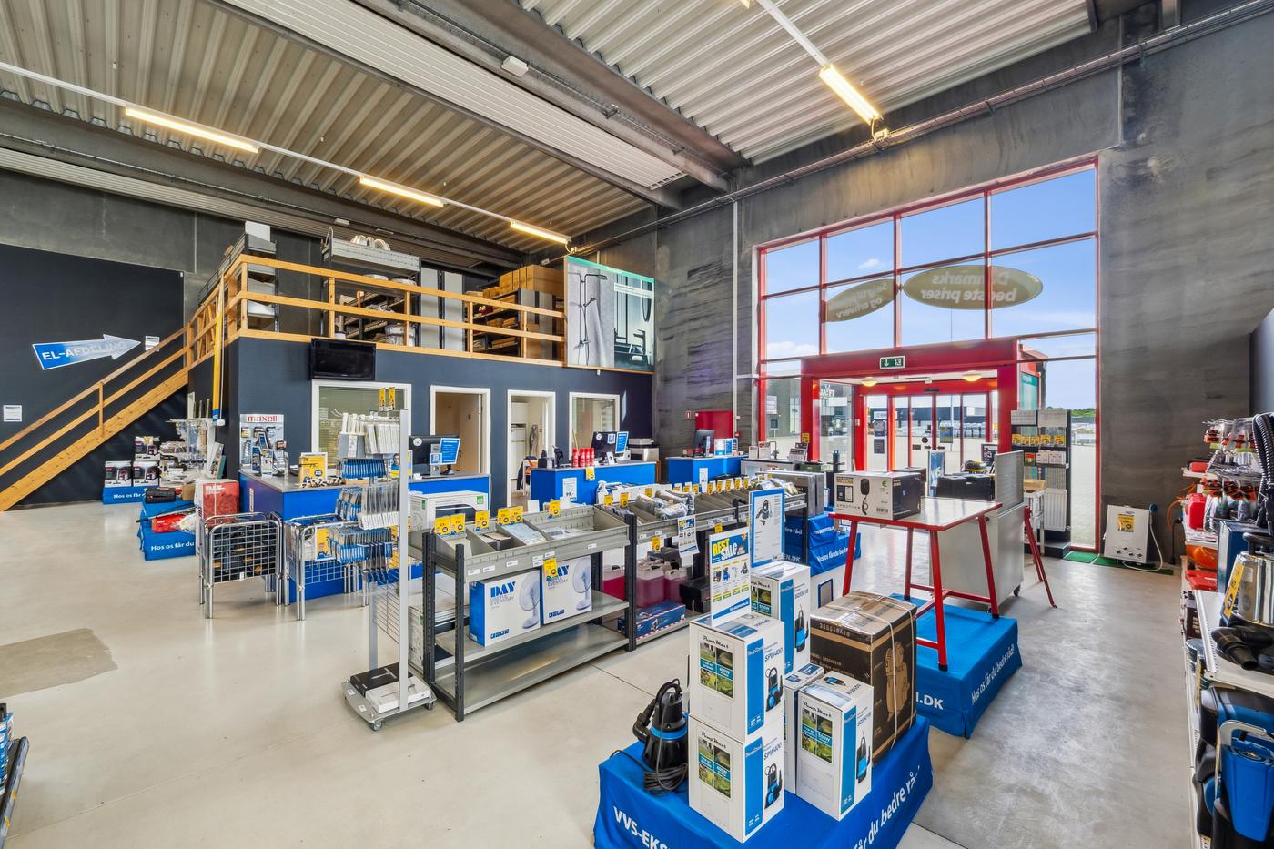 Indretning: indgangsparti med adgang til rektangulært forretningslokale med adgang til mindre kontor- og personaleafsnit med frokostrum, kontor, toilet og teknikrum. Loftshøjde ca. 6 meter under spær. Gulvet er malet betongulv.